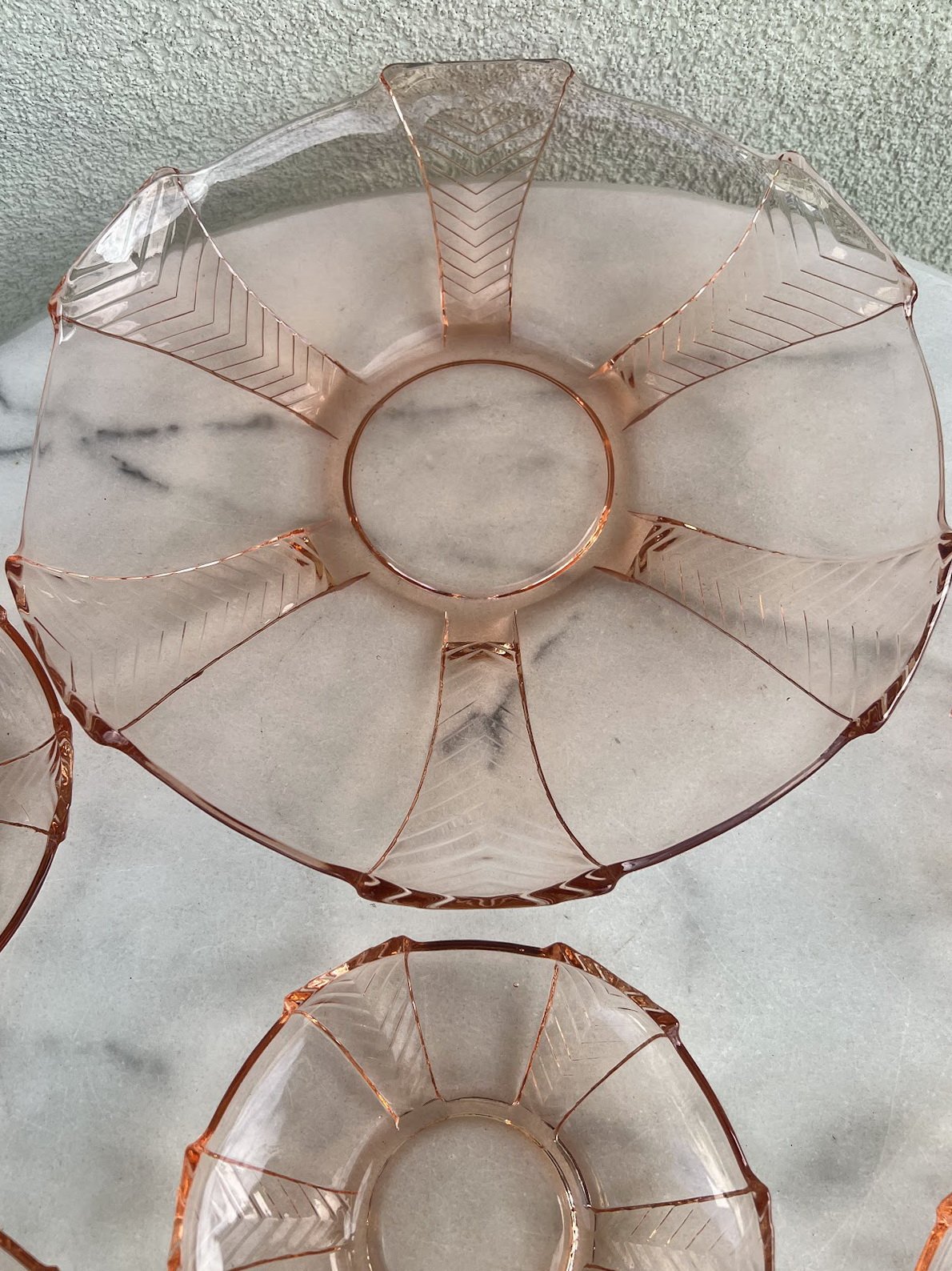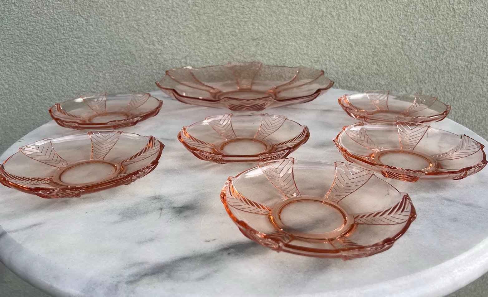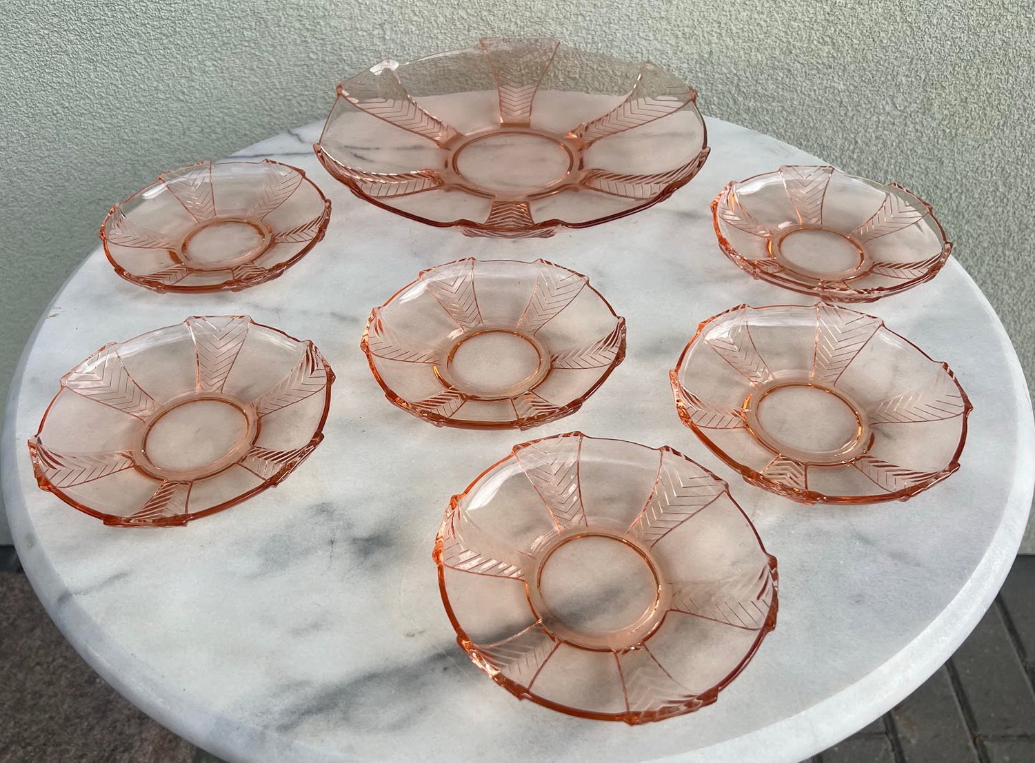 Desertų, vaisių serviravimo rinkinys, antikvarinis, tarpukario laikų, Art Deco stiliaus, rožinio stiklo. Centrinės lėkštės skersmuo 29, mažesnių – 15 cm. Kaina 73 už viską. Rinkinys rastas Kaune, priklausė kunigui J. Fabijanskui.