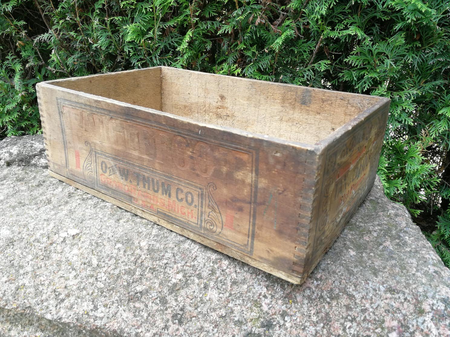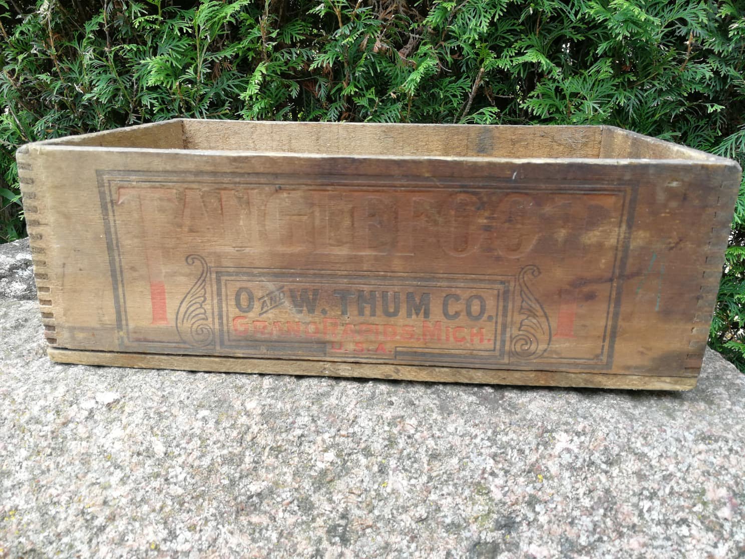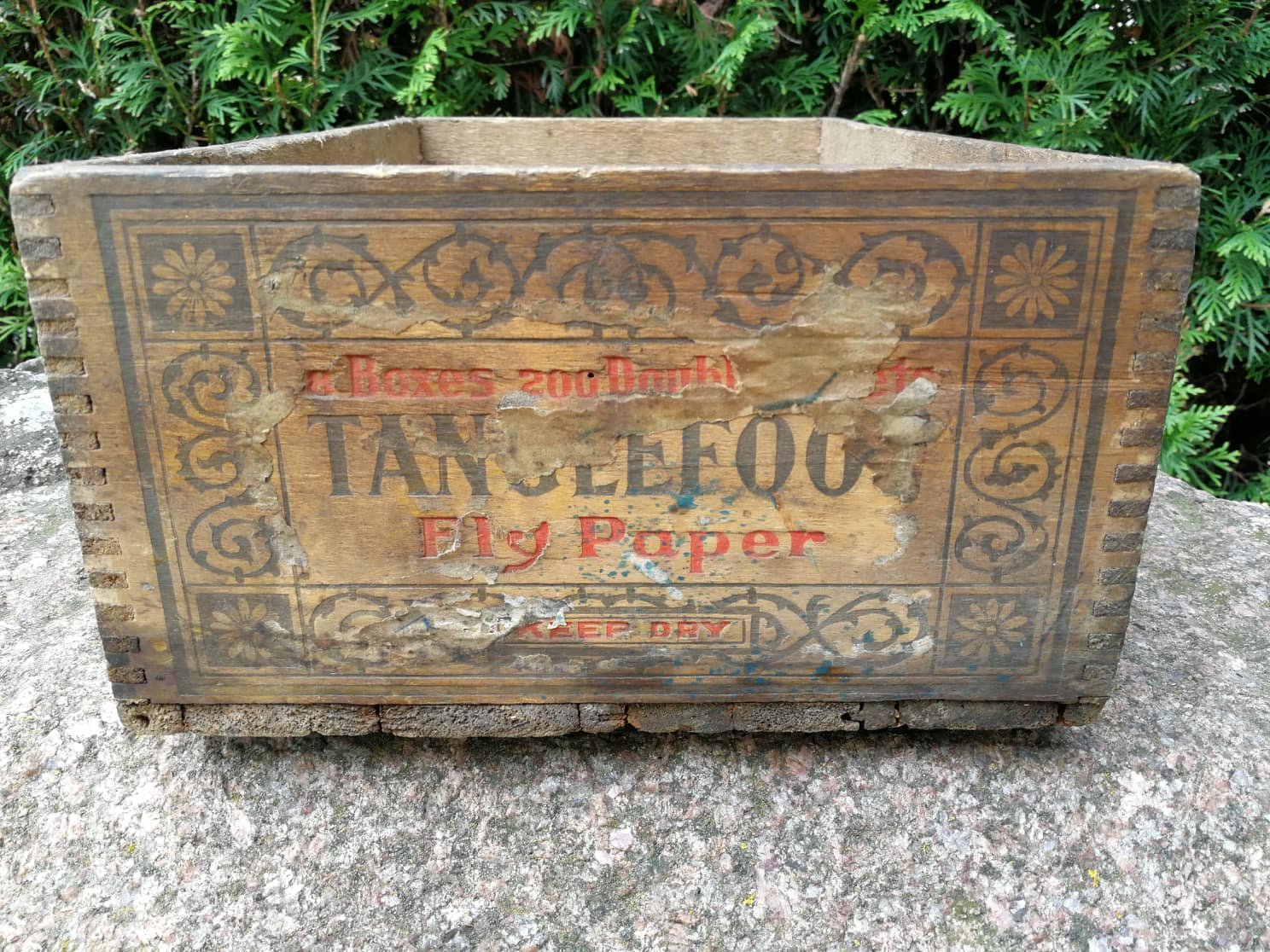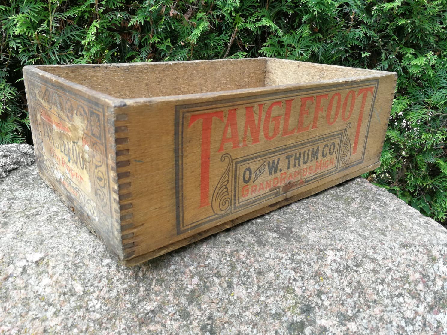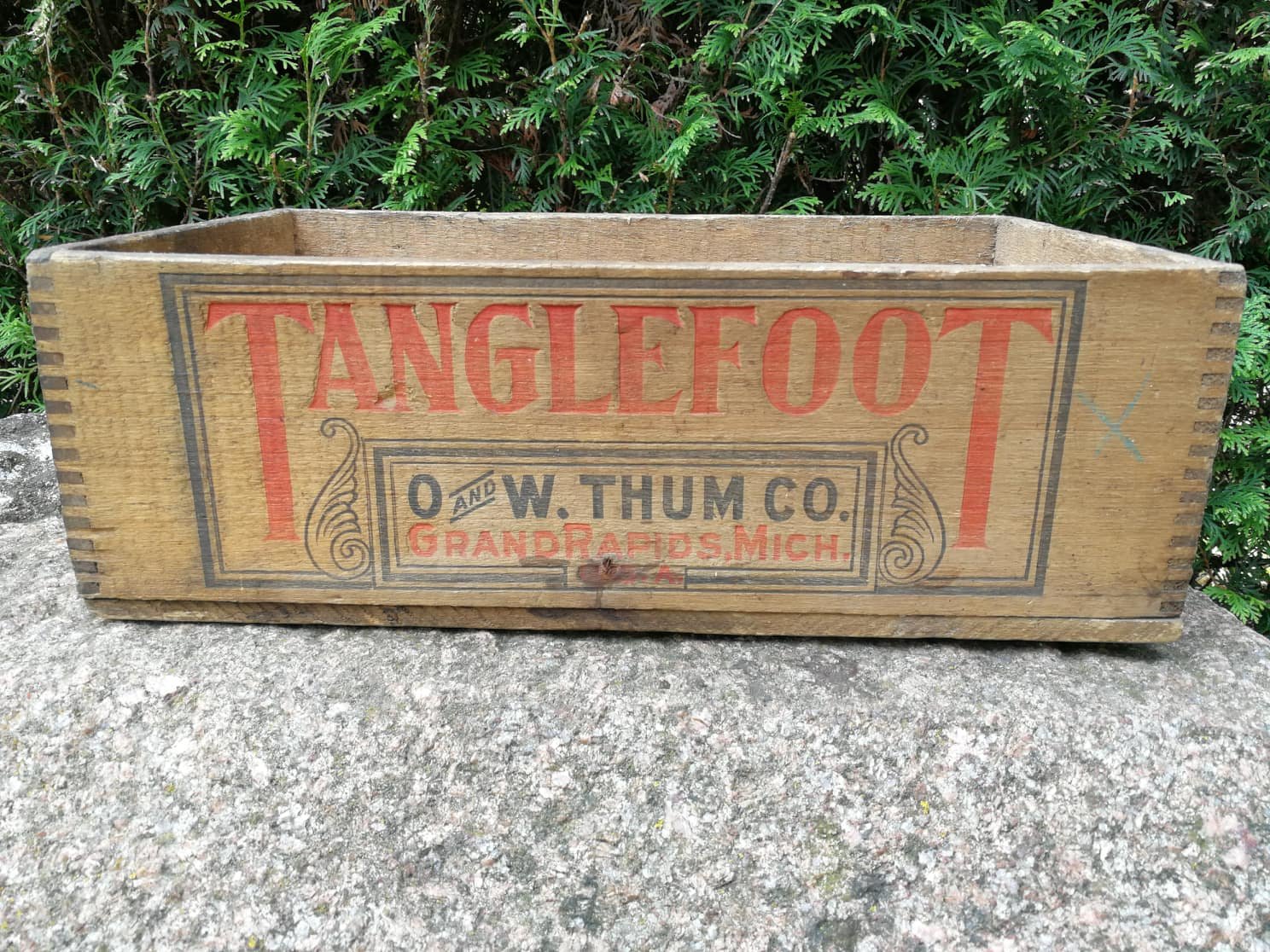 A wonderful early wooden advertising box for „Tanglefoot fly paper”. Tanglefoot was the first brand of fly paper that was non-poisonous. It was founded by William Thum in 1887 and was pronounced as „The Sanitary Fly Destroyer”. It was non-poisonous and green long before its’ time.