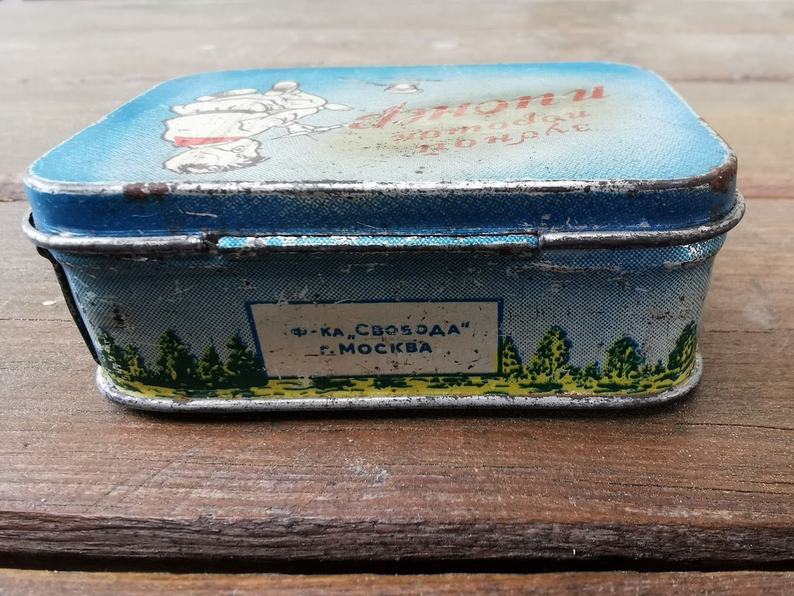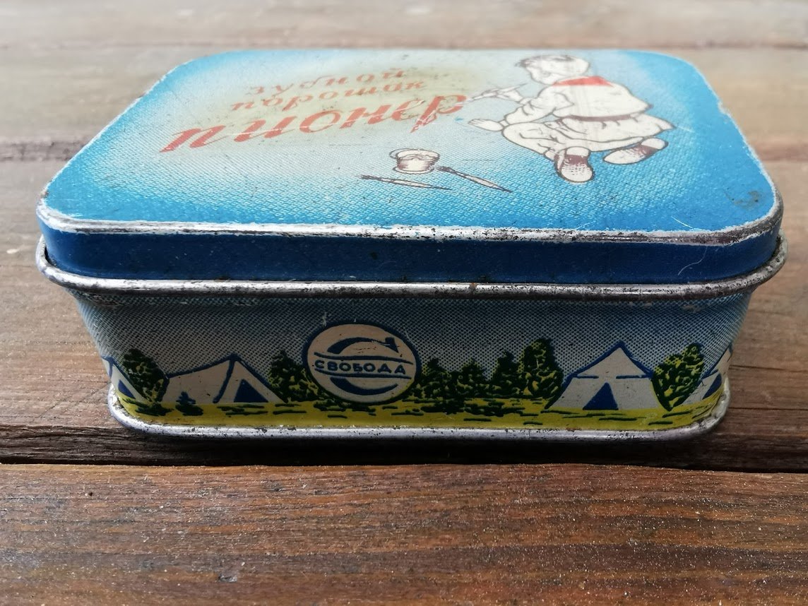 Dėžutė dantų valymo miltelių tarybinė Pionier. Maskva. Dydis: 3 x 6 x 9 cm. Kaina 22
