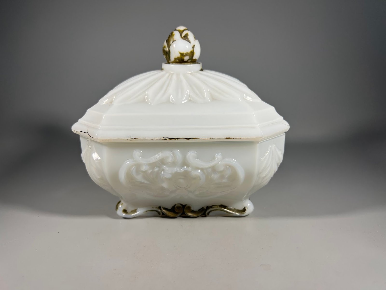 Opalinis stiklas: pusiau matinė, pieniškai balta išvaizda su subtiliu blizgesiu būdinga opaliniam stiklui. Šis stiklo tipas buvo populiarus Prancūzijoje nuo XVIII a. pabaigos iki XIX a., o populiarumo viršūnė buvo XIX a. viduryje. „Portieux Vallerysthal“: ši prancūzų įmonė gerai žinoma dėl plataus opalinio stiklo gaminių asortimento, įskaitant dekoratyvinius elementus, tokius kaip ši dengta lėkštė. Jie buvo ypač žinomi dėl savo balto ir mėlyno opalinio stiklo. Dizainas su puošniais apvadais šonuose ir išskirtiniu dangtelio apvadu atitinka tuo laikotarpiu tokių gamintojų kurtus įmantrius ir dekoratyvius stilius. Forma ir savybės: Tai yra uždengtas indas, galbūt saldainių indelis, sviestinė arba mažas serviravimo dubuo. Dangtelio ir dekoratyvinio pagrindo raukinys arba grioveliai taip pat yra dažni „Portieux Vallerysthal“ gaminių elementai. Šiek tiek nusidėvėję aukso / bronzos akcentai ant viršūnės ir pagrindo rodo antikvarinę kilmę.