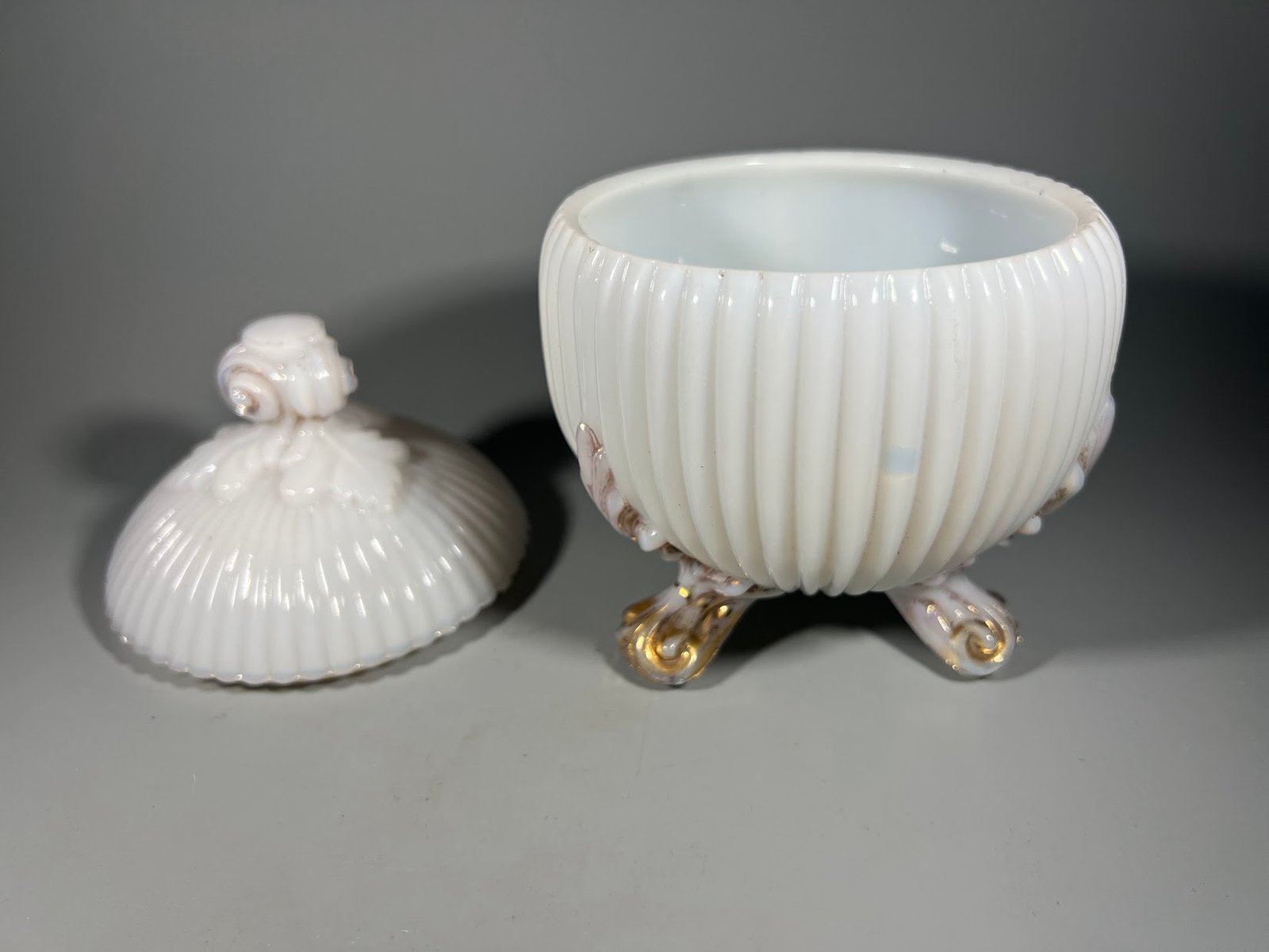 Dėžutė, indas, saldaininė, cukrinė antikvarinė, opalinio stiklo su dangteliu, ant trijų kojelių, prancūziška, Potieux Vallerysthal. Aukštis 16, skersmuo 11 cm. Kaina 68