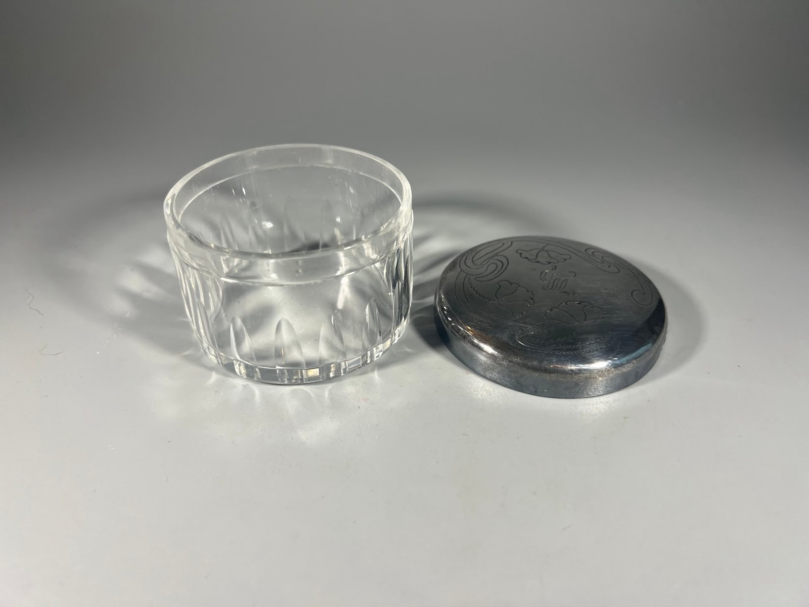 Dėžutė, indelis stiklinis, antikvarinis, sidabruotu dangteliu. Kaina 12