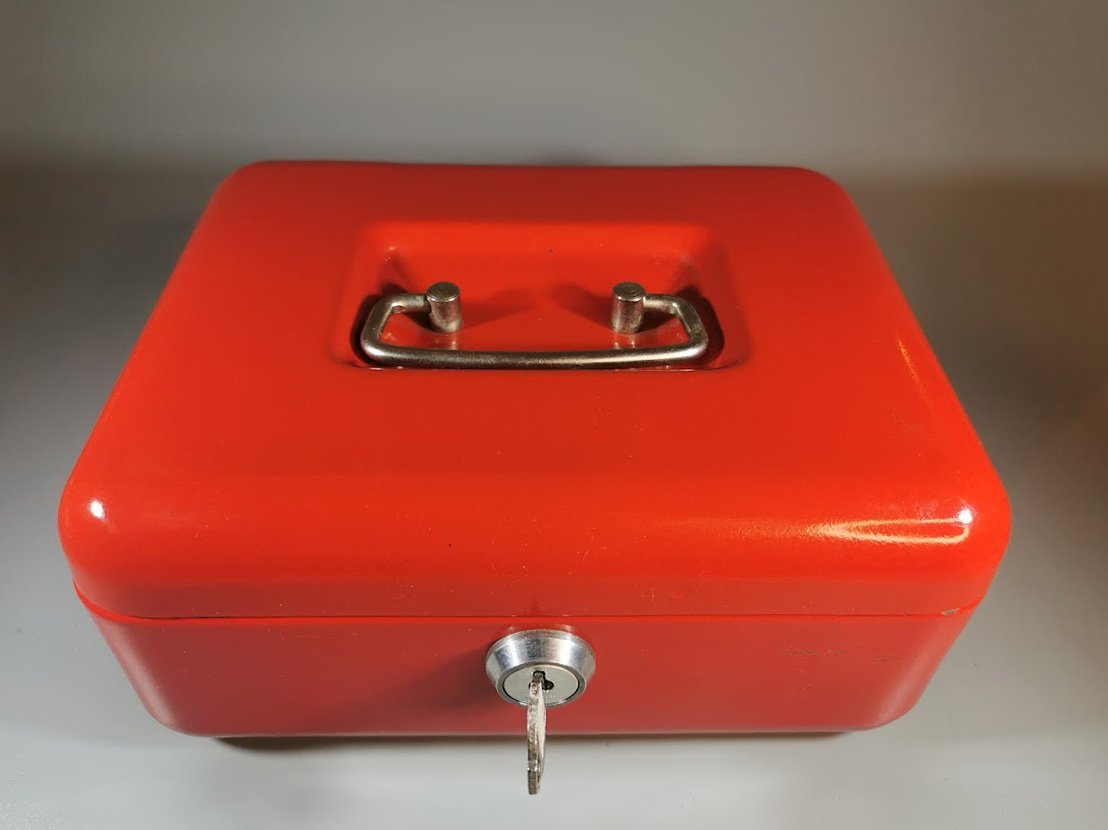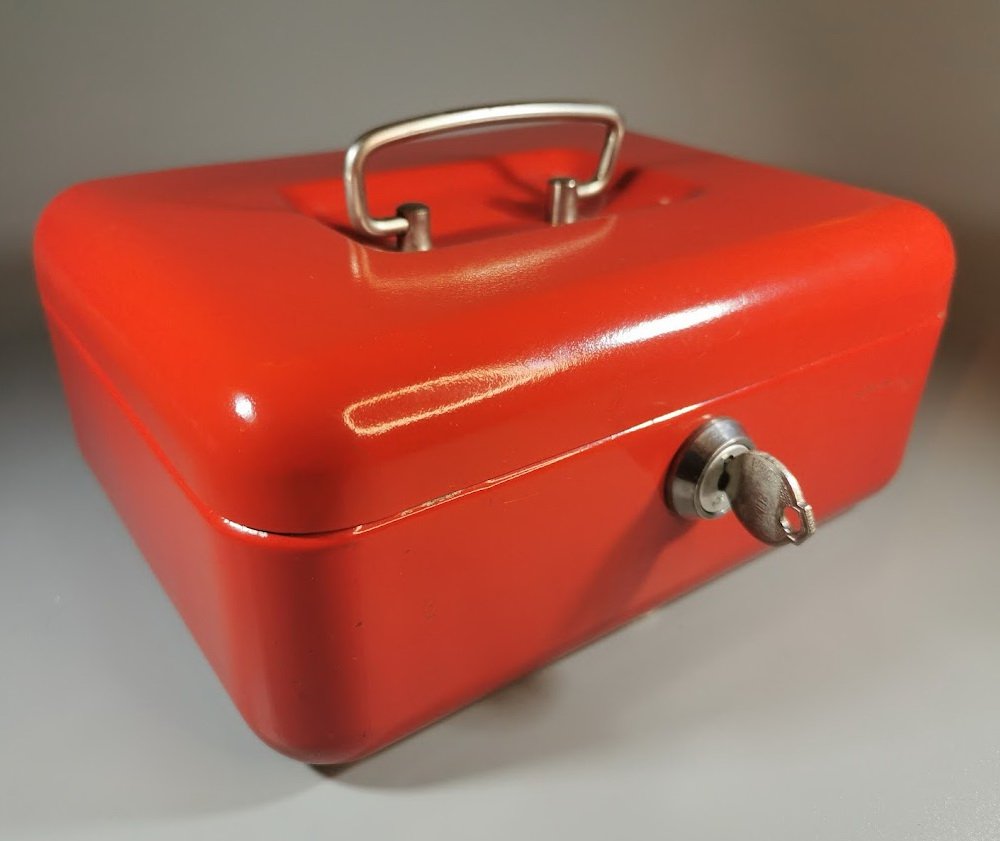 Dėžutė metalinė, rakinama, nešiojama. Vokietija. Dydis: 10 x 17 x 21 cm. Kaina 28