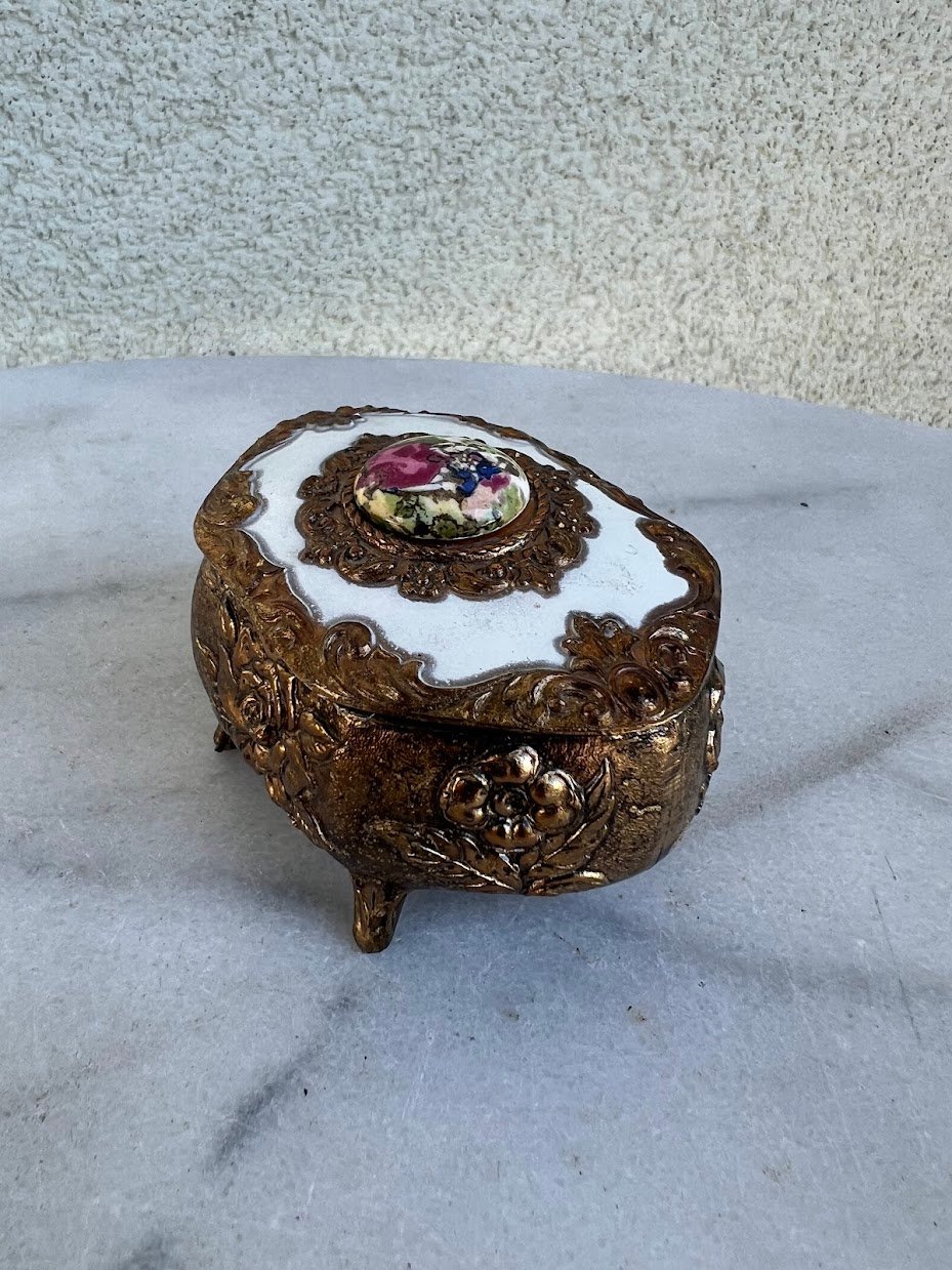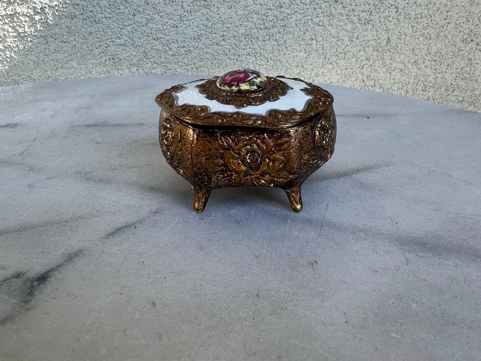 Dėžutė papuošalams metalinė, dengta balta emale, japoniška. Aukštis 5, plotis 5, ilgis 7 cm. Kaina 23
