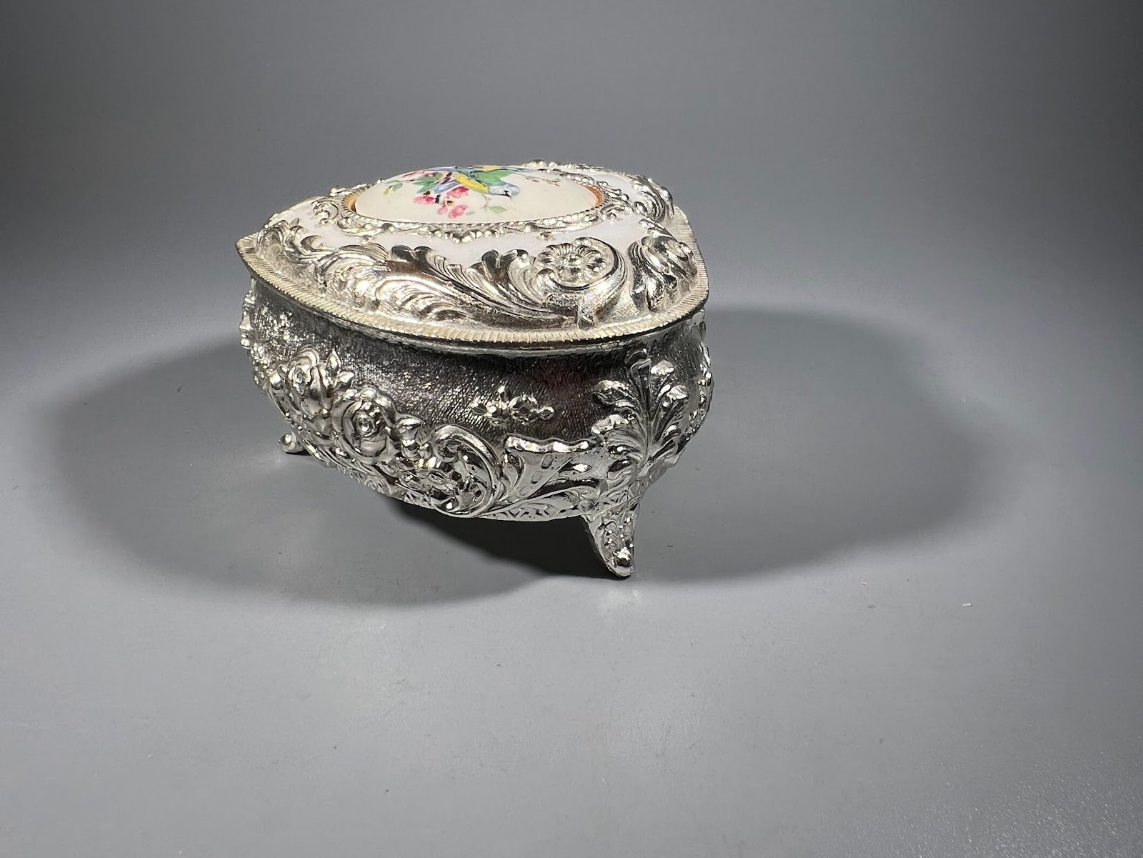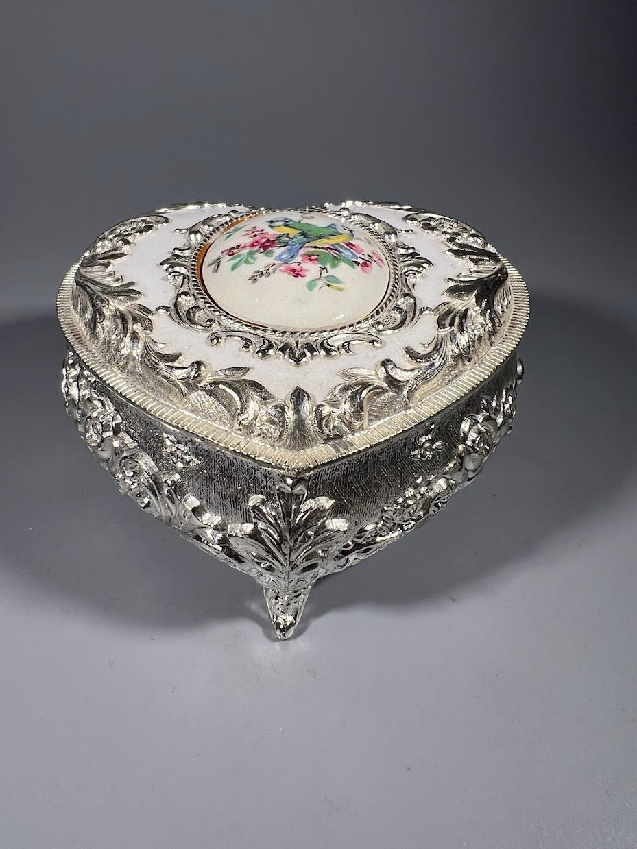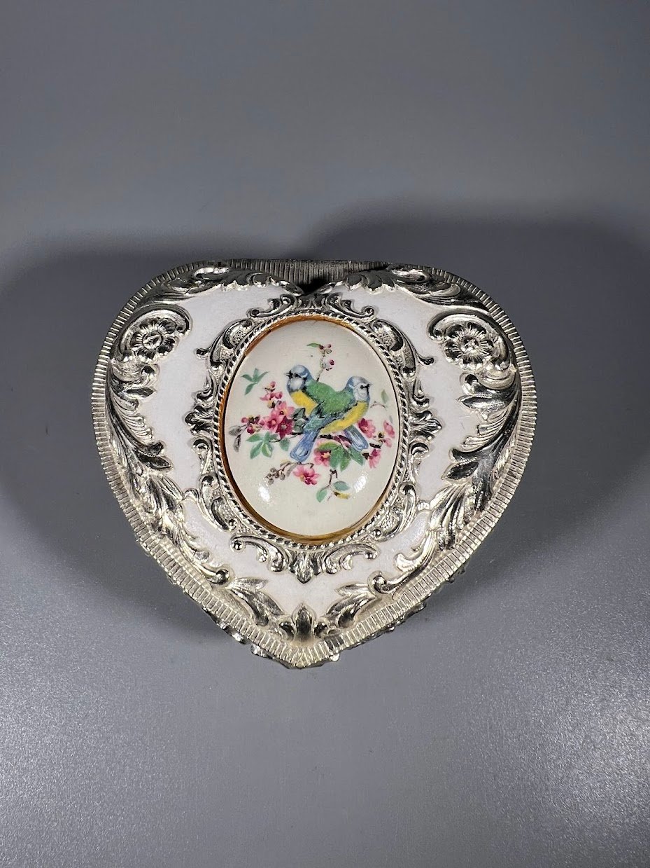 Dėžutė papuošalams metalinė, širdelės formos, dengta balta emale, japoniška. Aukštis 6, ilgis 9, plotis 8 cm. Kaina 26