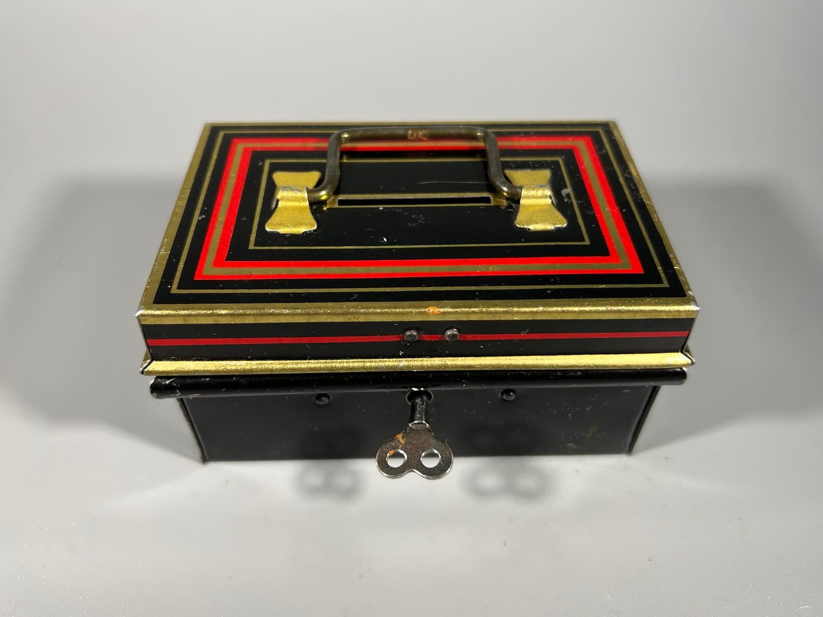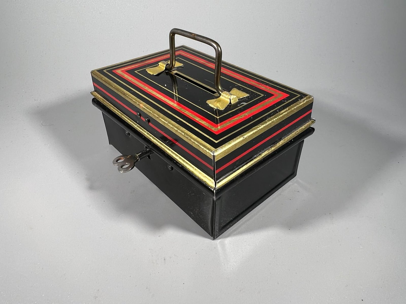 Dėžutė pinigams, taupyklė, skardinė. antikvarinė, rakinama, su rakteliu, angliška. Kaina 21