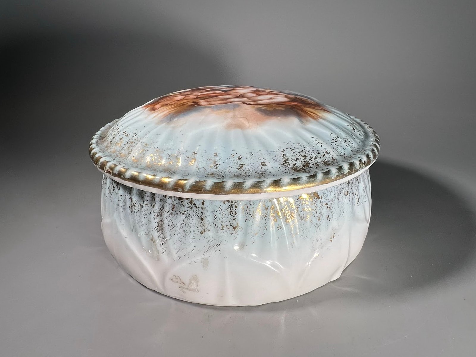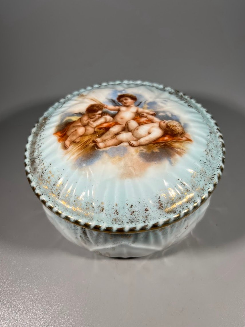 Dėžutė porcelianinė, antikvarinė, prancūziška puošta angeliukais. Aukštis 7, skersmuo 11 cm. Kaina 28