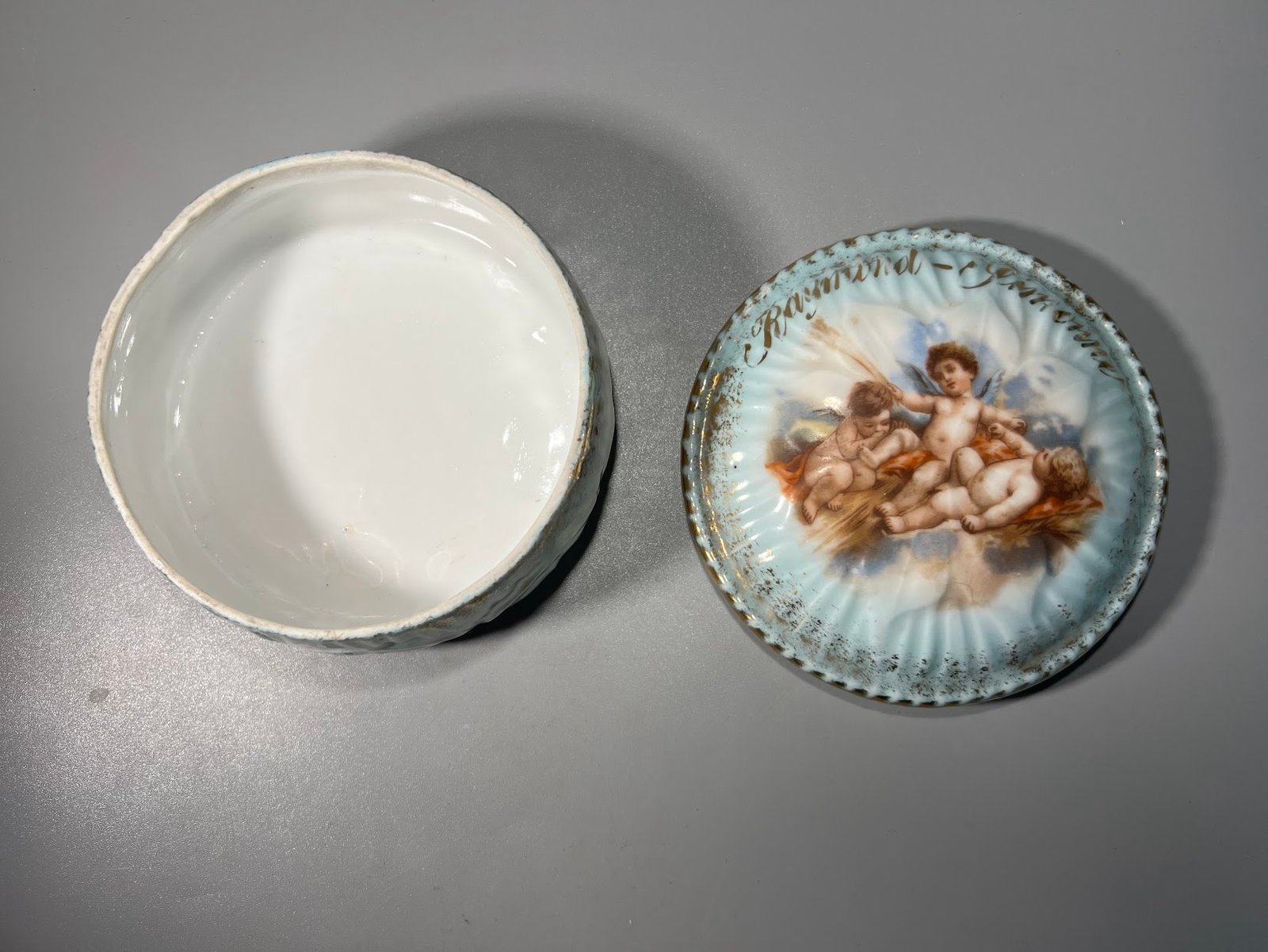 Dėžutė porcelianinė, antikvarinė, prancūziška puošta angeliukais. Kaina 28