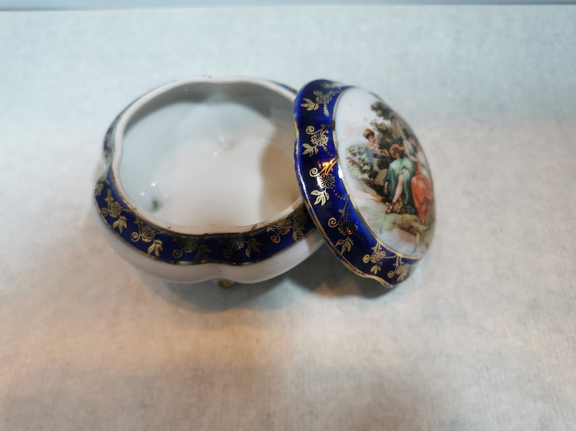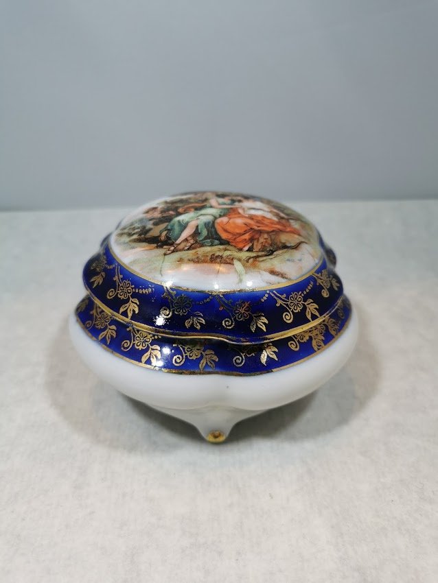 Porcelianinė dėžutė. Skersmuo 12 cm, aukštis 8 cm. Kaina 26