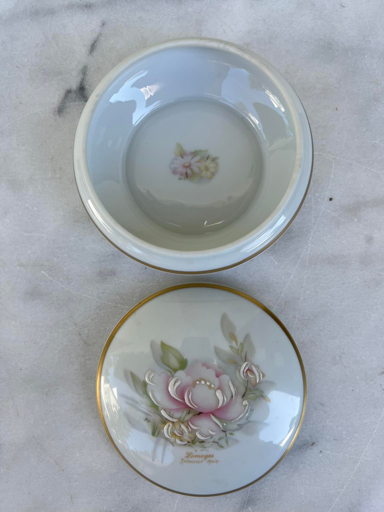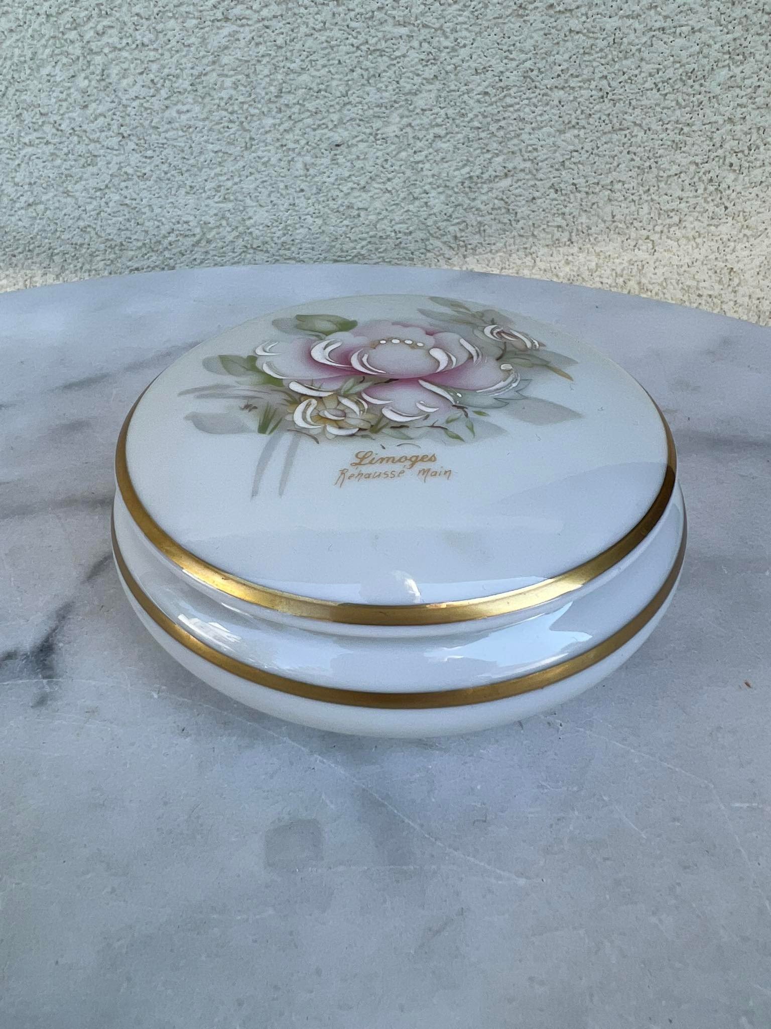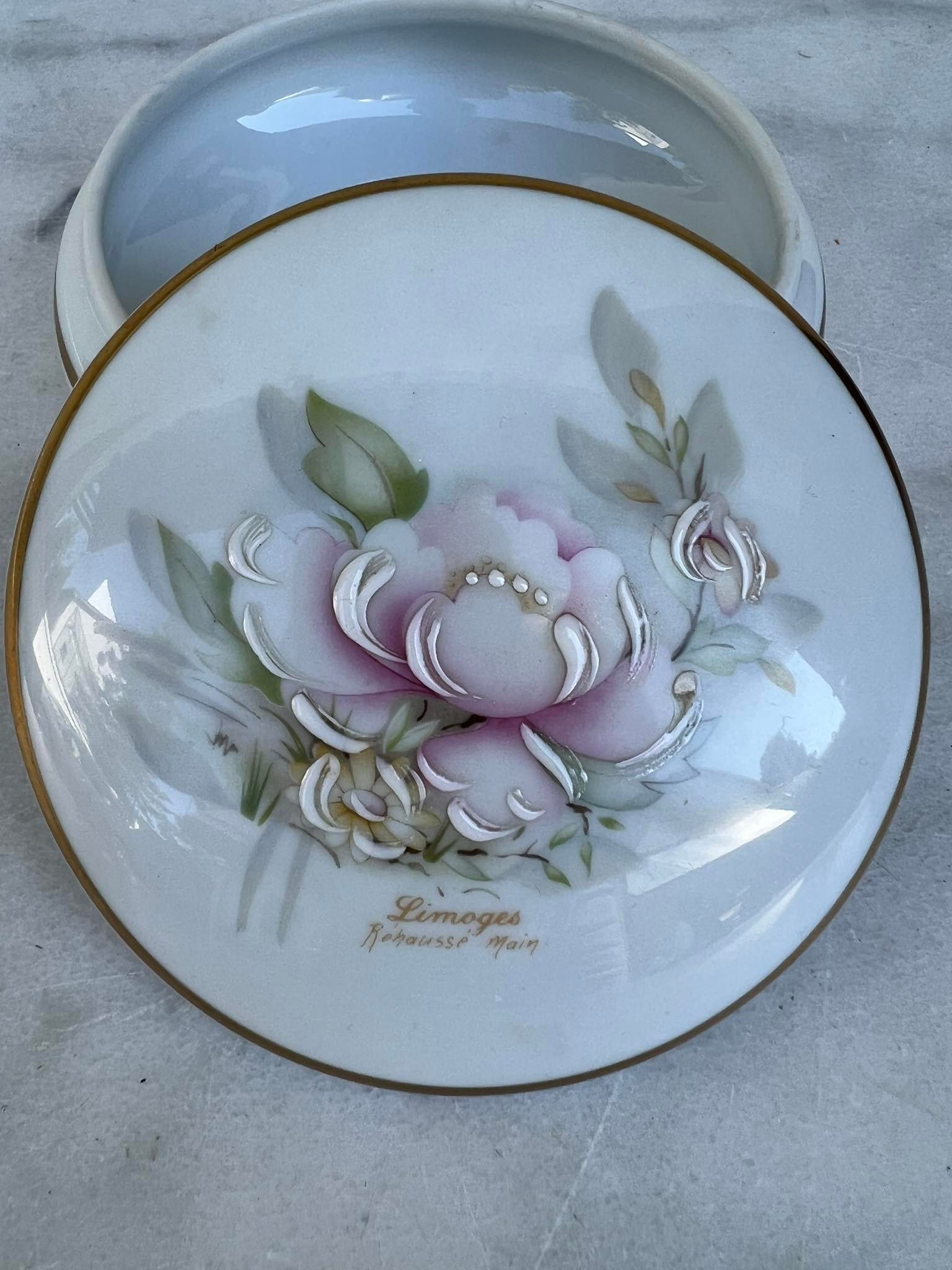 Dėžutė porcelianinė Limoges Rehausse Main. Tapyta. Prancūzija. Porcelaine de Limoges selection Gilis. Tapyta. Aukštis 7, skersmuo 13 cm. Kaina 38