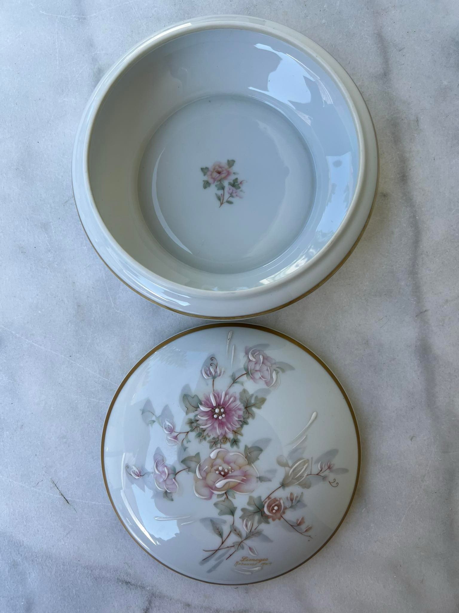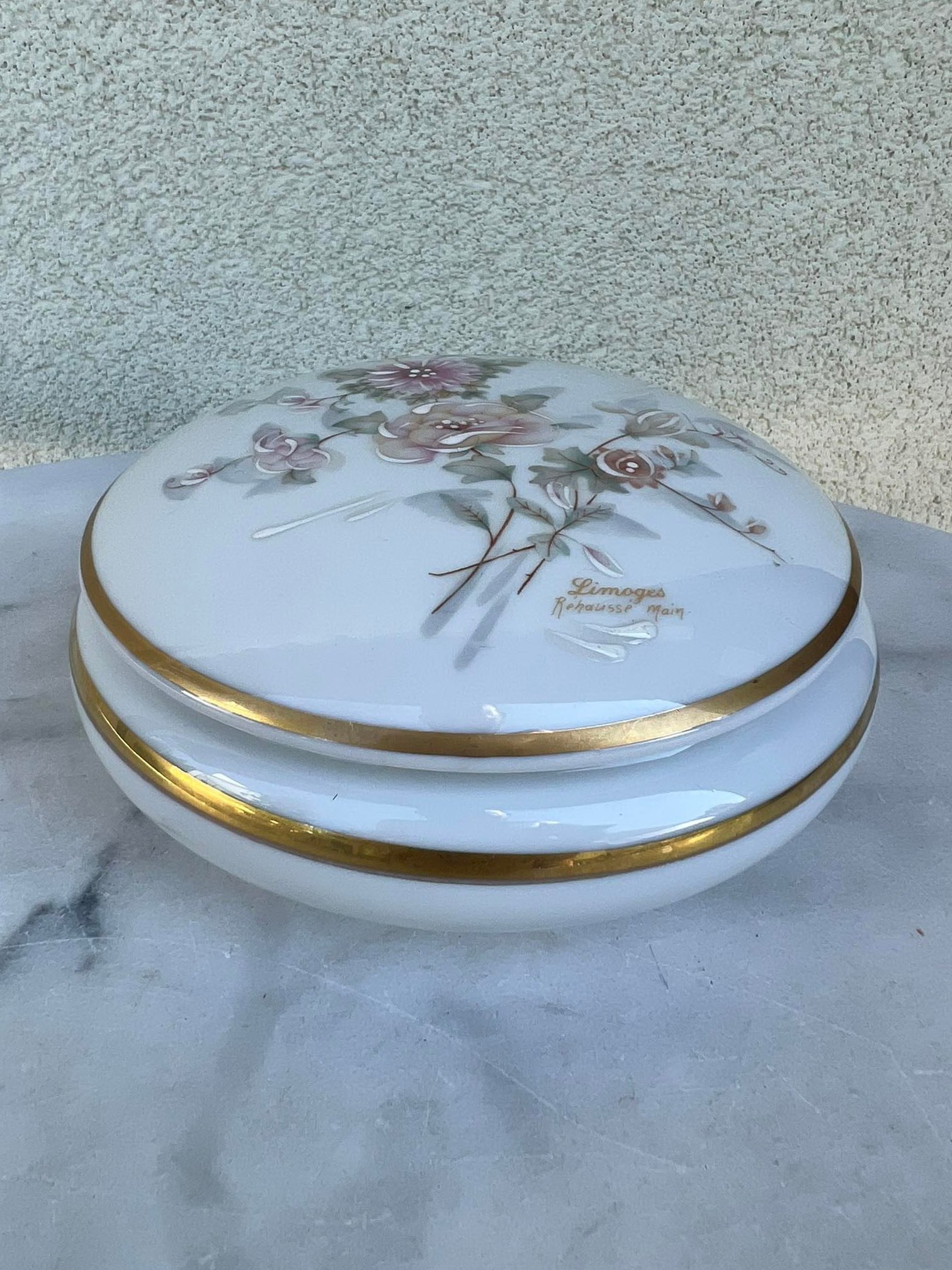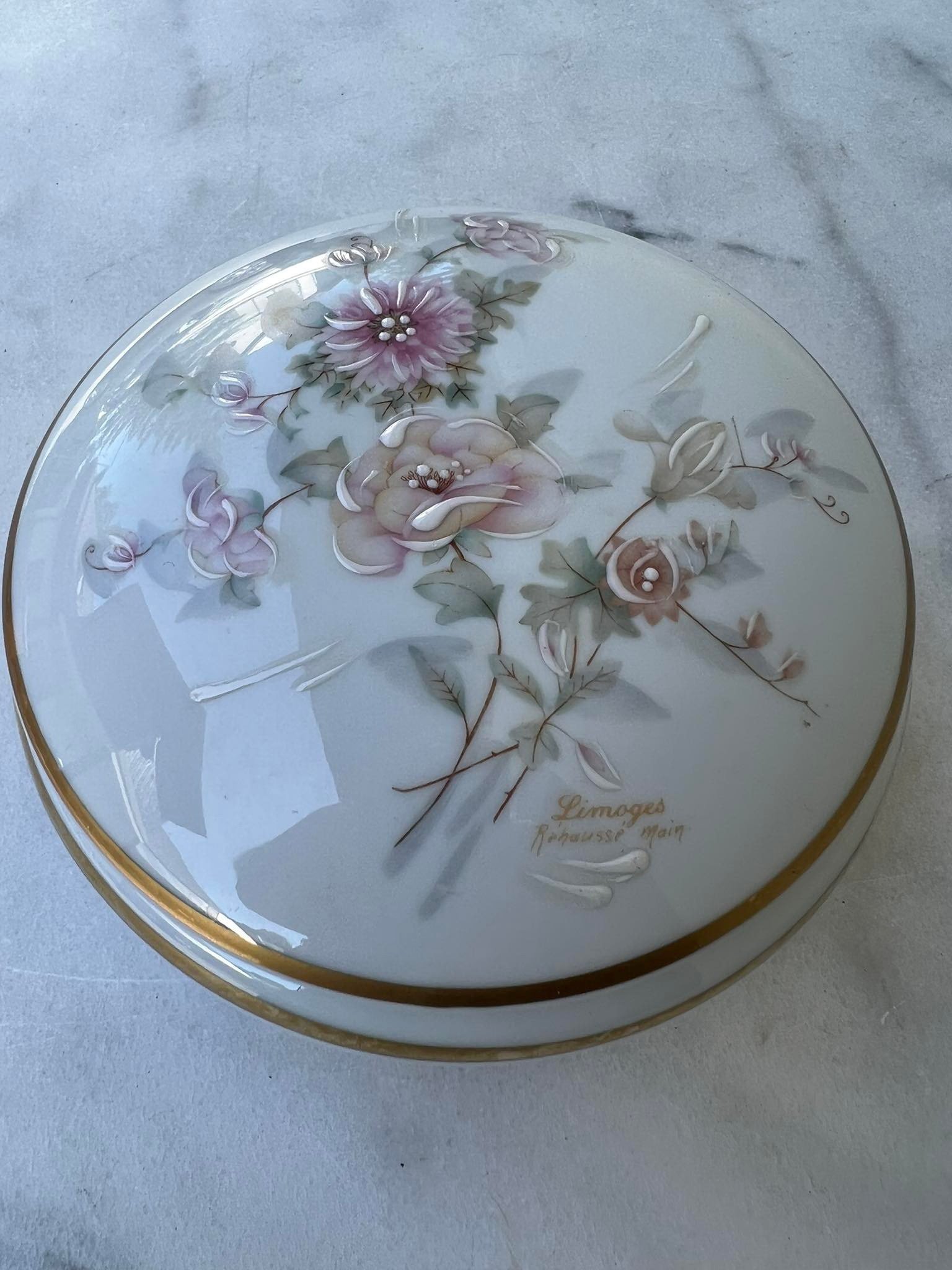Dėžutė porcelianinė Limoges Rehausse Main. Tapyta. Prancūzija. Porcelaine de Limoges selection Gilis. Tapyta. Aukštis 8, skersmuo 16 cm. Kaina 48
