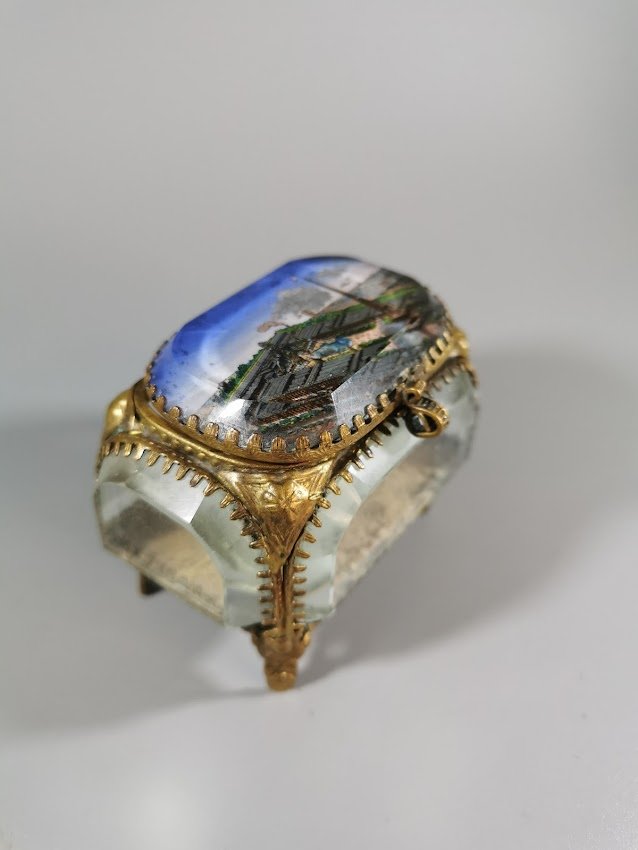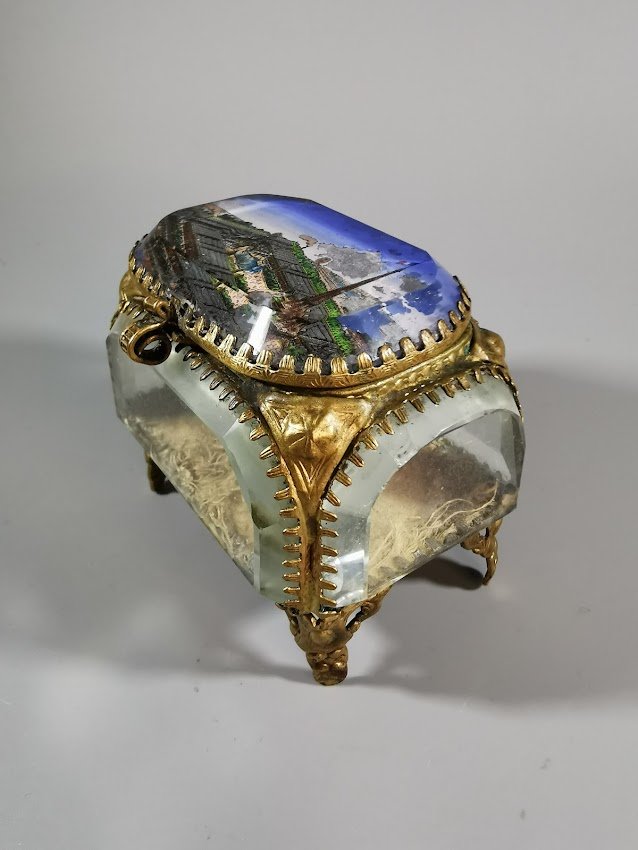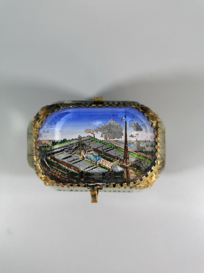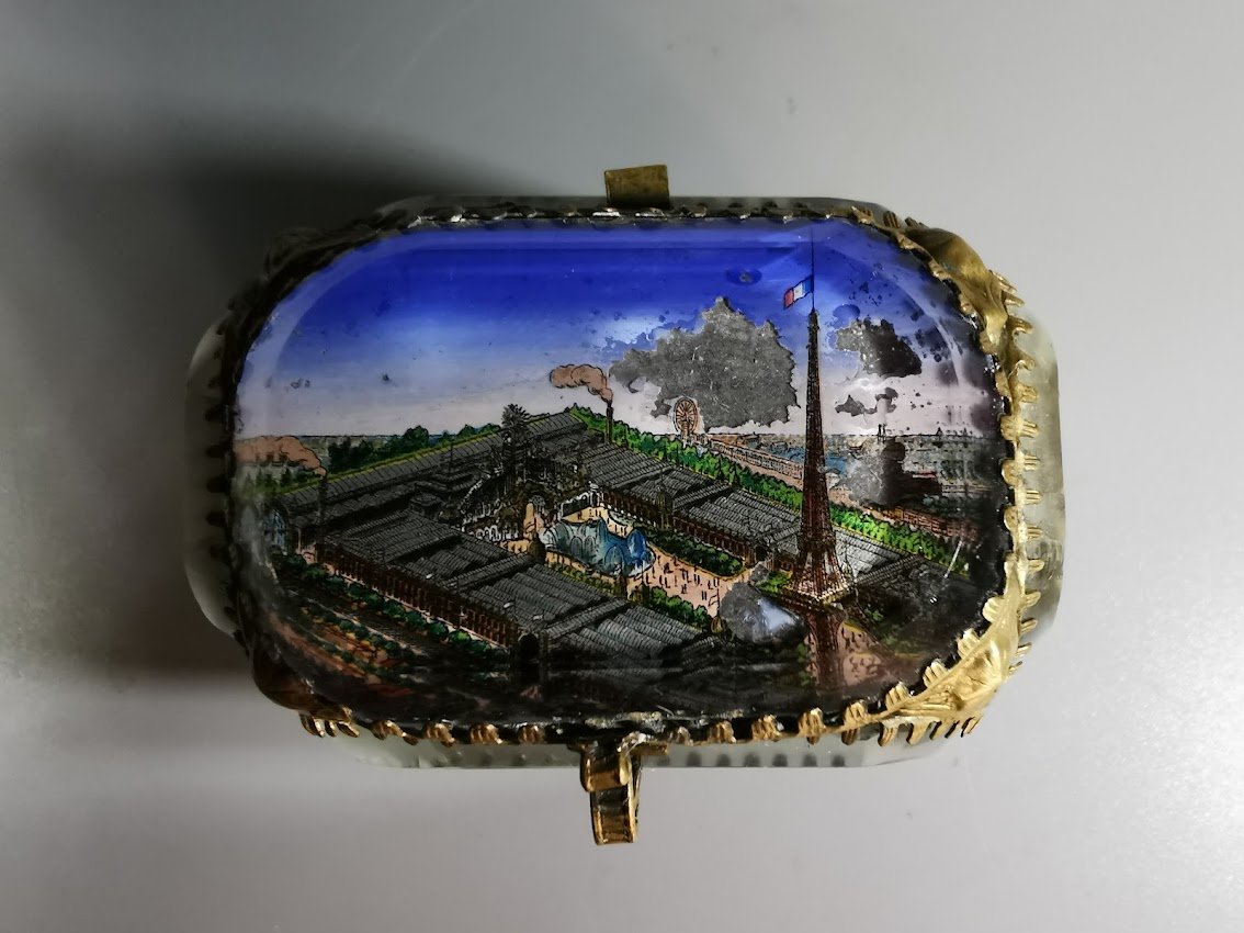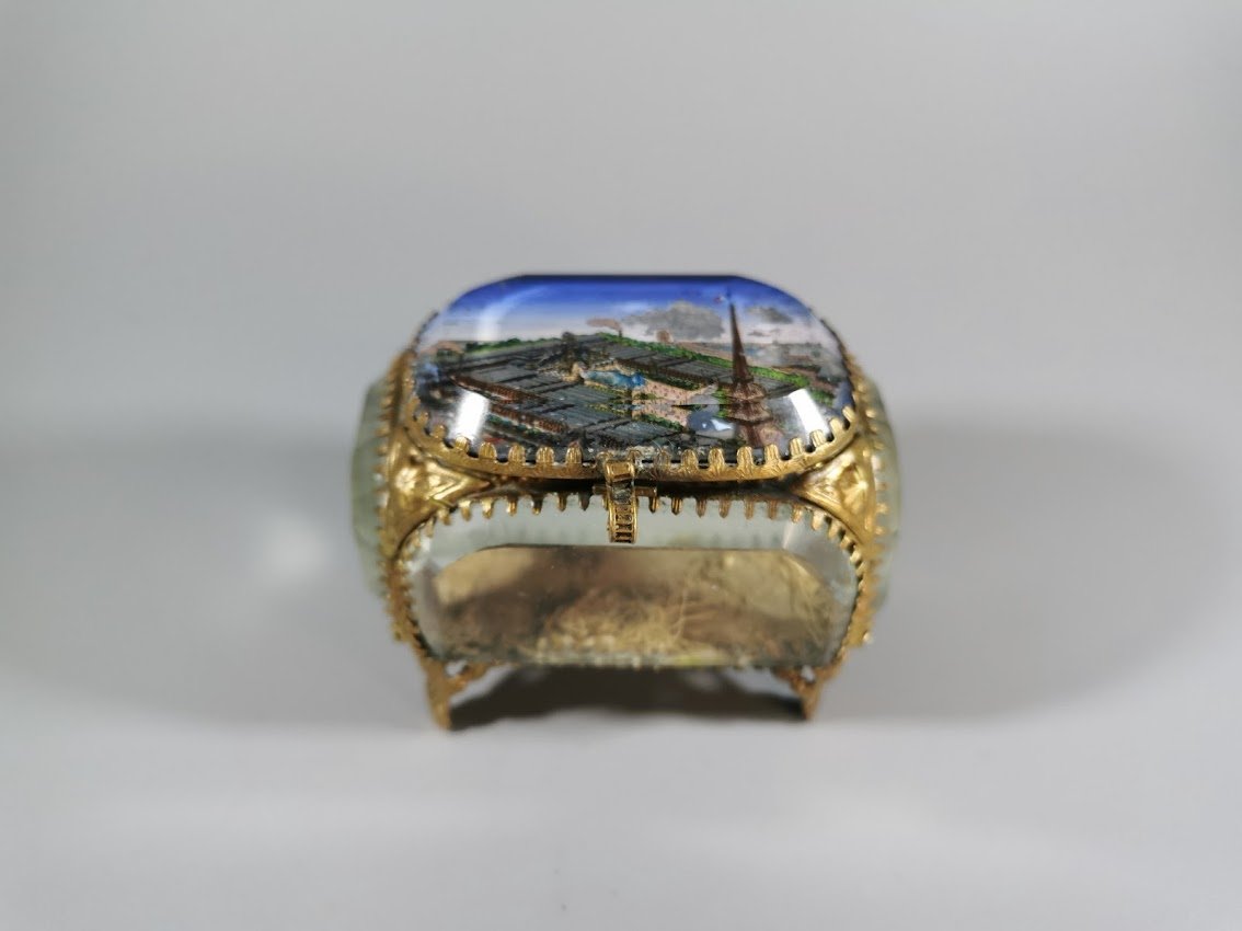 Dėžutė, skrynelė antikvarinė skirta Tarptautinei parodai Paryžiuje, 1889 m. Belle epoque laikotarpis. Dydis: 5 x 7 x 8 cm. Šlifuotas stiklas, žalvaris. Kaina 153