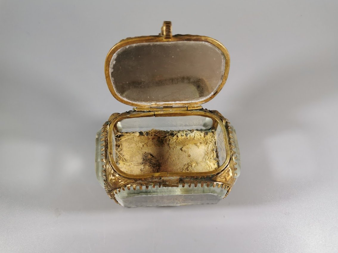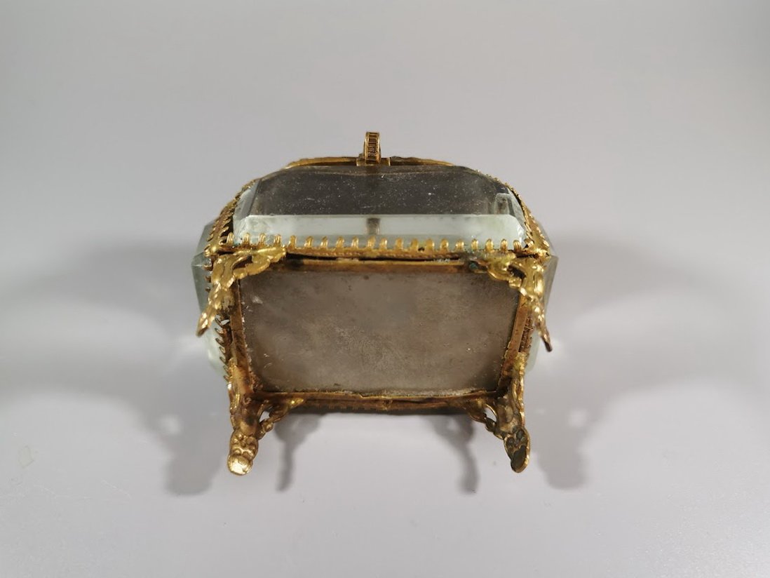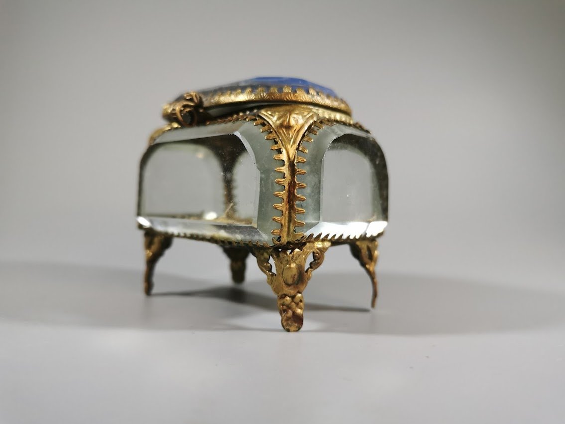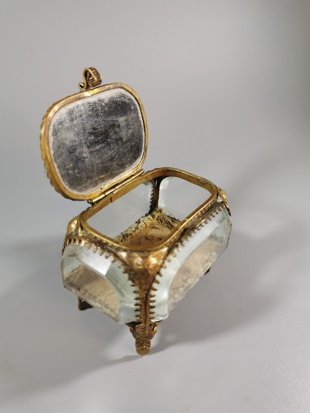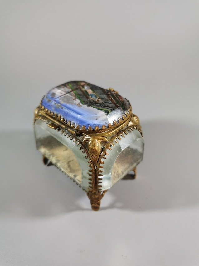 Dėžutė, skrynelė antikvarinė skirta Tarptautinei parodai Paryžiuje, 1889 m. Belle epoque laikotarpis. Dydis: 5 x 7 x 8 cm. Šlifuotas stiklas, žalvaris. Kaina 153