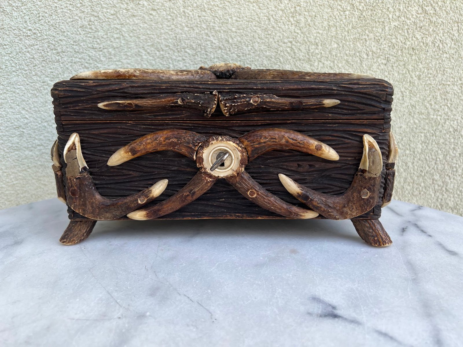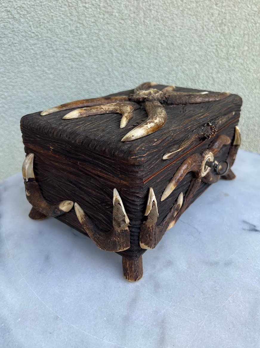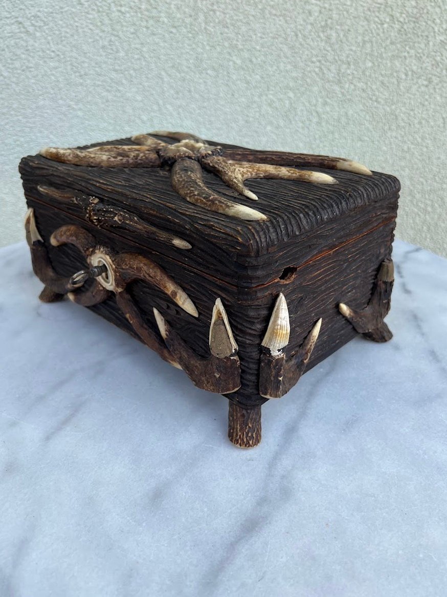 Antikvarinė XIX a. Juodojo miško papuošalų dėžutė. Šis unikalus liaudies meno kūrinys buvo pagamintas Juodojo miško regione, Vokietijoje arba Šveicarijoje. Tai puikus meistriškumo, kuriuo šis regionas išgarsėjo, pavyzdys ir pasižymi gražiomis detalėmis. Dėžutė išdrožta iš kietos medienos ir dekoruota elnių ragų bei šernų ilčių gabalėliais.