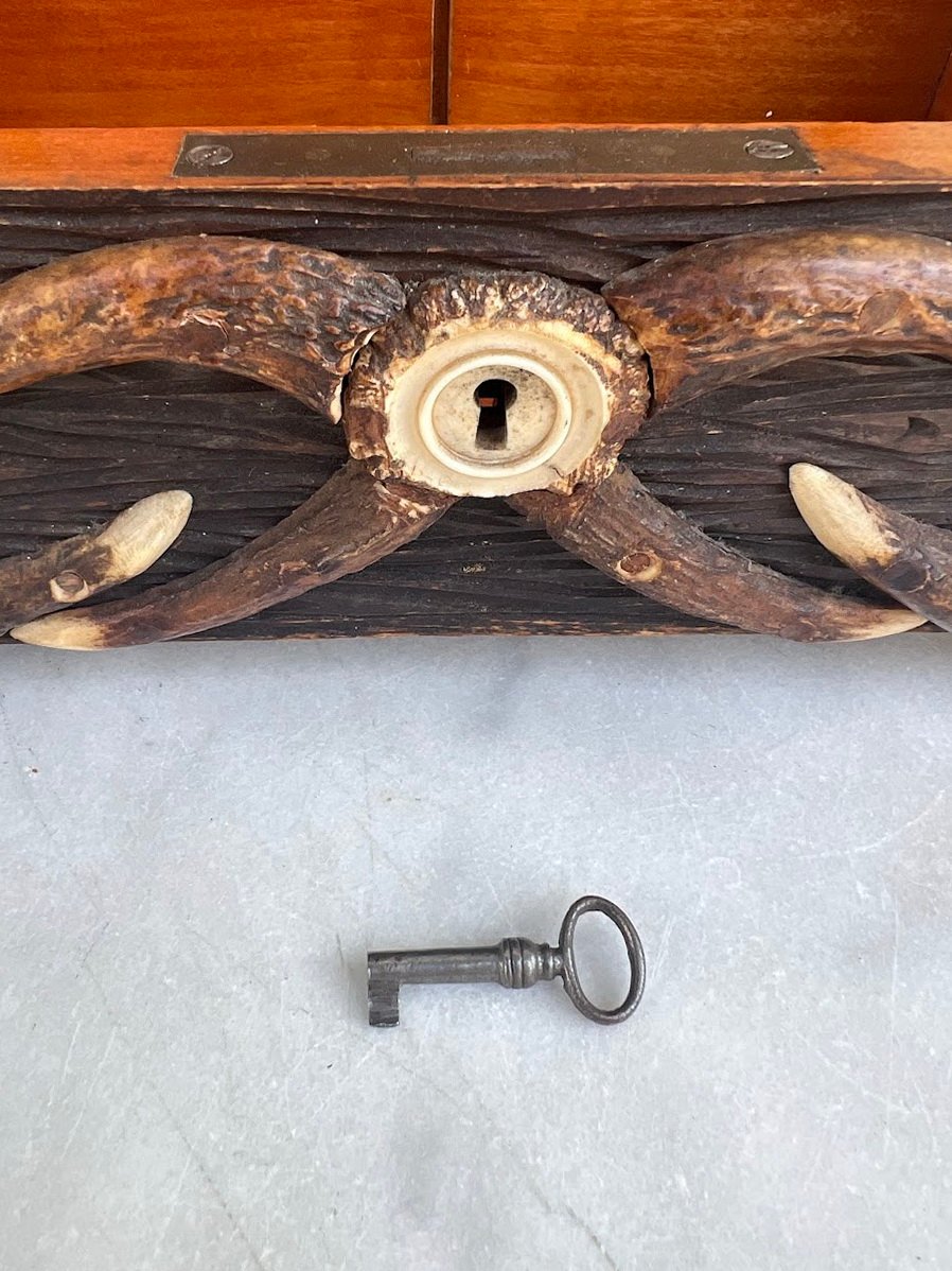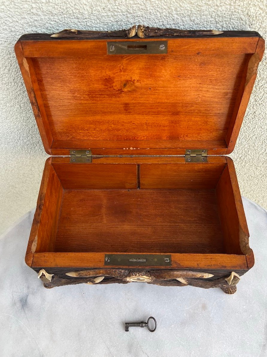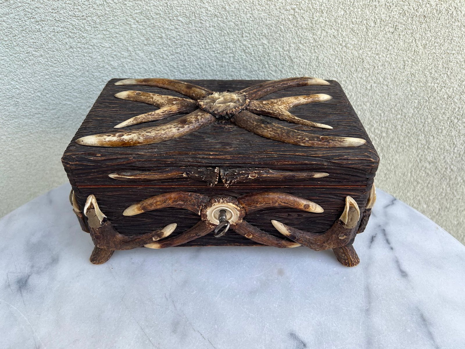 Antikvarinė XIX a. Juodojo miško papuošalų dėžutė. Šis unikalus liaudies meno kūrinys buvo pagamintas Juodojo miško regione, Vokietijoje arba Šveicarijoje. Tai puikus meistriškumo, kuriuo šis regionas išgarsėjo, pavyzdys ir pasižymi gražiomis detalėmis. Dėžutė išdrožta iš kietos medienos ir dekoruota elnių ragų bei šernų ilčių gabalėliais.