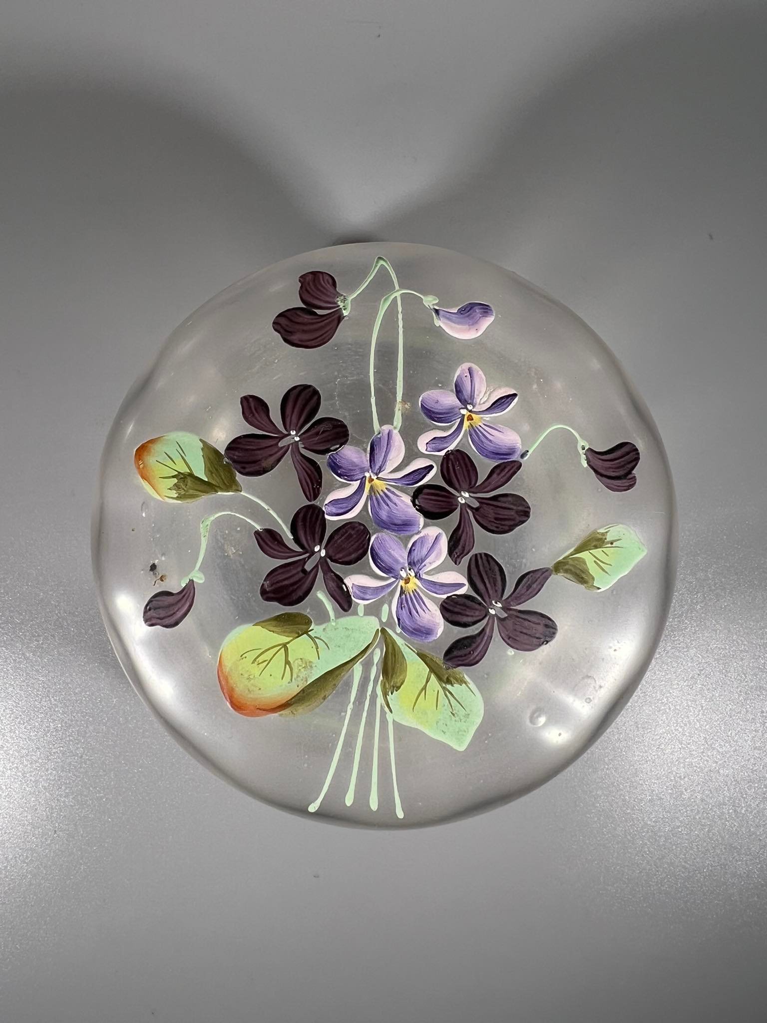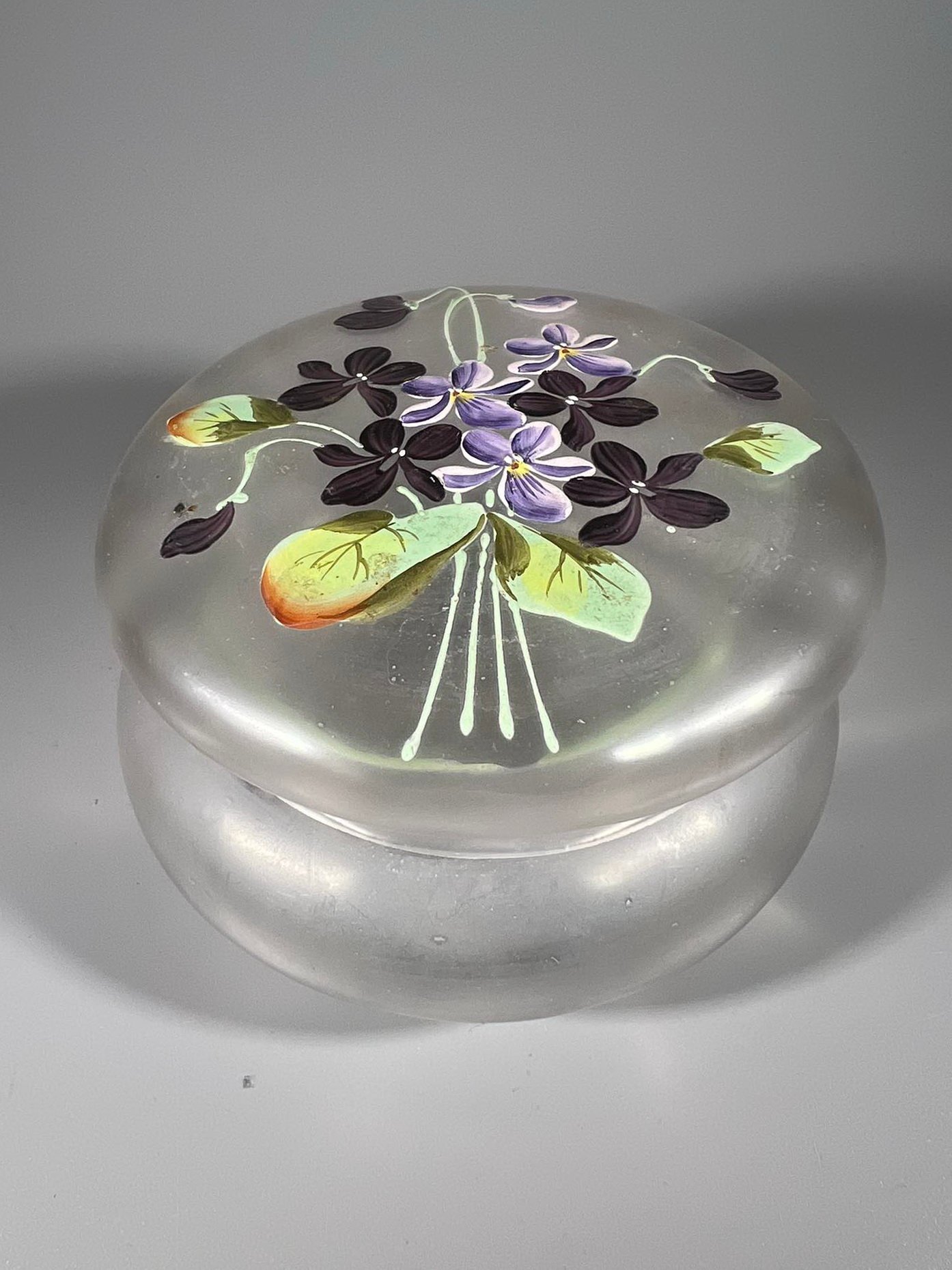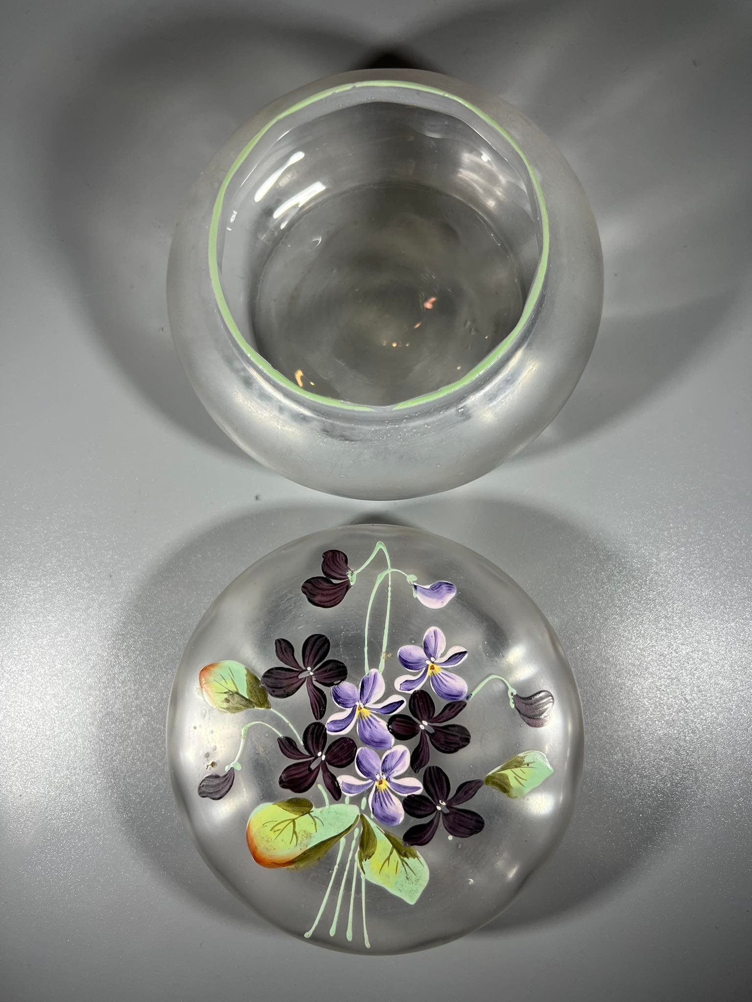 Dėžutė stiklinė tapyta vintažinė. Aukštis 8, skersmuo 12 cm. Kaina 23