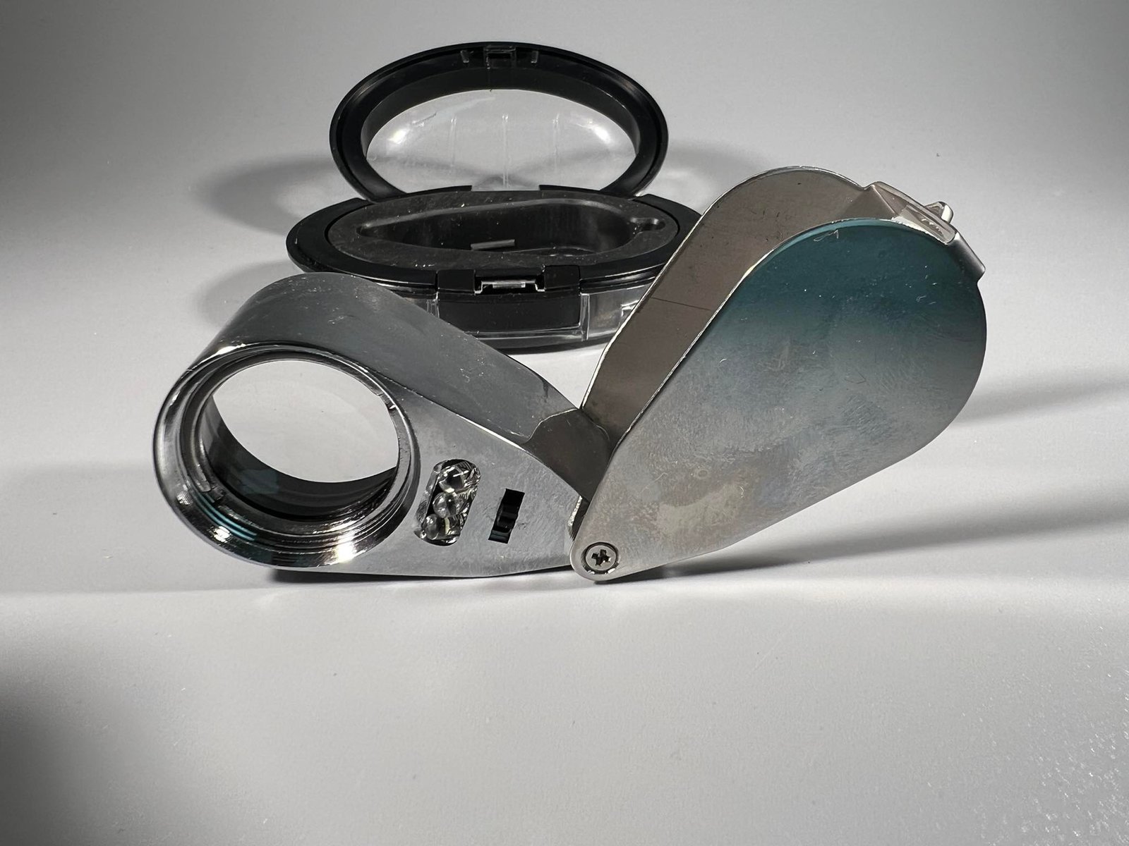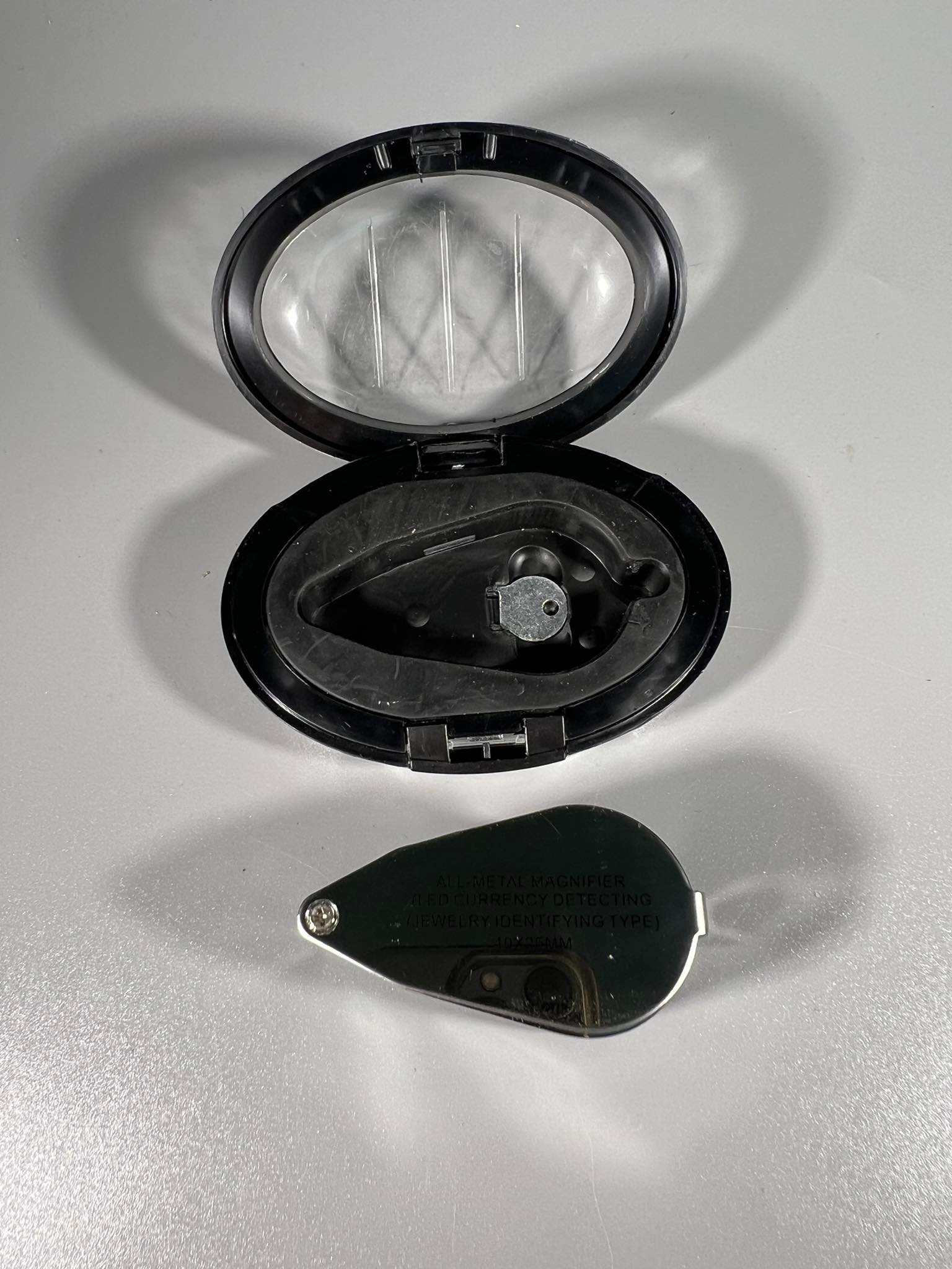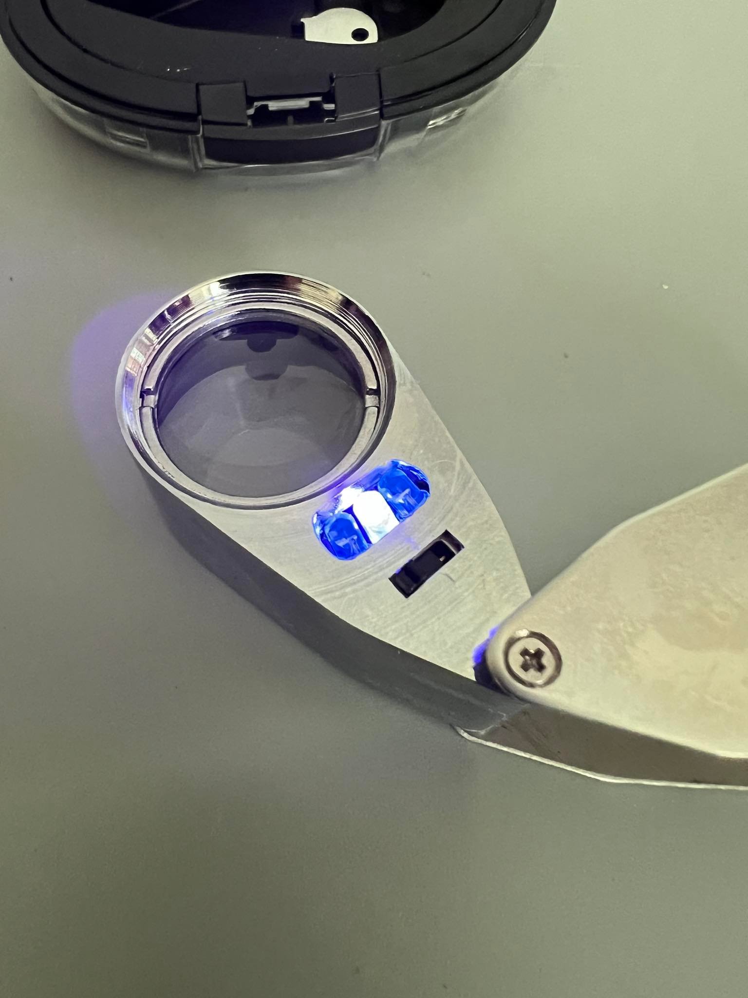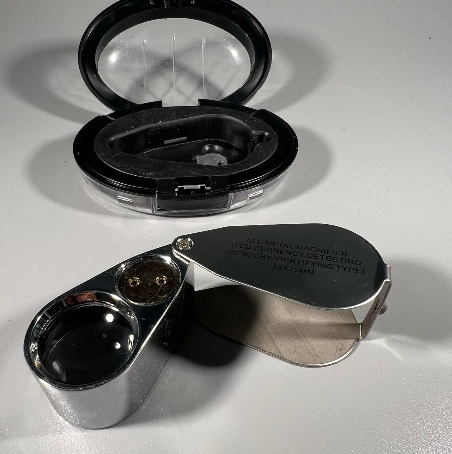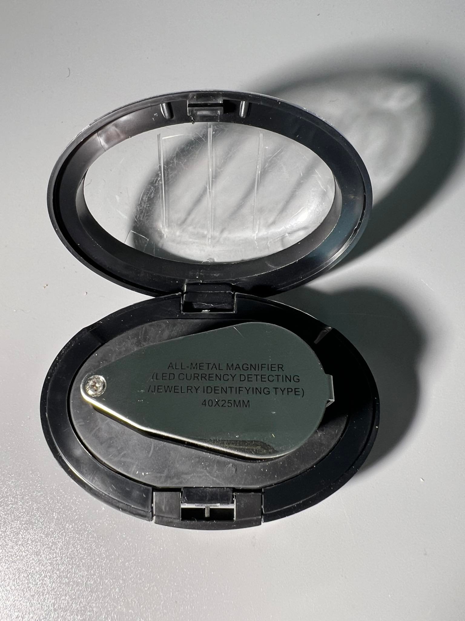 Didinamasis, didinantis 40 kartų padidinimo stiklas, lupa, 40 x 25 mm. Led apšvietimas bei UV apšvietimas. Metalinis korpusas. Nenaudotas. Dėžutės 9, plotis 6,aukštis 4 cm. Kaina Kaina 20