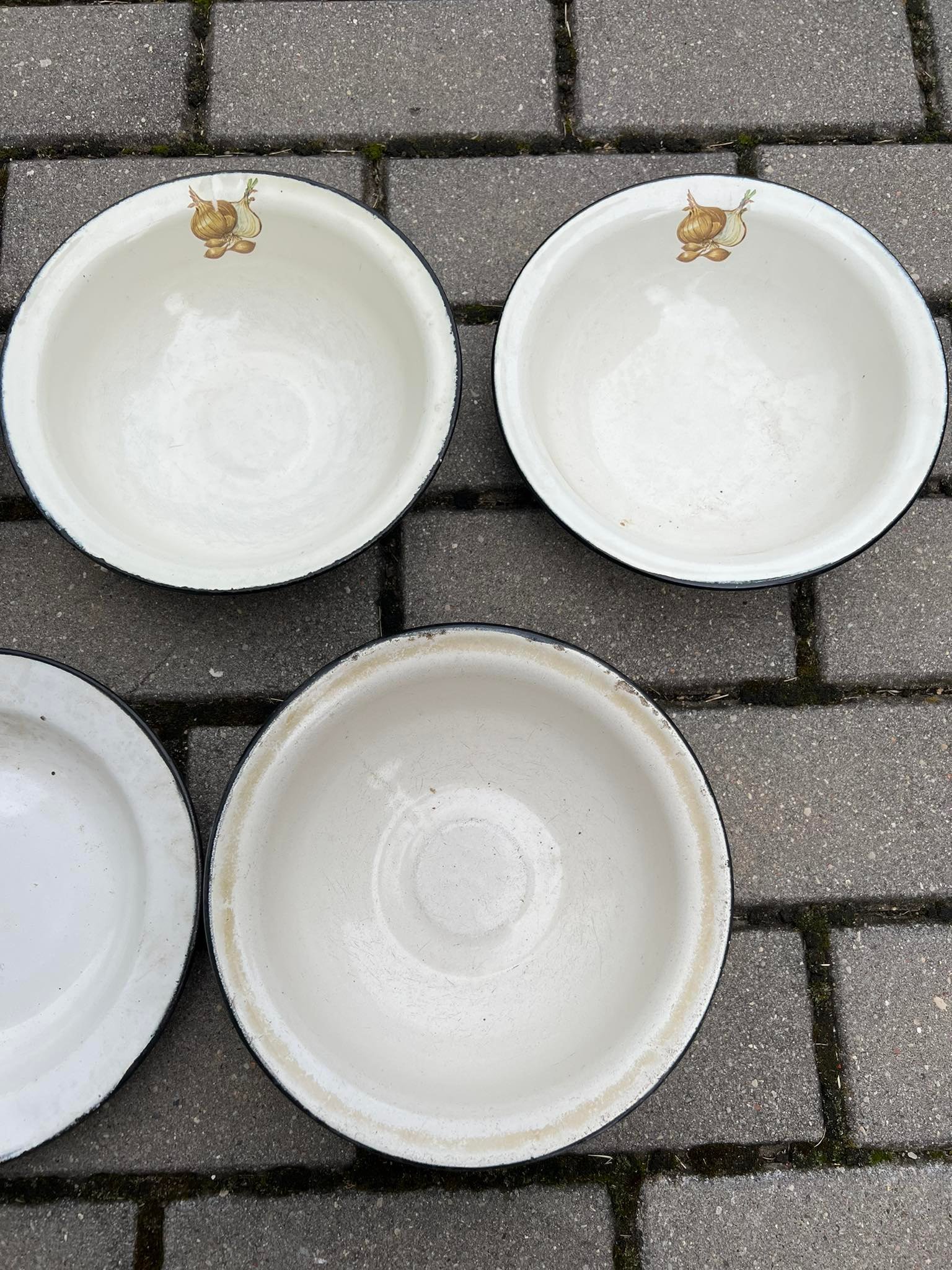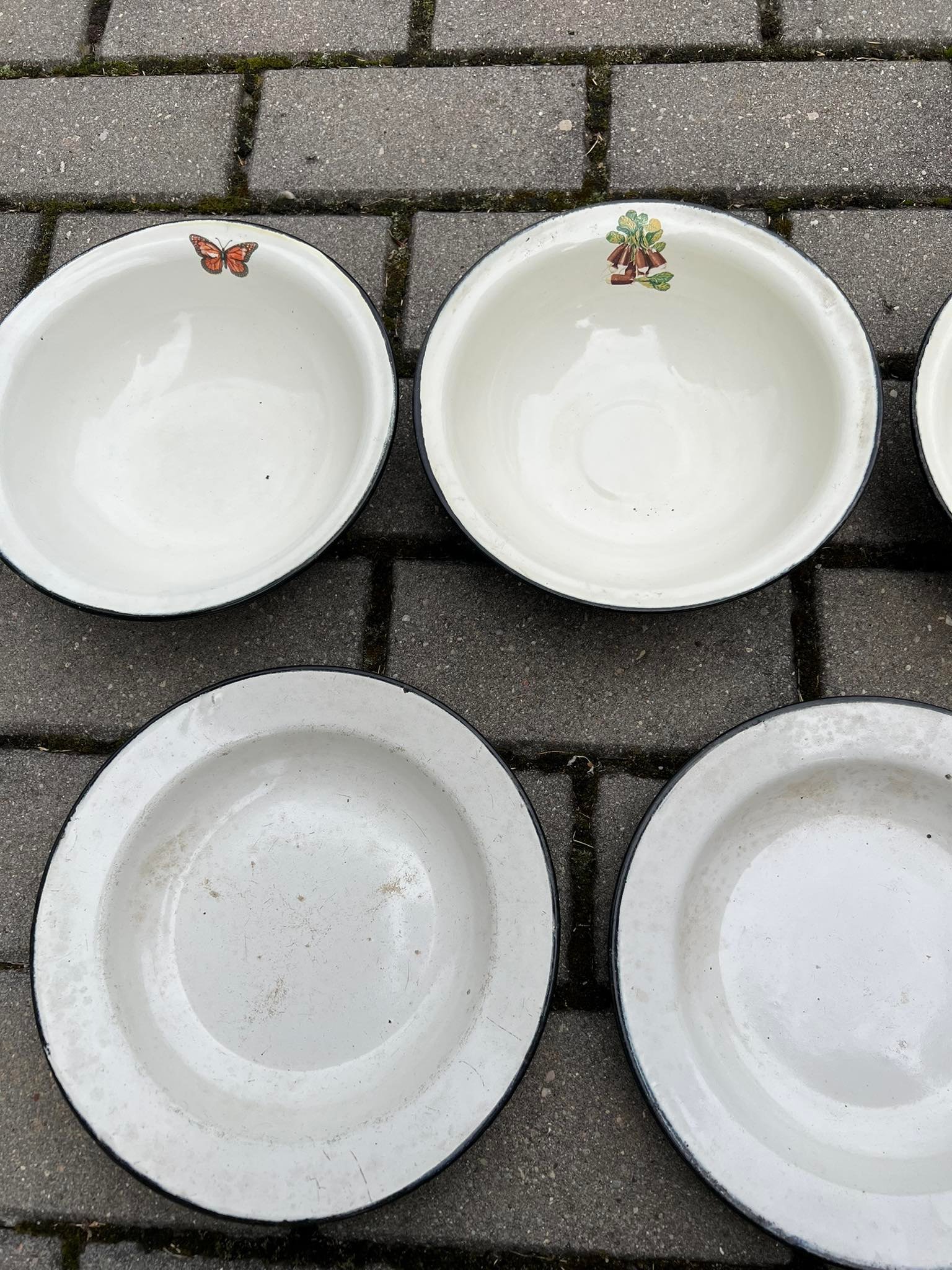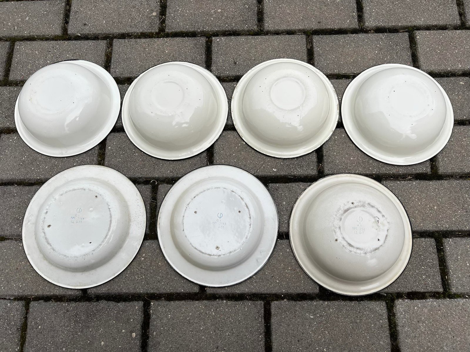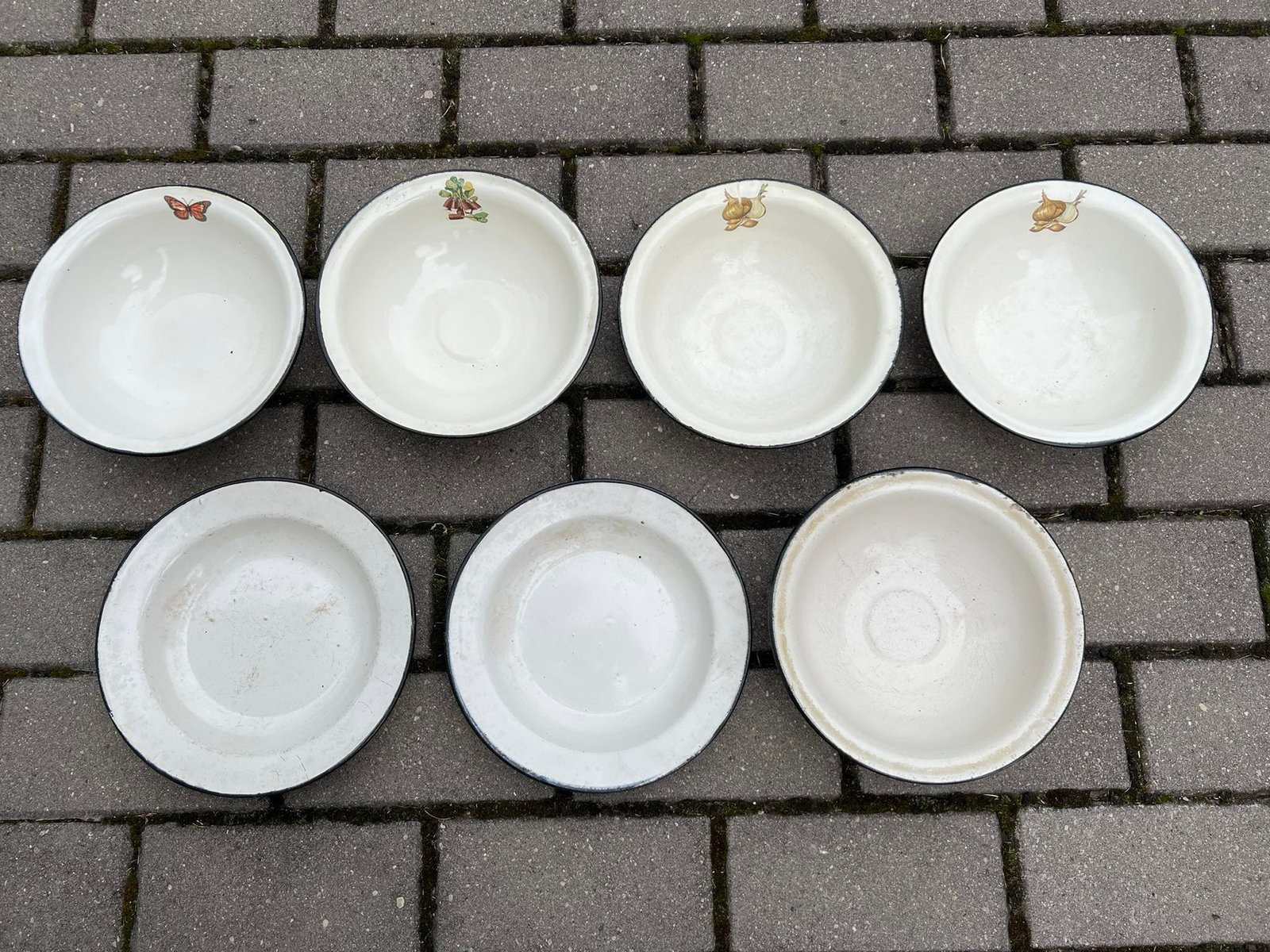 Dubenėliai, lėkštės, bliūdeliai emaliuoti, skardiniai, balti, tarybiniai, sovietinių laikų. PARDUOTA apatinėje eilėje du paskutiniai. Dubenėlių skersmuo 21, aukštis 6 cm. Kaina po 4