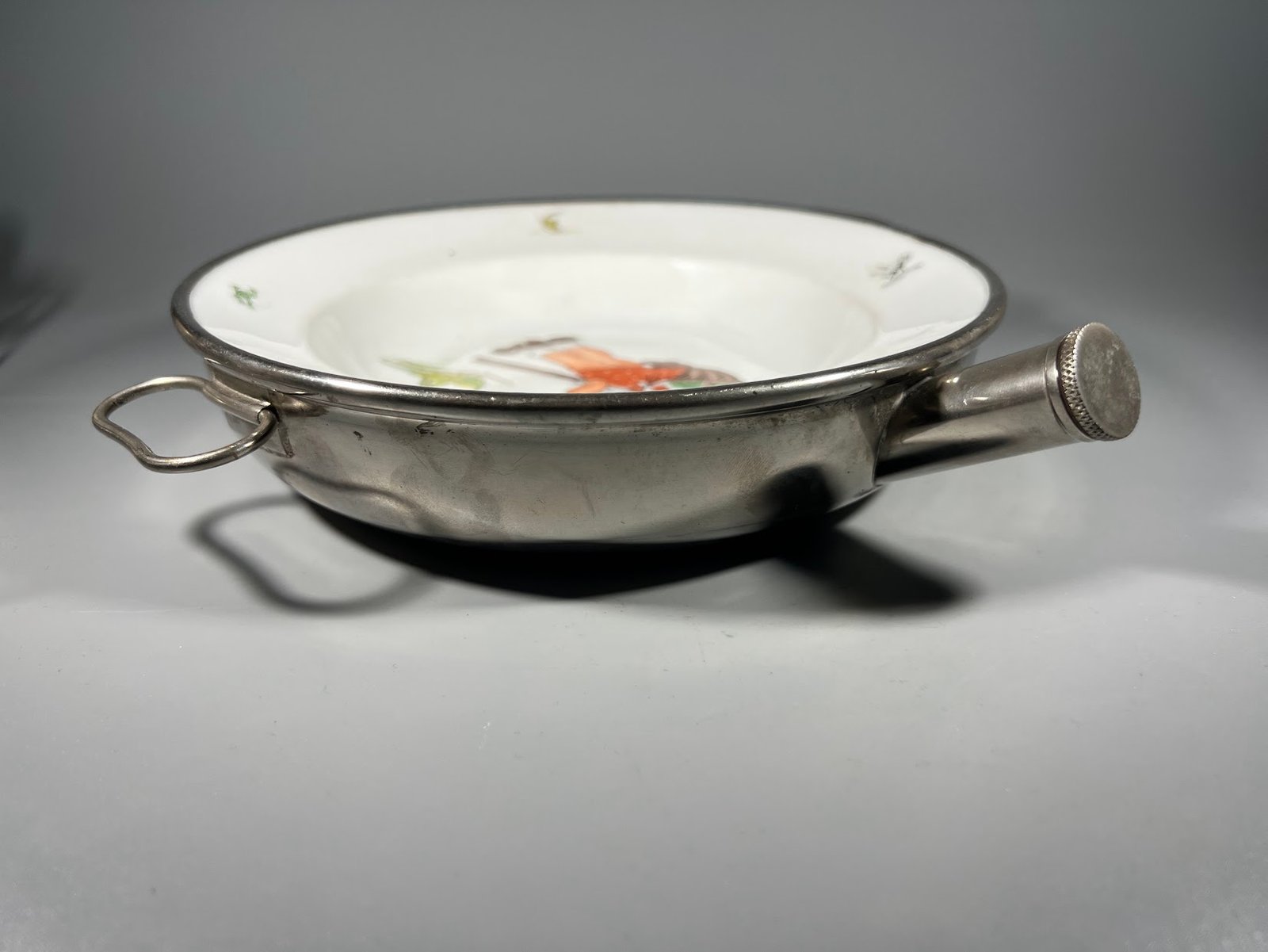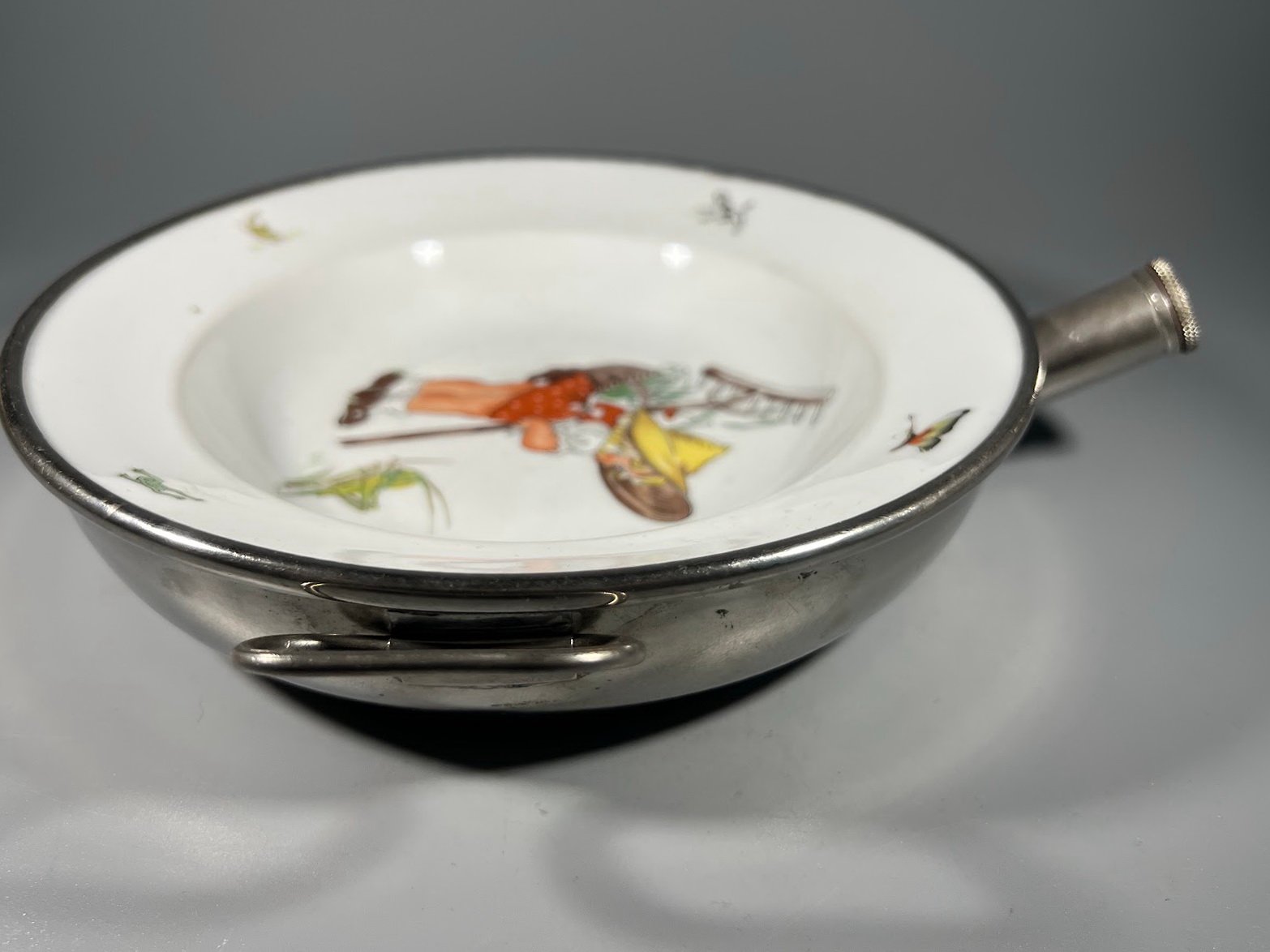 Dubenėlis, lėkštė vaikiškas, šildomas, dvigubu dugnu, antikvarinis. Aukštis 6, dubenėlio skersmuo 17 cm. Ilgis su užsukamu piltuvėliu 20 cm. Kaina 83