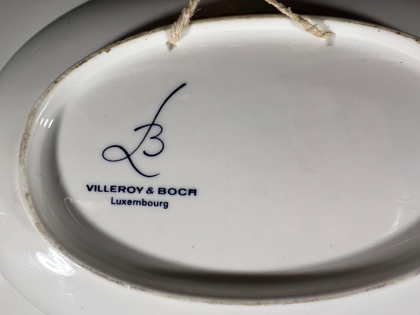 This rare pattern by Villeroy & Boch, the Vieux Luxembourg Septfontaines, features dark blue abstract and floral designs on a white background field. The motif was sold for a very limited period between 1980 and 1989. The mold for the Barber Bowl Basin is likely the rarest piece in the collection, and fairly difficult to find in excellent condition. It has pre drilled holes on the upper back rim so that it can be wired and hung on a wall.