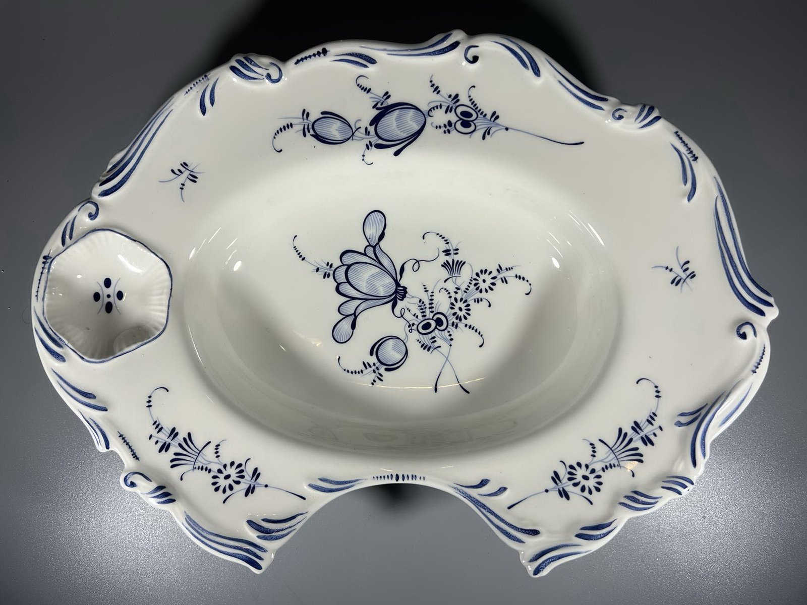 Dubuo barzdaskučio skutimuisi, porcelianinis Villeroy & Boch Vieux Luxembourg Septfontaines mėlynai baltų gėlių rašto skutimo, kirpimo, kirpėjo dubuo. Ilgis 32 cm. Plotis 23 cm. Aukštis 6 cm. Kaina 73