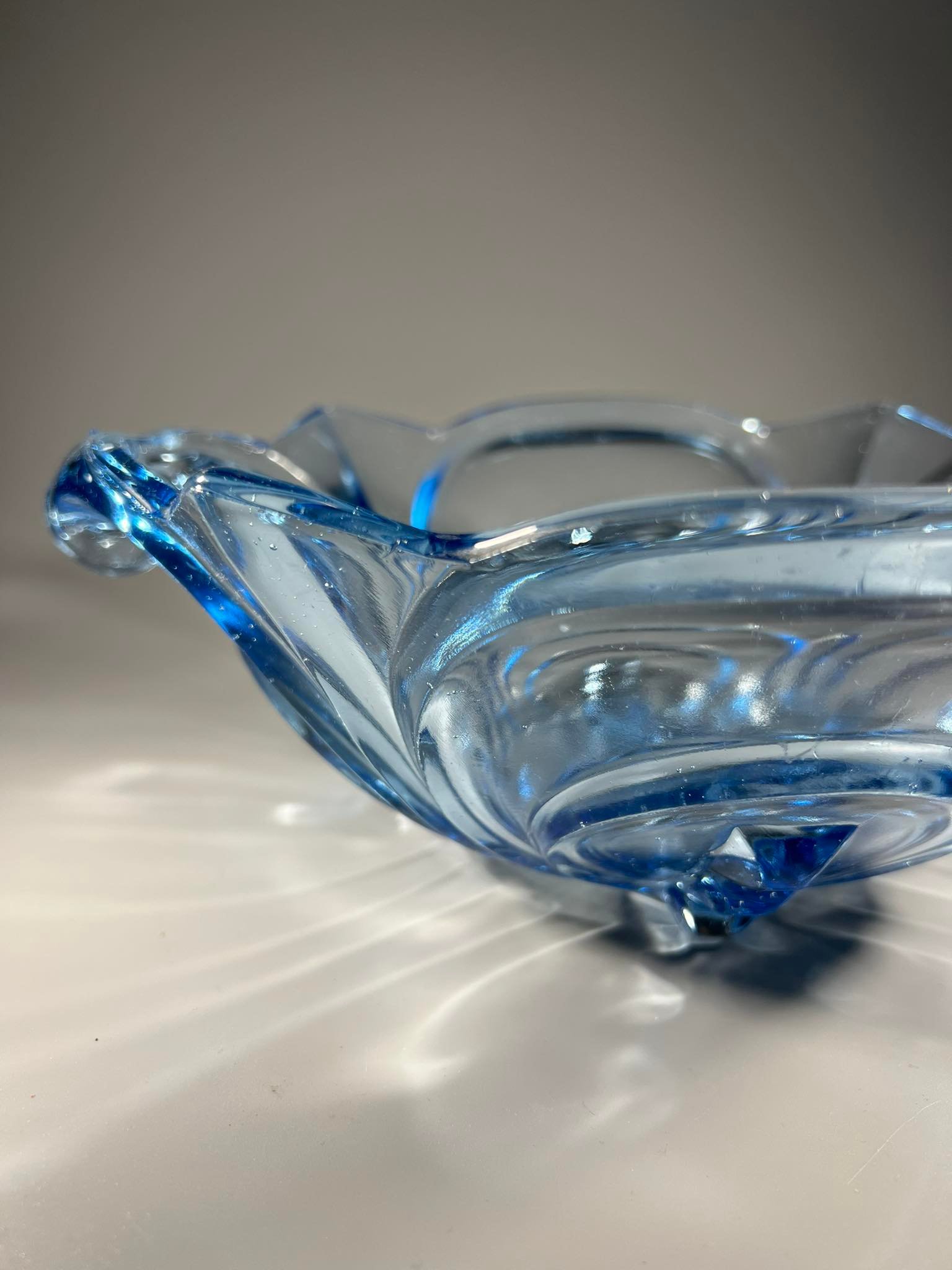 Dubuo, vaza vaisiams Brockwitz, Art Deco stiliaus, melsvo stiklo, antikvarinė. Vokietija. 1930 m. Kaina 58