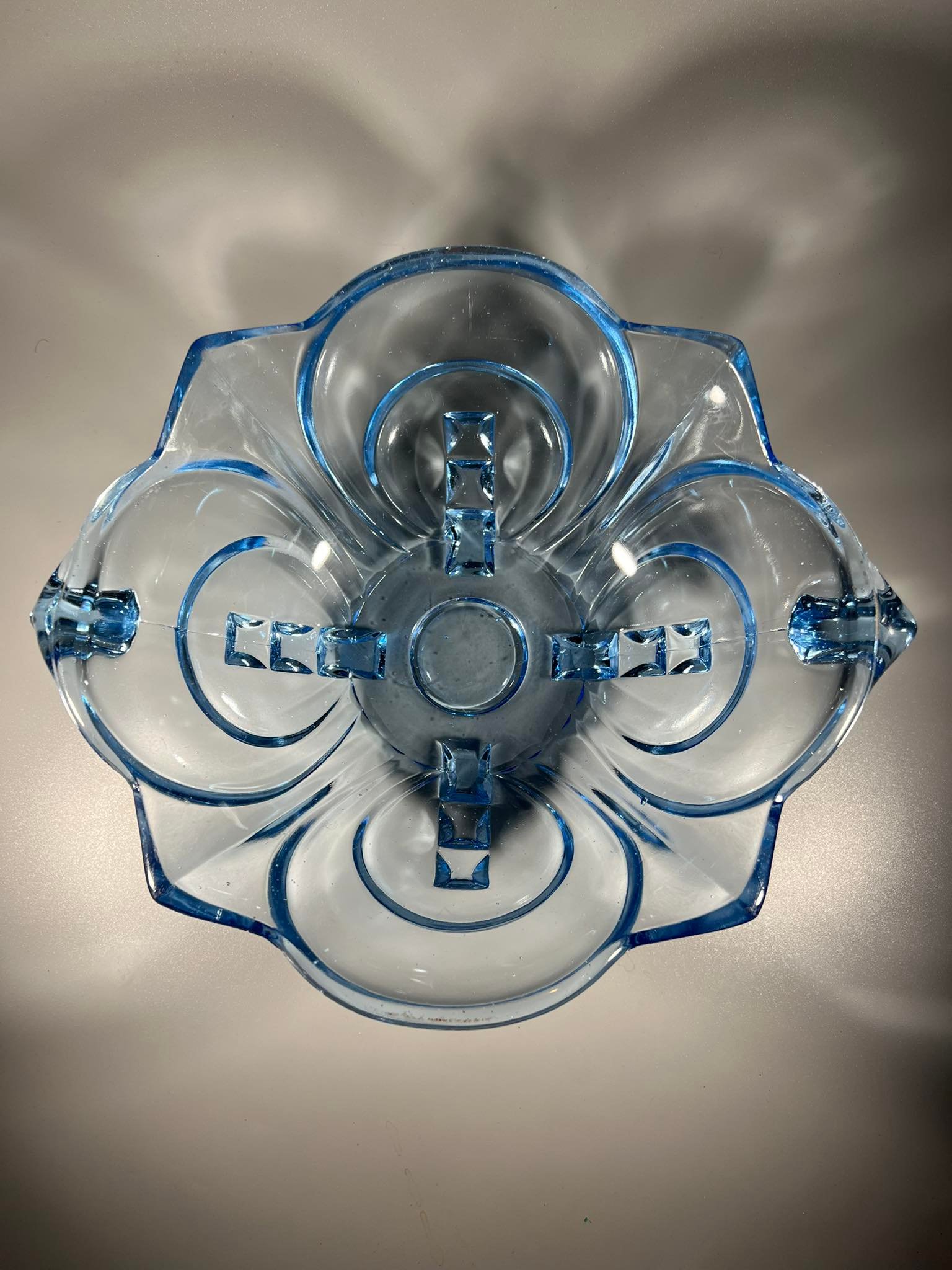 Dubuo, vaza vaisiams Brockwitz, Art Deco stiliaus, melsvo stiklo, antikvarinė. Vokietija. 1930 m. Aukšts 10, skersmuo 29 cm. Kaina 58