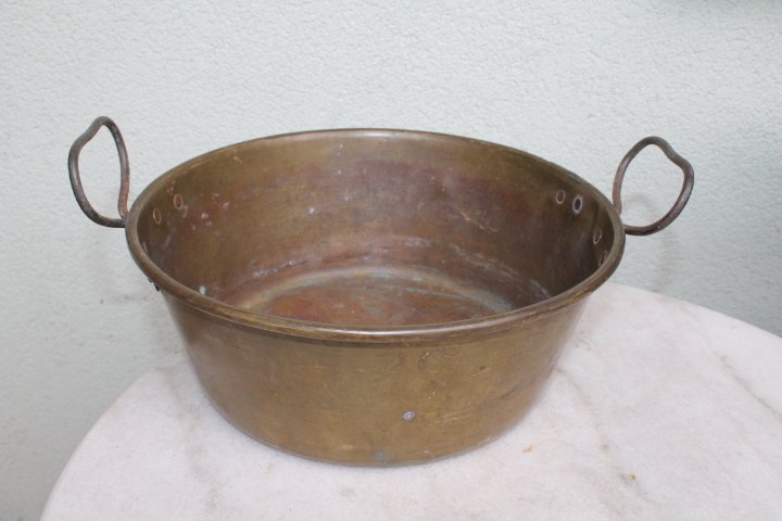 Dubuo žalvarinis su rankenomis. Aukstis be rankenu 11, skersmuo virsuje 27 cm. Kaina 52