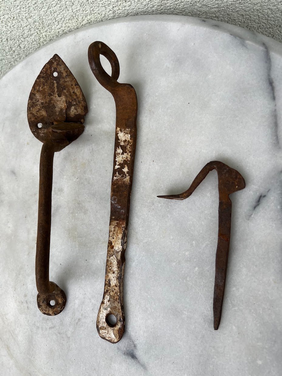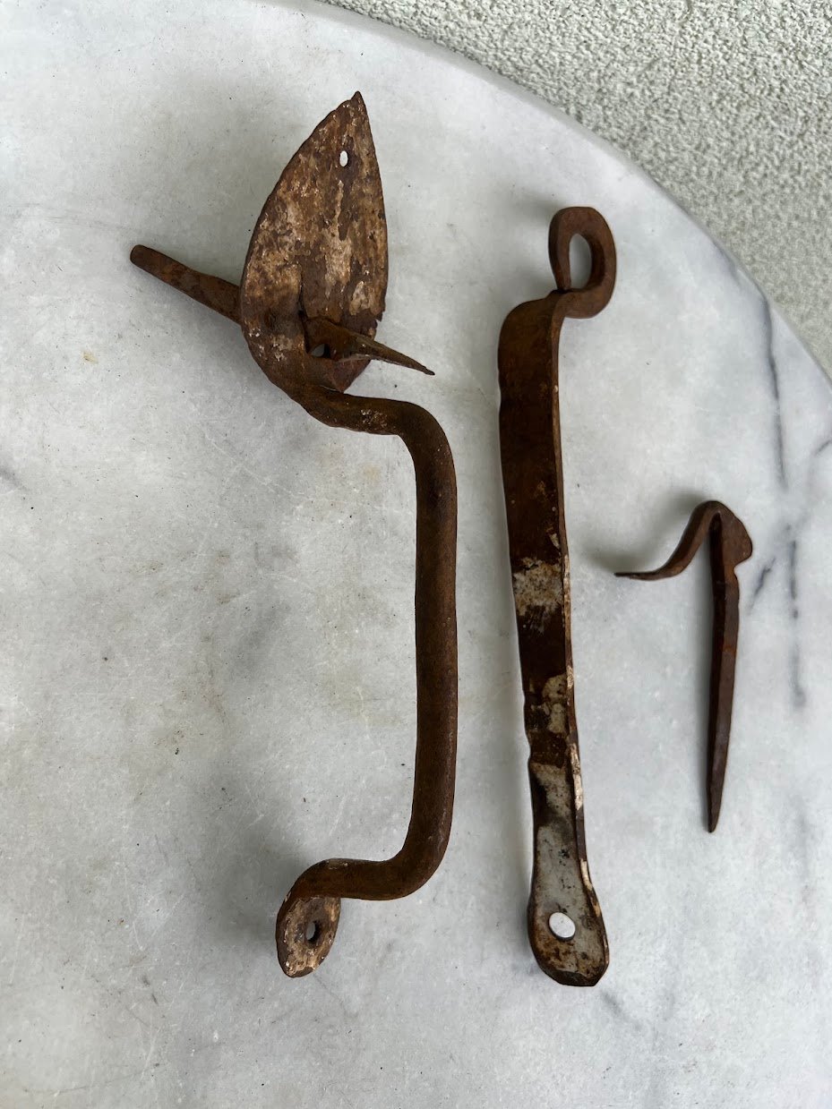 Durų rankena, sklastis, klemka su užkabinimu, kaltinė, senoviška, autentiška, kaimiška rankena, antikvarinė. Komplektas. Kaina 32