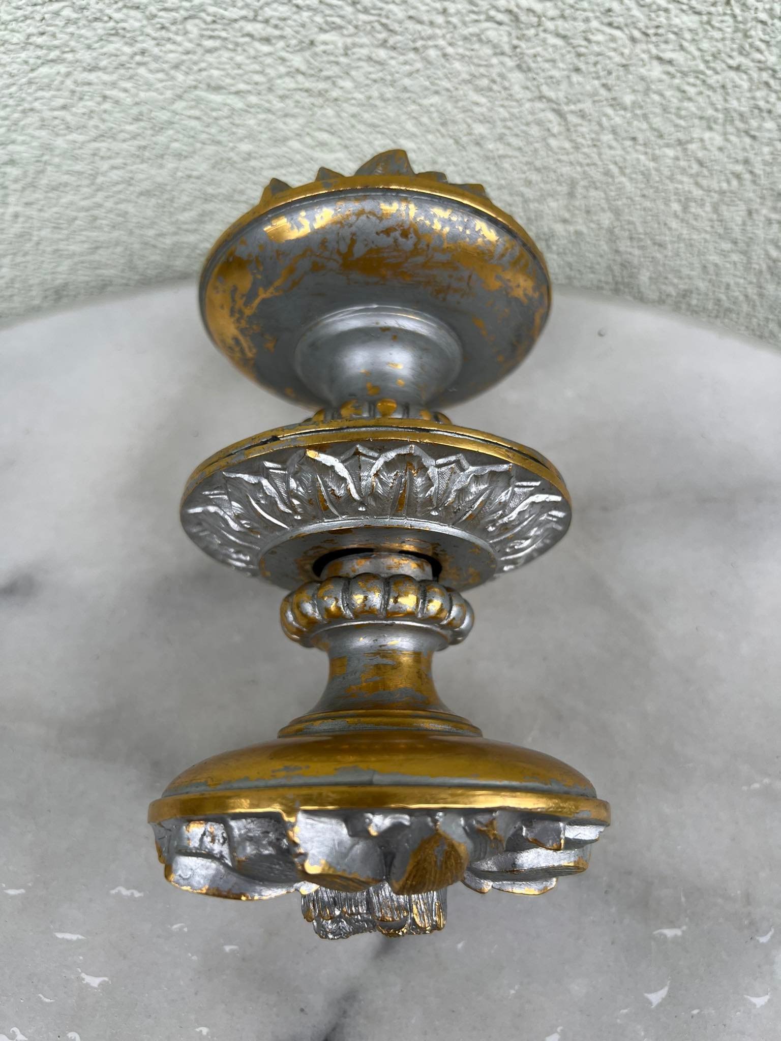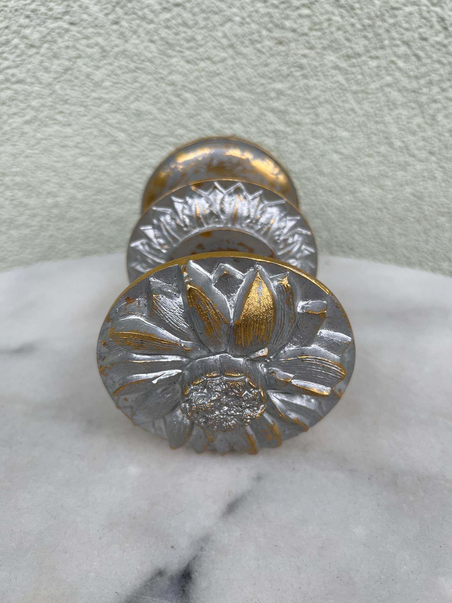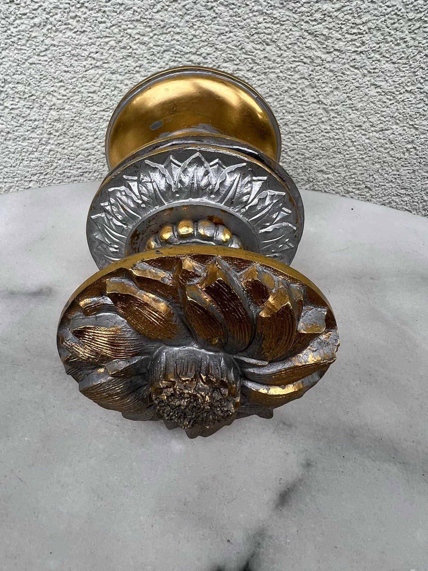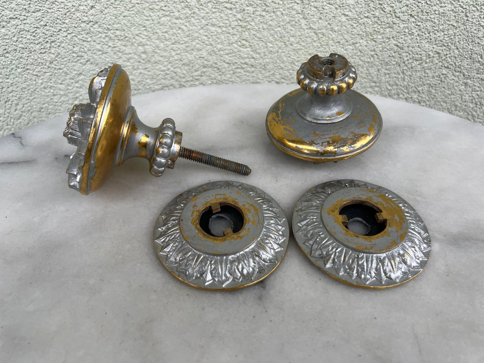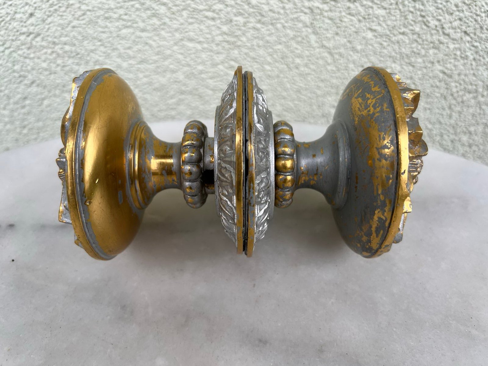 Durų rankenos, rankena bronzinė, buvusi dažyta. Svoris 1,5 kg. Vienos rankenos atsumas nuo sienos 8 cm. Skersmuo 9 cm. Kaina 118