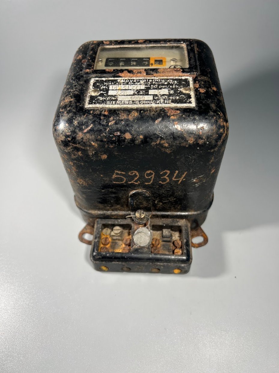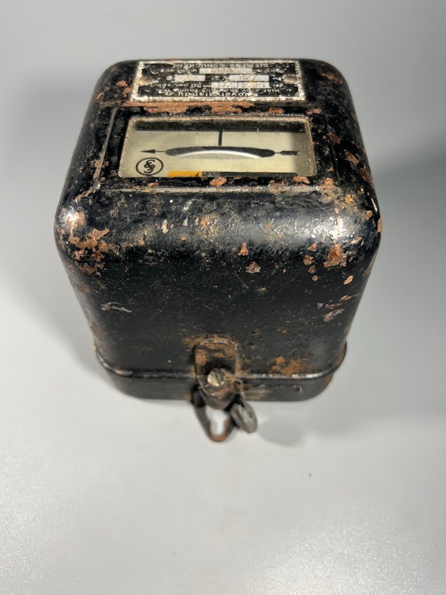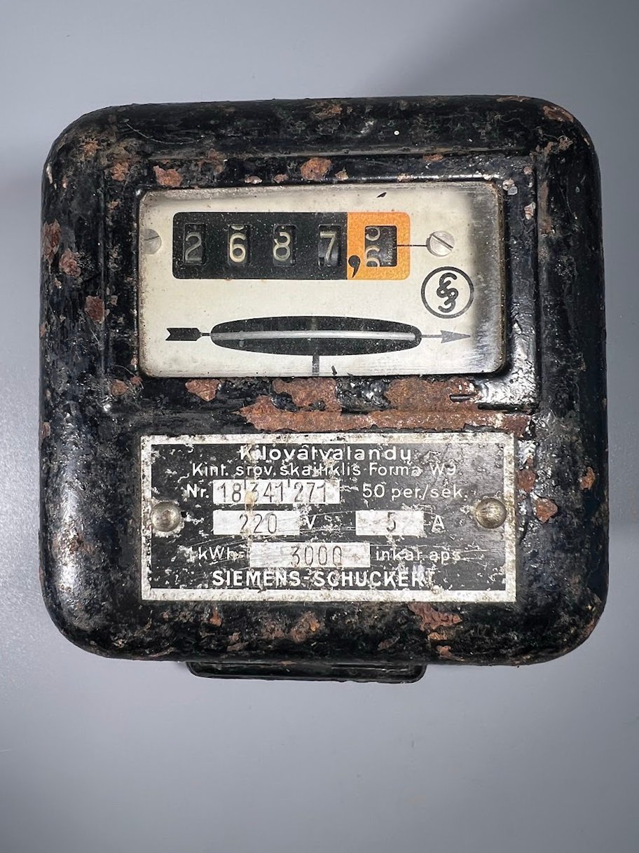 Tarpukariu (1918–1940 m.) Lietuva importavo modernią elektros įrangą iš Vakarų Europos, ypač iš Vokietijos. Didieji gamintojai, tokie kaip „Siemens“, gamino specialias serijas užsienio šalims su užrašais vietine kalba. Lietuvos elektrifikacija: Tuo metu Lietuvoje vyko aktyvi miestų elektrifikacija, o „Siemens“ buvo viena pagrindinių tiekėjų. Lietuviški užrašai buvo reikalingi tam, kad vietos kontrolieriai ir vartotojai galėtų teisingai suprasti prietaiso rodmenis ir techninius parametrus. Techninis standartas: Užrašas „50 per./sek.“ (periodų per sekundę) yra senovinis dažnio (Hz) žymėjimas, kuris taip pat buvo adaptuotas lietuviškai. Šis skaitiklis yra įdomus technikos paveldo objektas, rodantis Lietuvos ryšius su Europos pramone tarpukario laikotarpiu., tai yra tarpukario Lietuvos reliktas su lietuviškais užrašais, jis turi istorinę vertę.