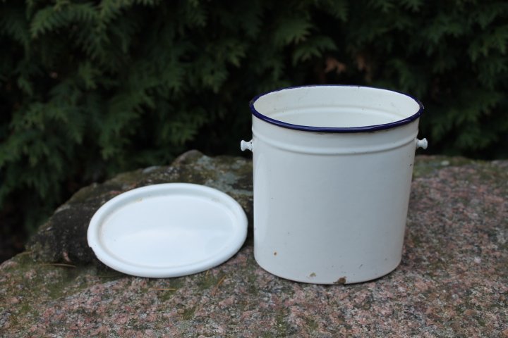 Emaliuotas indas su dangciu. Dydis: 14 X 13 X 8 cm. Kaina 14 Eur.