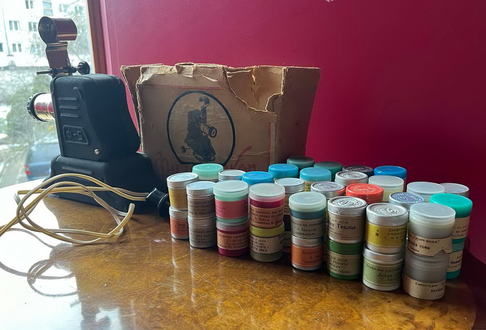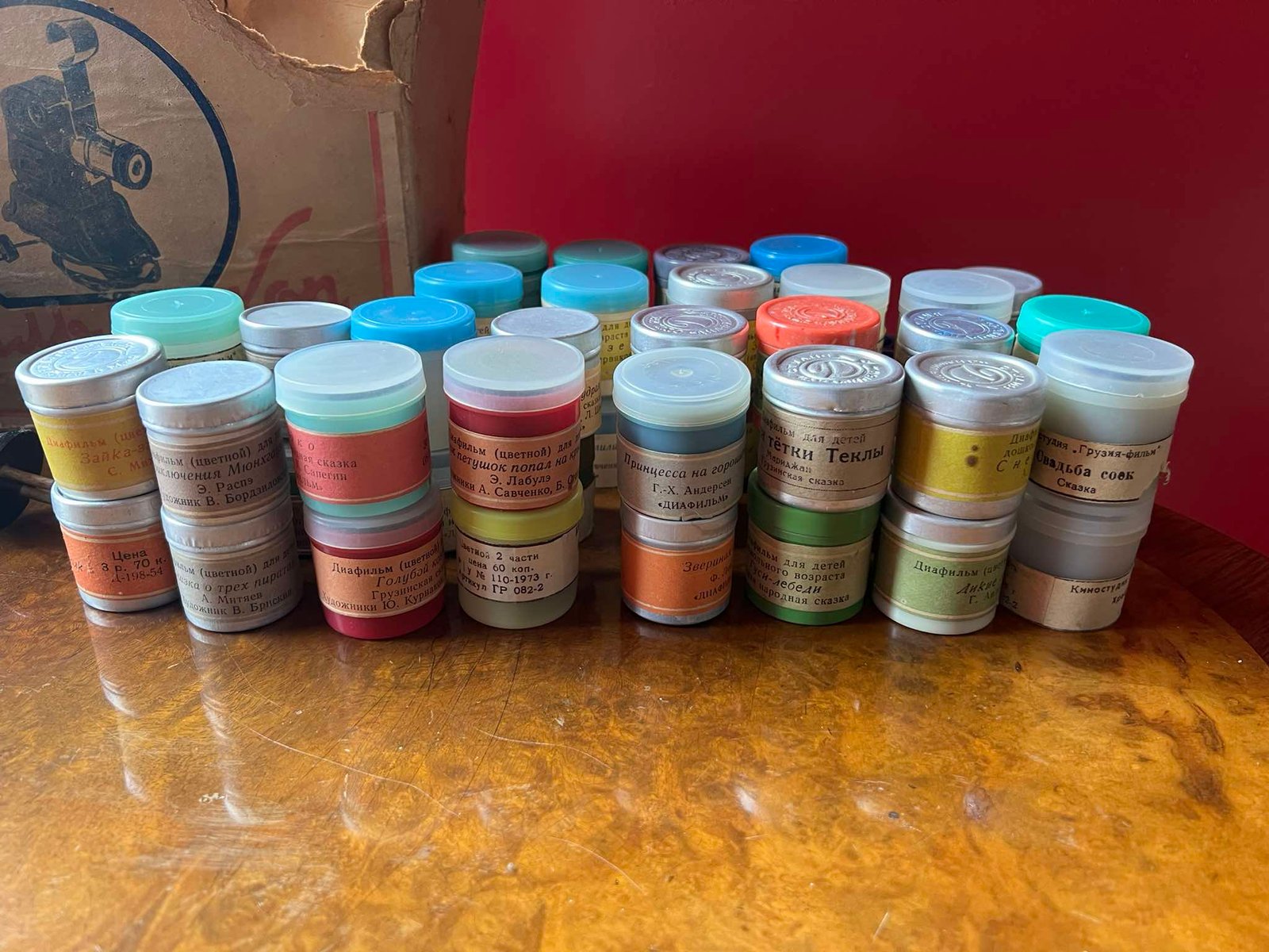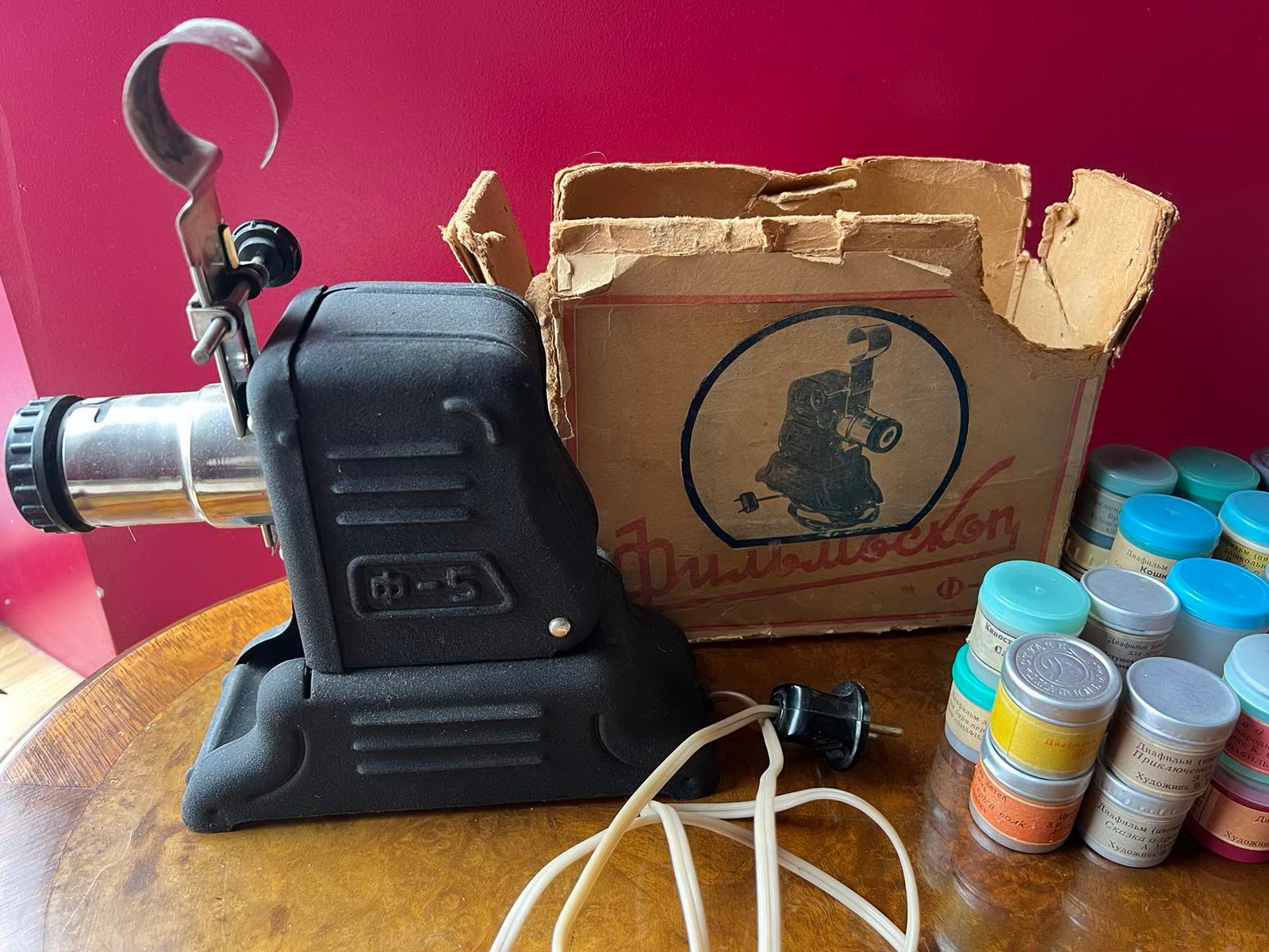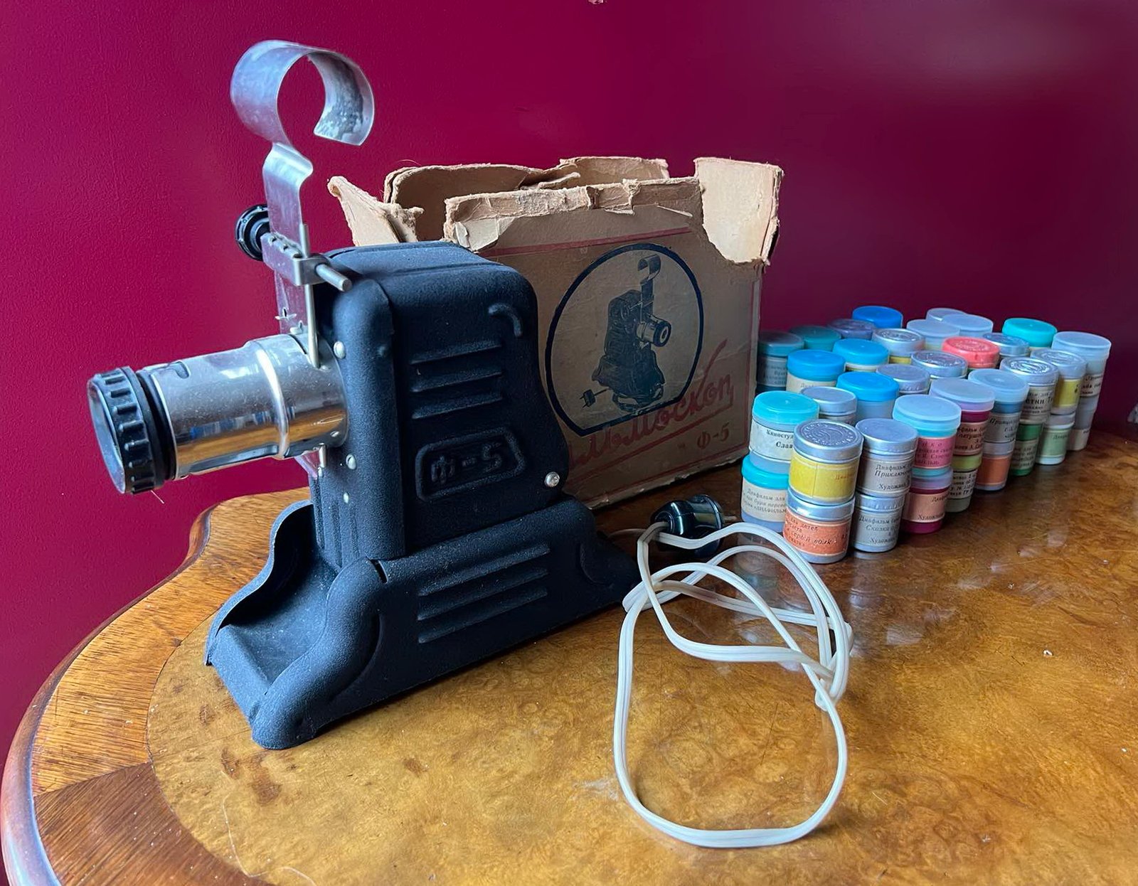 Filmoskopas F5, Фильмоскоп Ф-5, antikvarinis, sovietinis, tarybinių laikų ir 60 vnt. diafilmų. Veikiantis. 1950 m. Kaina 238 už viską.