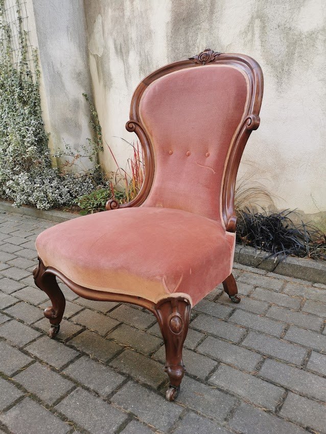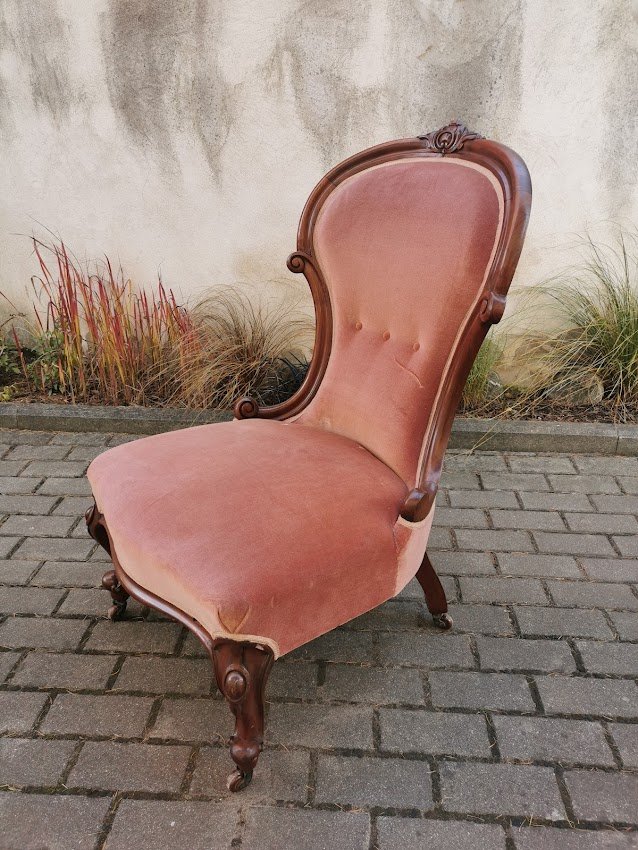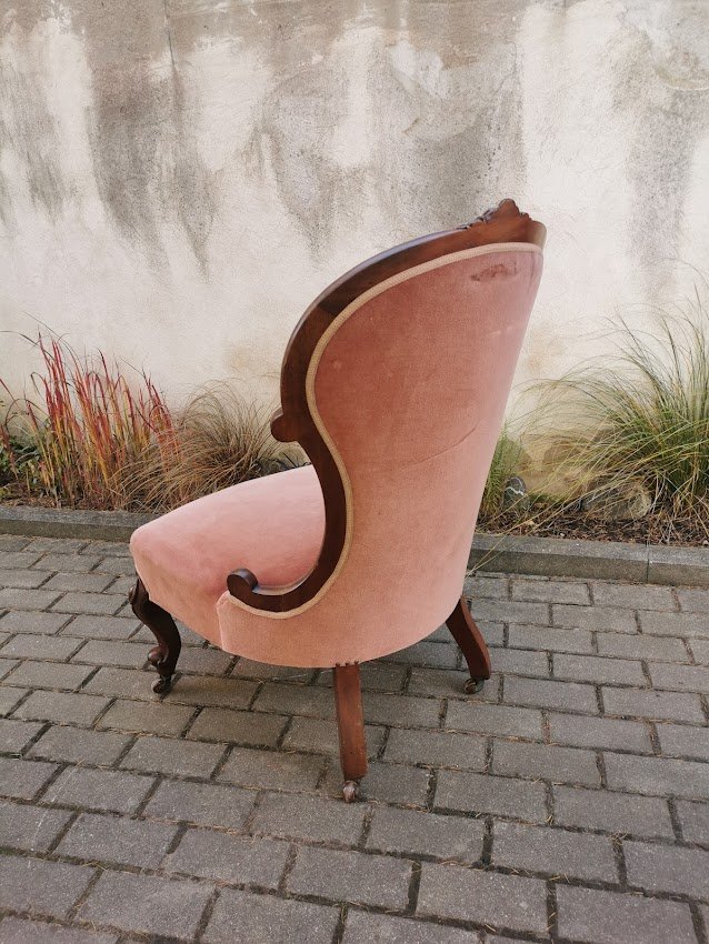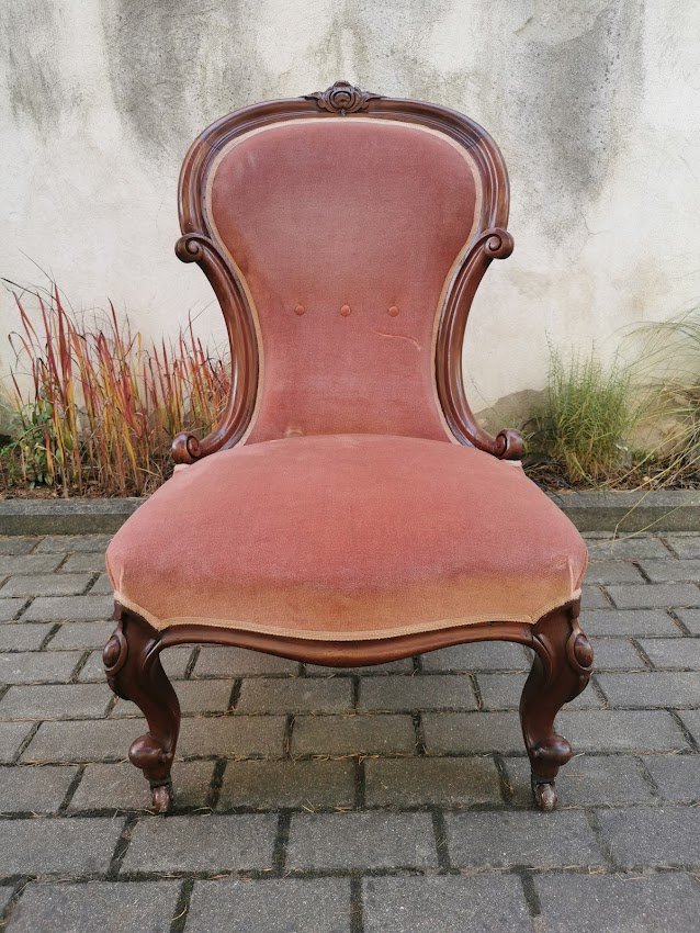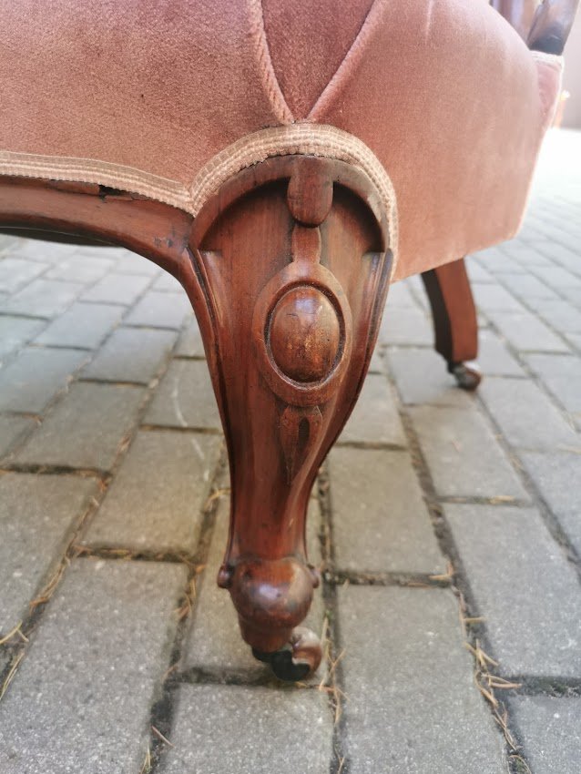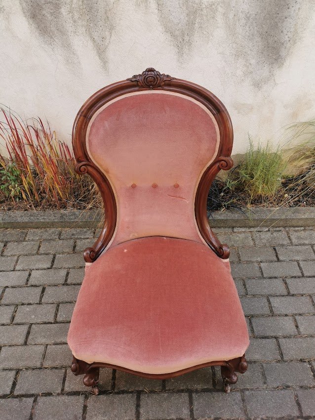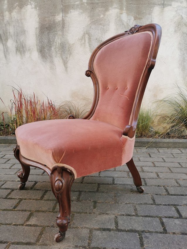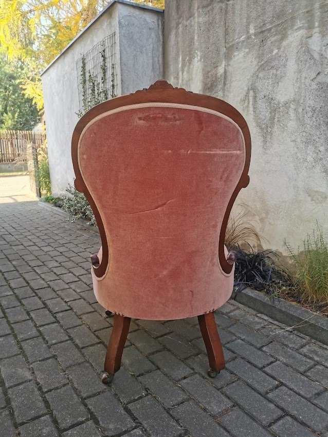 Fotelis, krėslas su ratukais, antikvarinis. Plotis 60, atkaltės aukštis 100, gylis 60 cm. Sėdimosios dalies aukštis 38, gylis 50 cm. Kaina 223