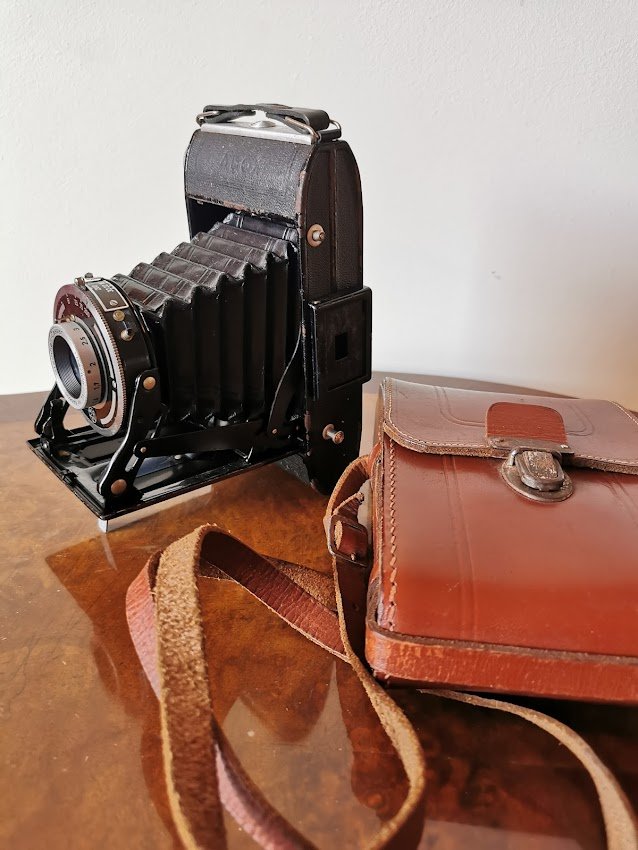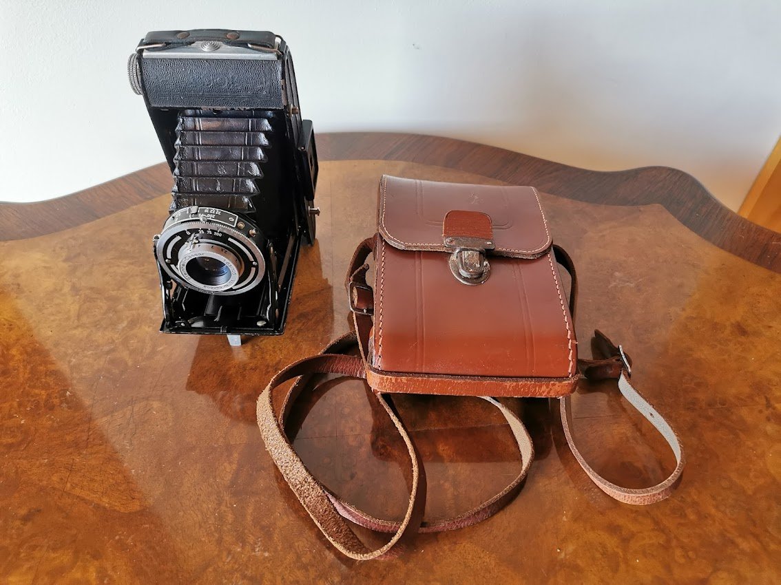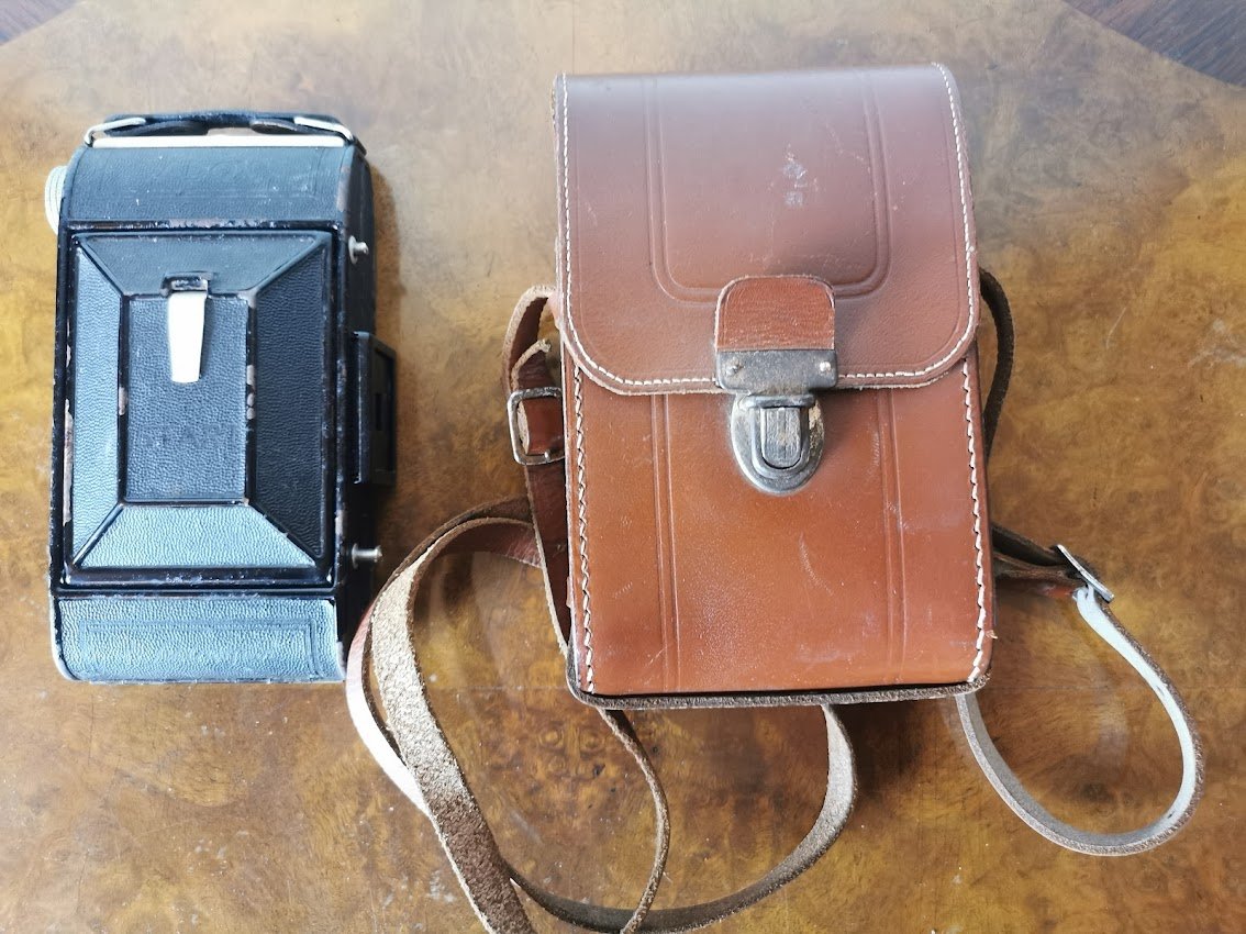 Fotoaparatas Adox su dėklu antikvarinis. Dėklo dydis: 4,5 x 10,5 x 17 cm. Kaina 78