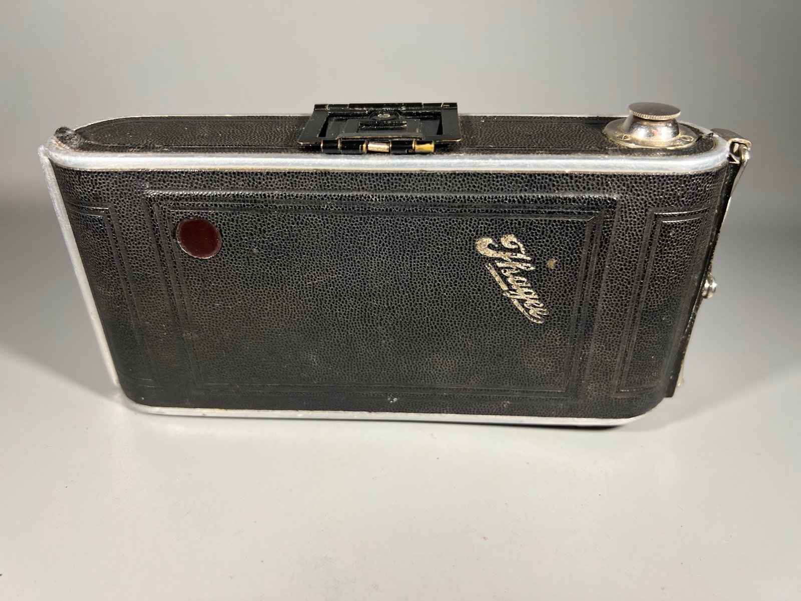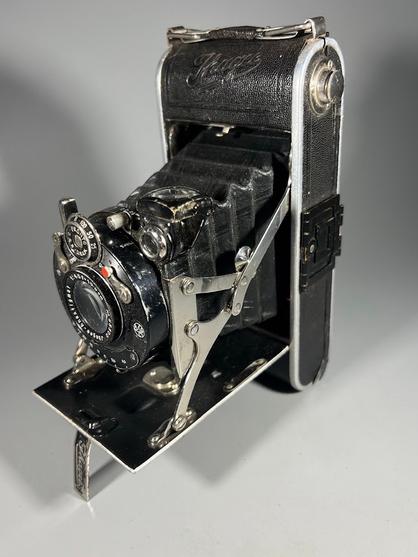 Fotoaparatas dumplinis, sulankstomas, antikvaris, tarpukario laikų Ihagee Auto Ultrix, Vokietija, 1934 m. Kaina 68