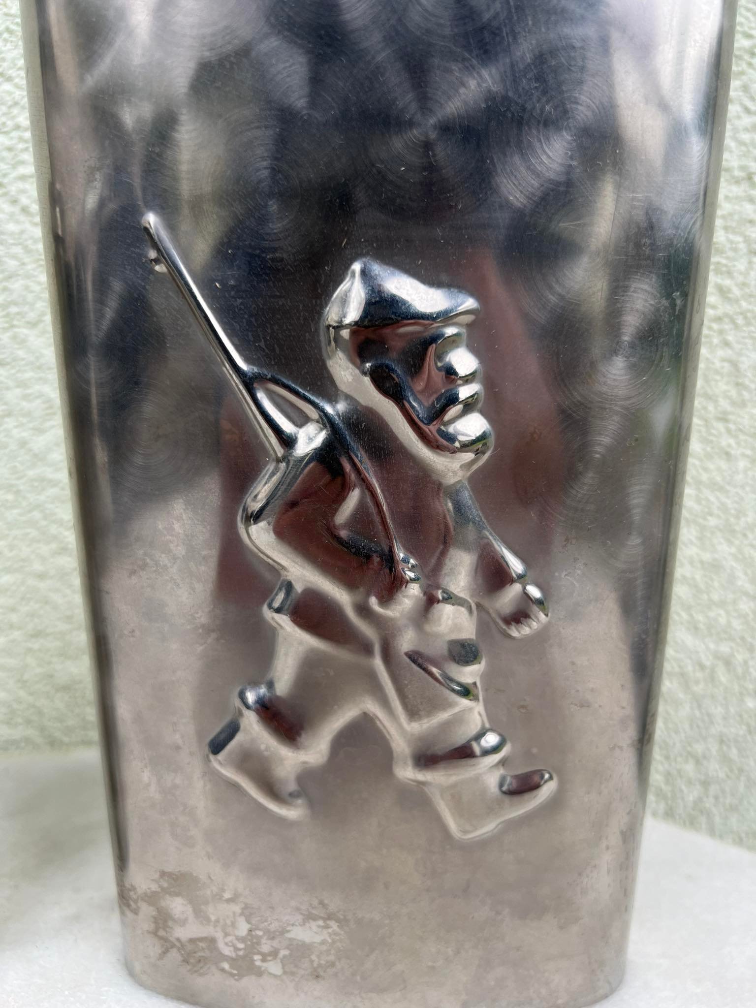 Gertuvės plieninės medžiotojų, gertuvė su reljefiniu medžiotojo atvaizdu. Kaina 16 ir 26