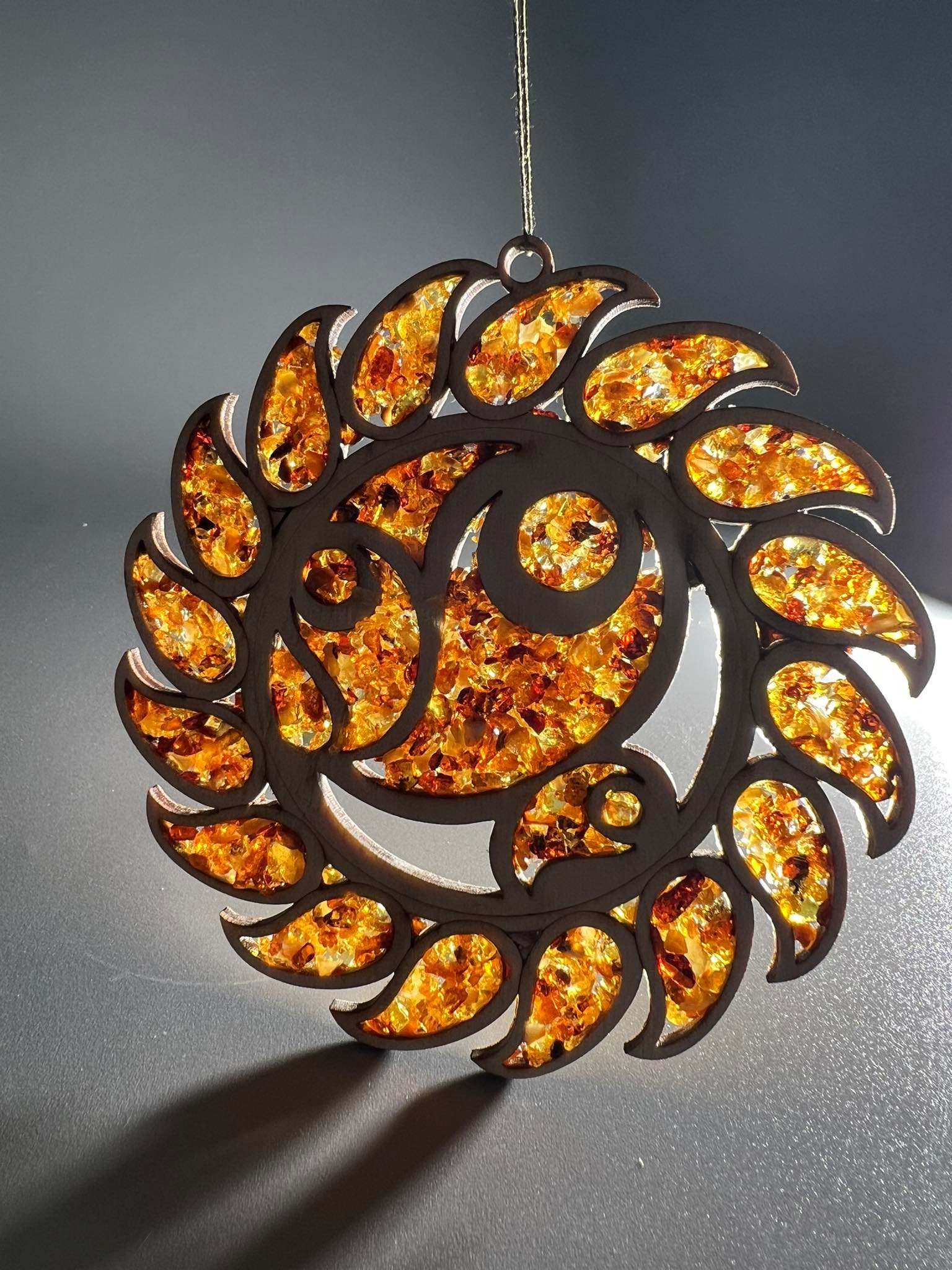 Gintarinis, medinis lietuviškas suvenyras, mandala. Pakabinamas ar klijuojamas su magnetu. Kaina 13