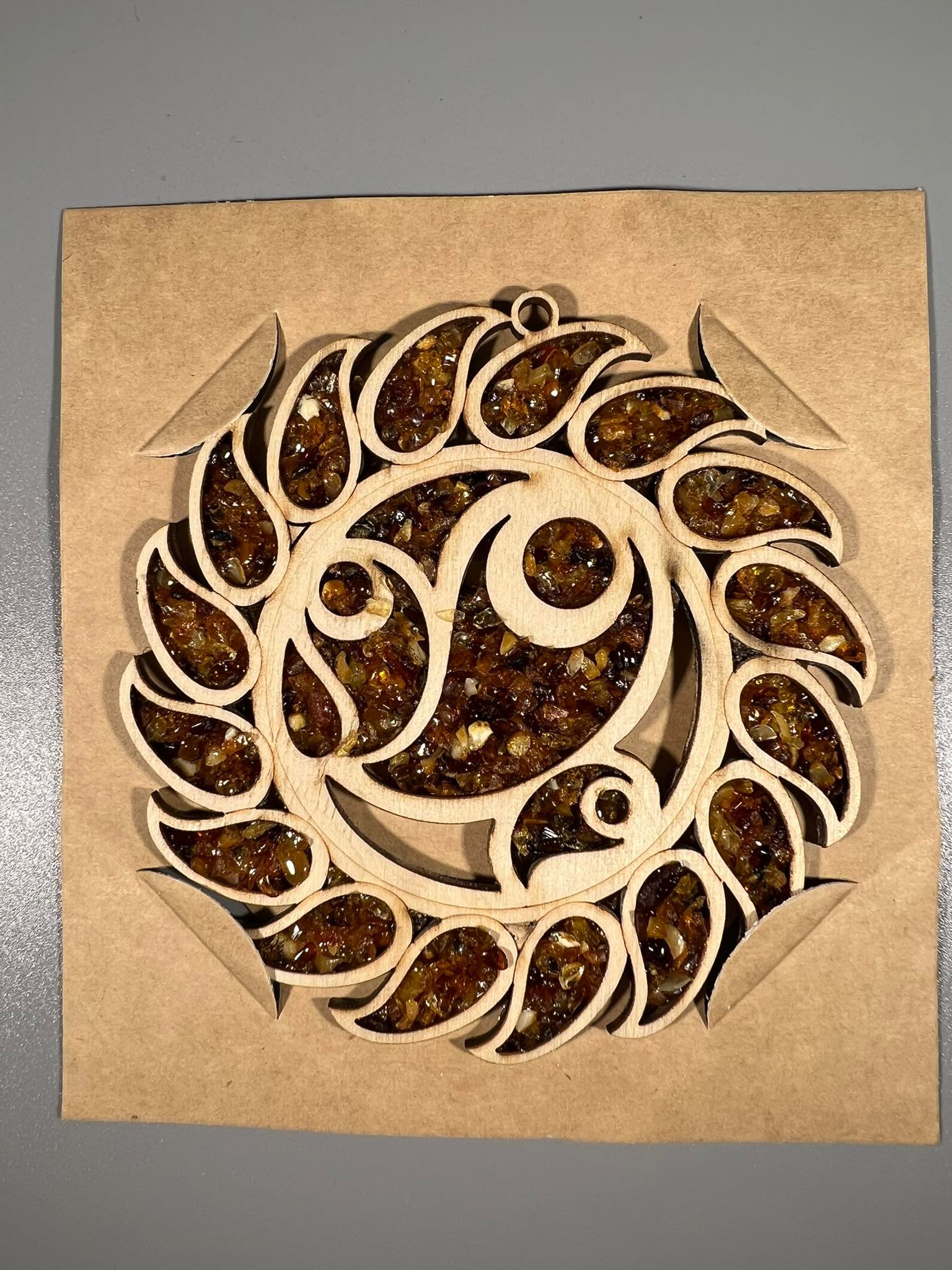 Gintarinis, medinis lietuviškas suvenyras, mandala. Pakabinamas ar klijuojamas su magnetu. Dėžutės dydis: 13 x 14 cm. Kaina 13