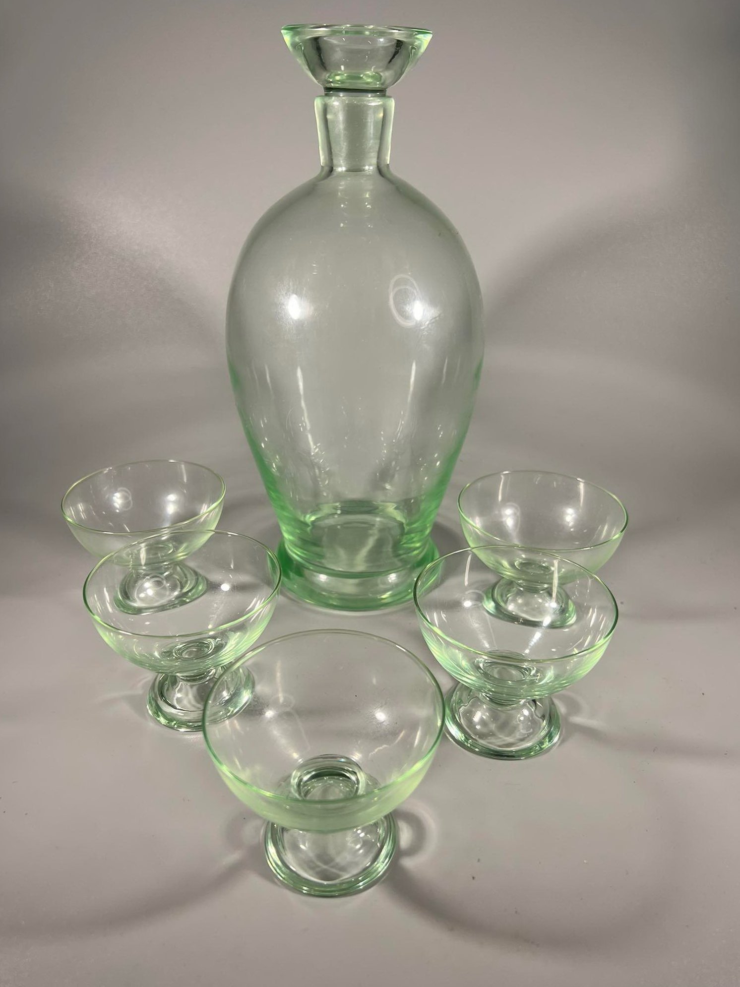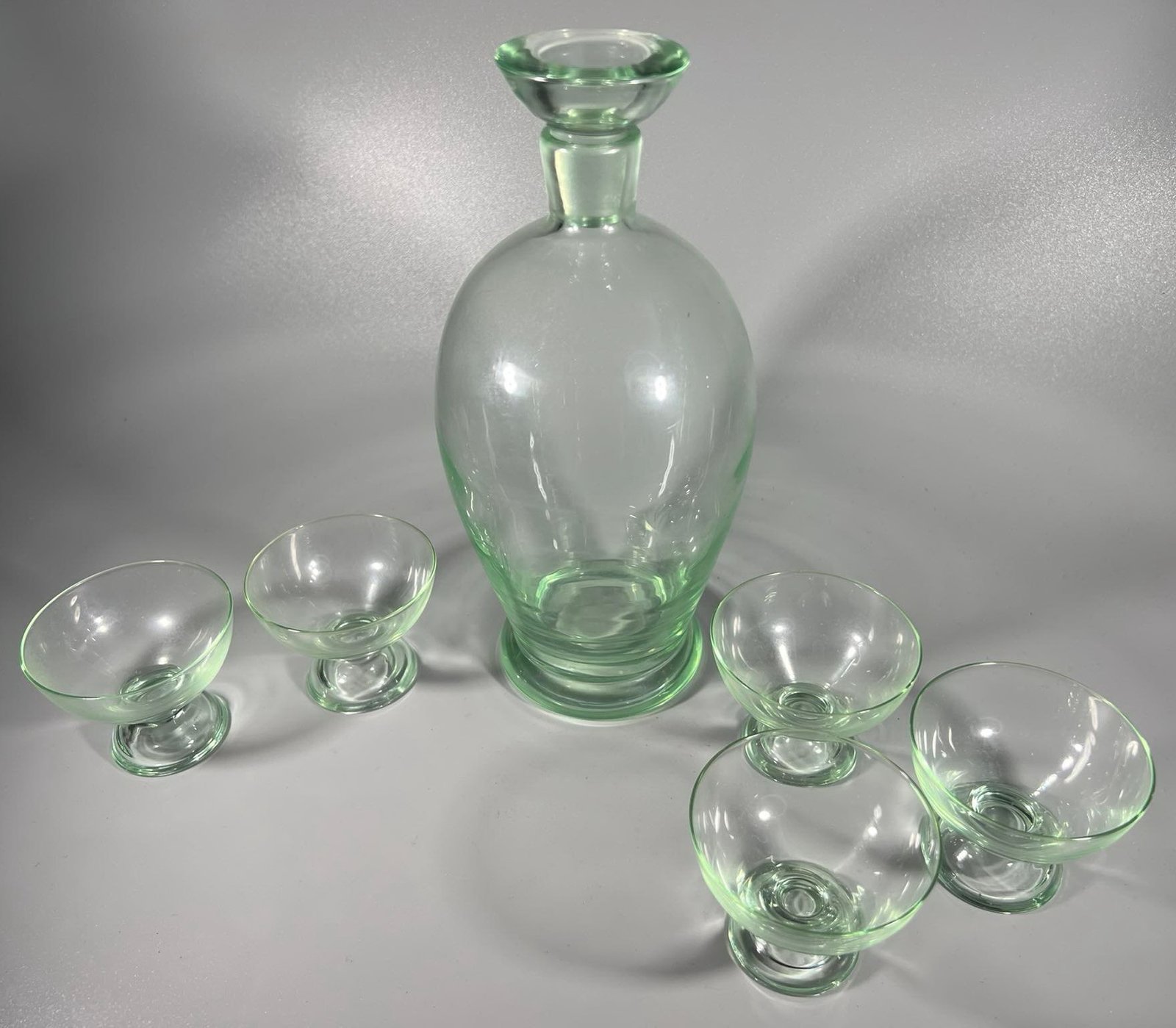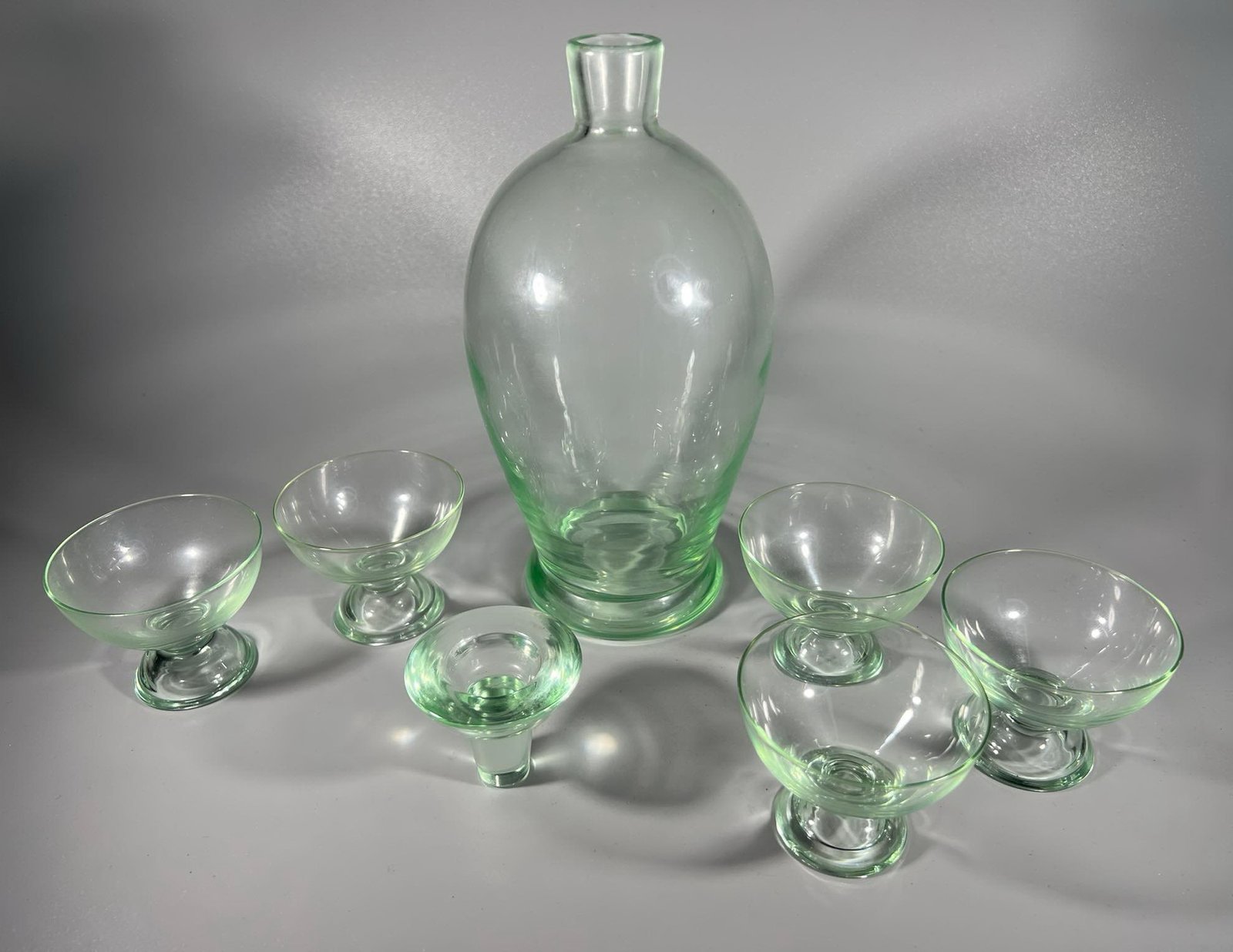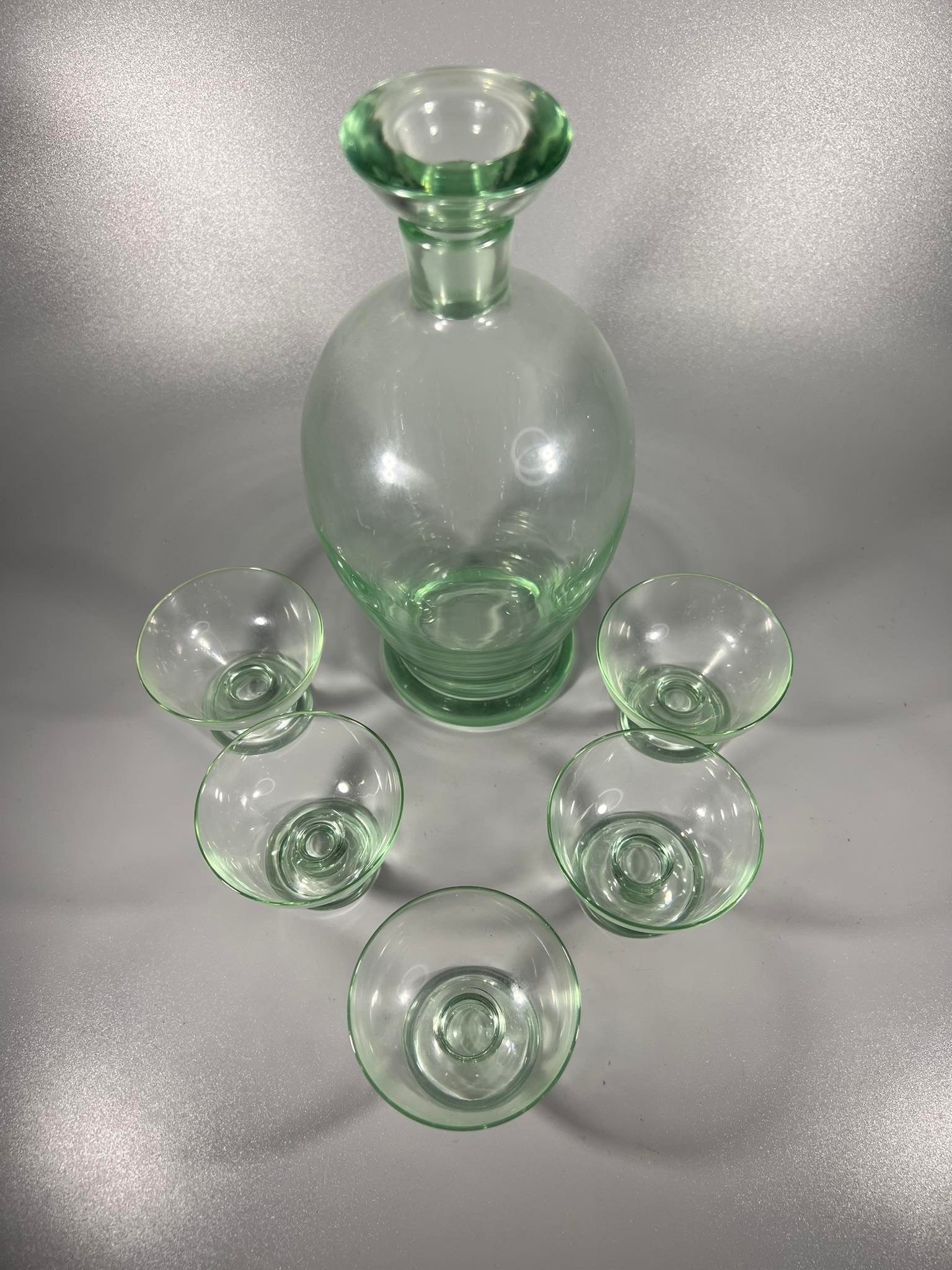 Grafinas su 5 taurelėm, stiklinis, vintažinis. Grafino aukštis 22, taurelės aukštis 5 cm. Kaina 36 už viską