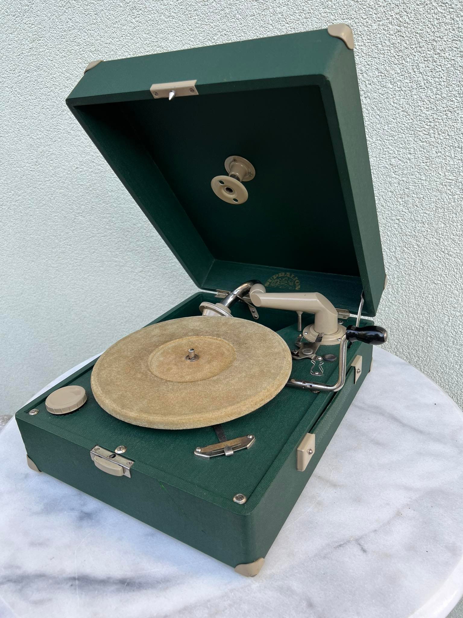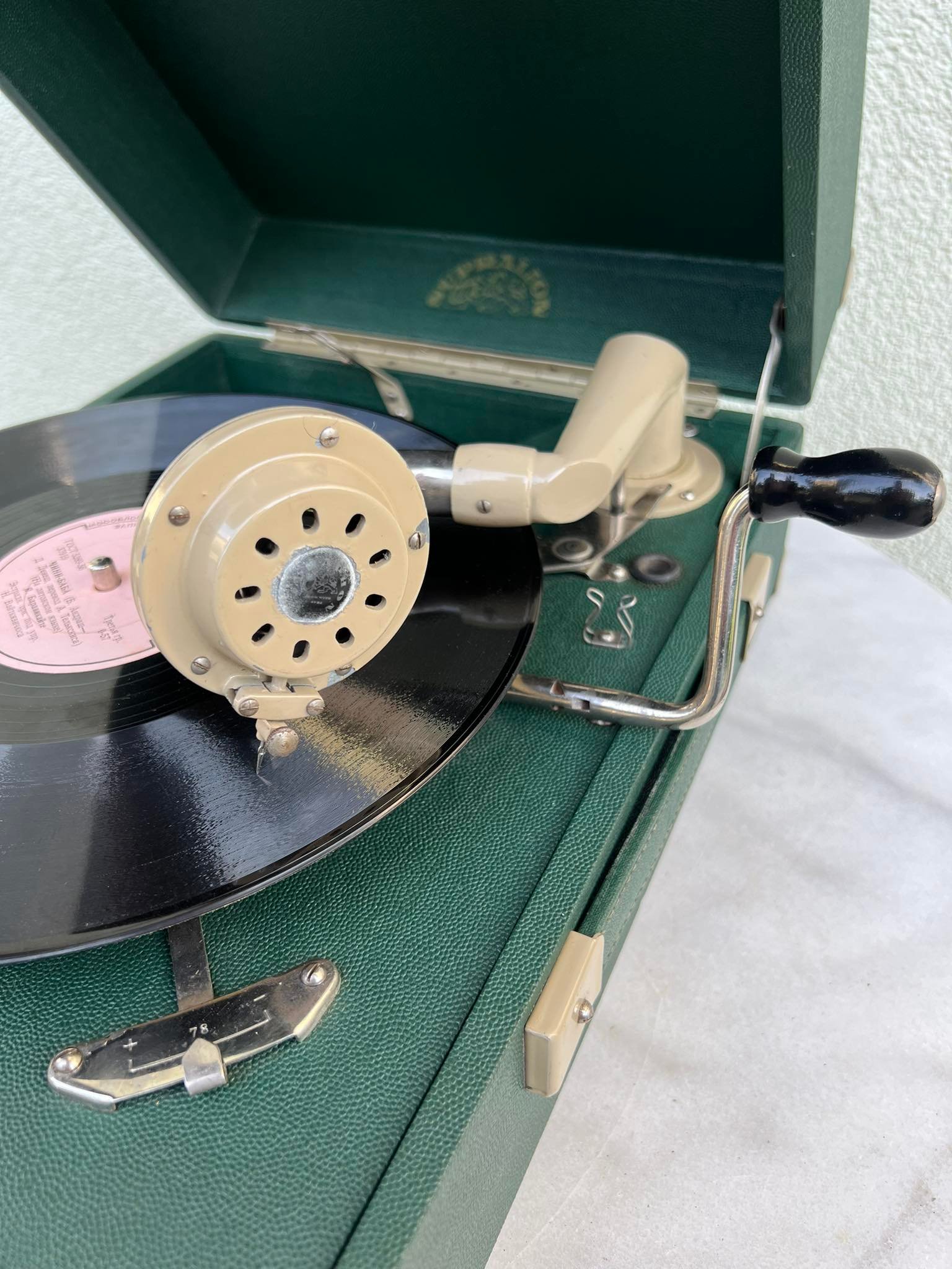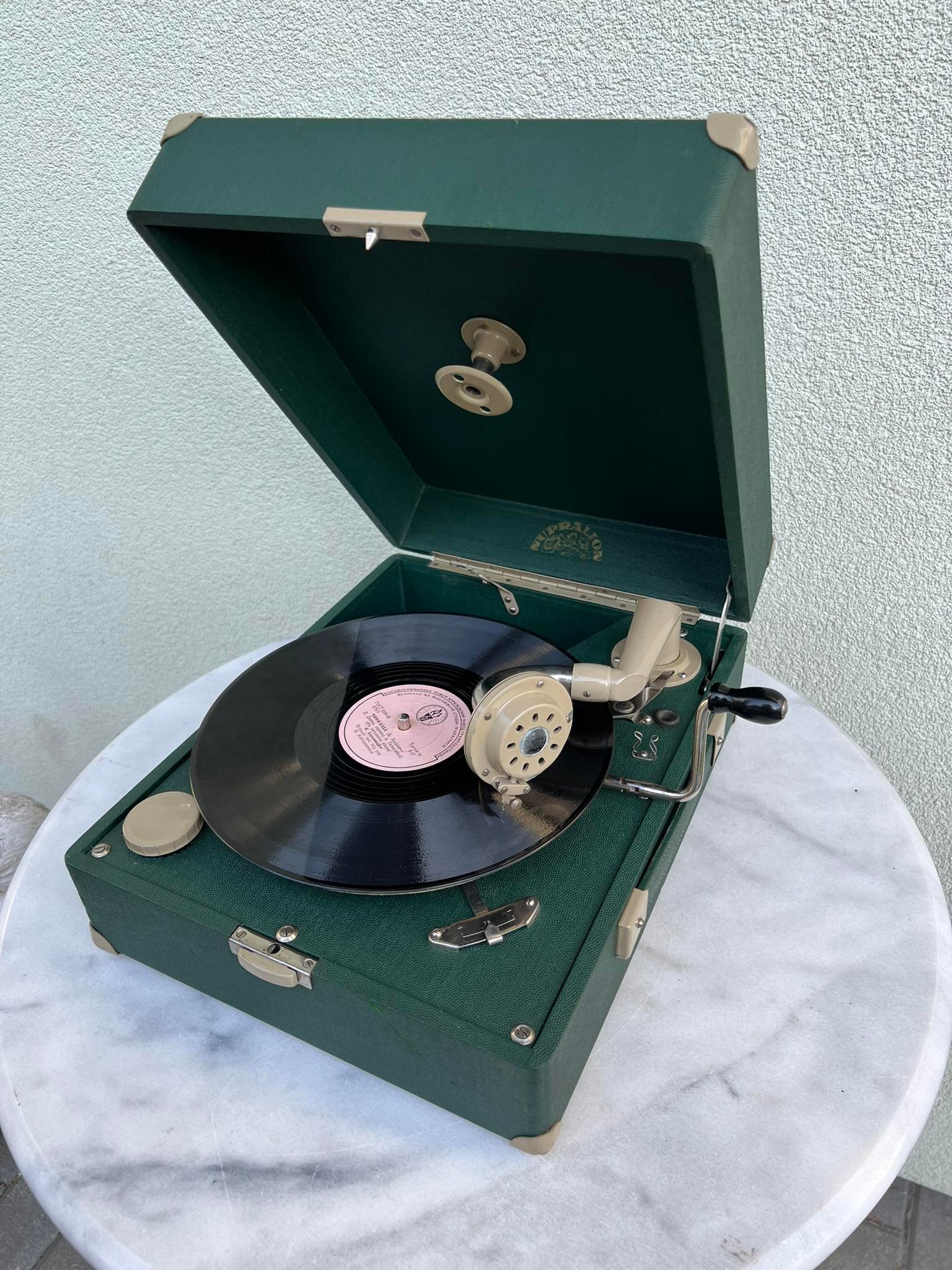 Gramofonas, patefonas antikvarinis  Supraphon Supralion GP03 – Tesla; Praha, Bratislava. Made in Czechoslovakia. 1948 m. Veikiantis, tvarkingas. Dydis: 30 x 14 x 37 cm. Kaina 158