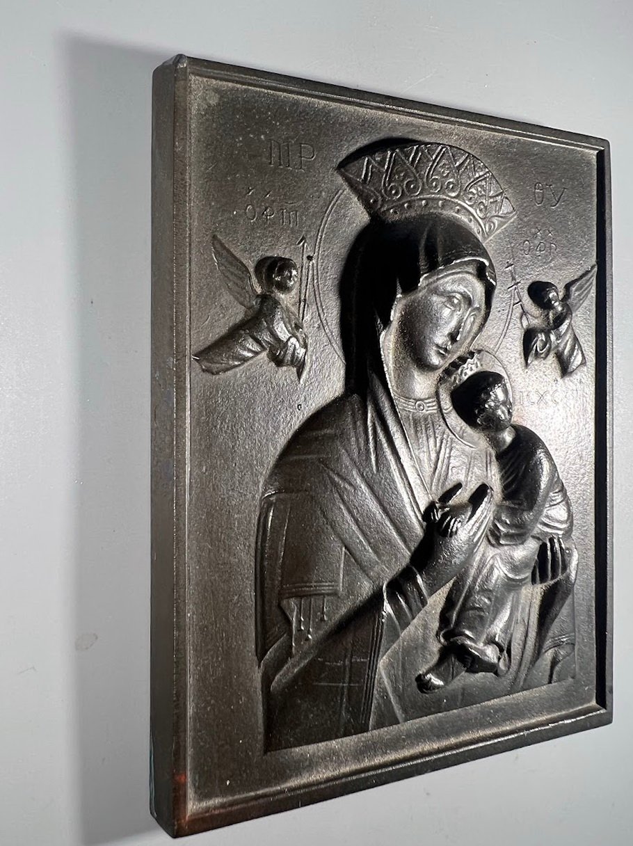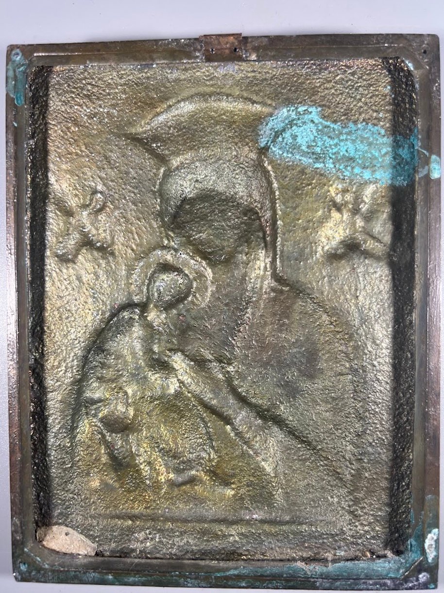 Ikona antikvarinė, metalinė Marija Dievo motina, kūdikis Jėzus ir angelai. Kaina 93
