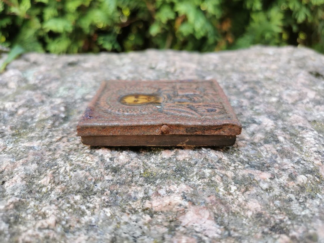 Ikona antikvarinė skardinė, tapyta, mediniu pagrindu. Dydis 1 x 6 x 7,5 cm. Kaina 43