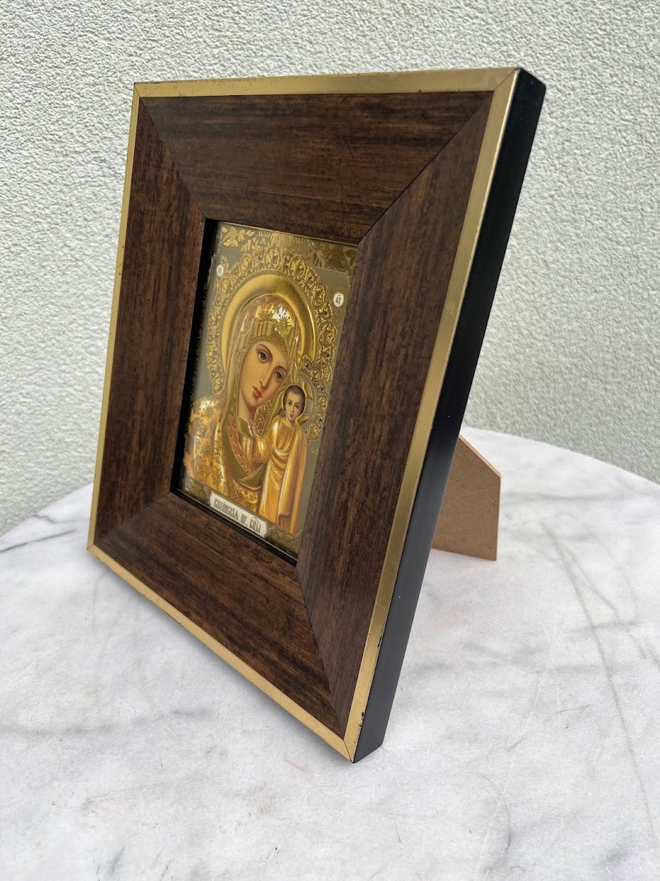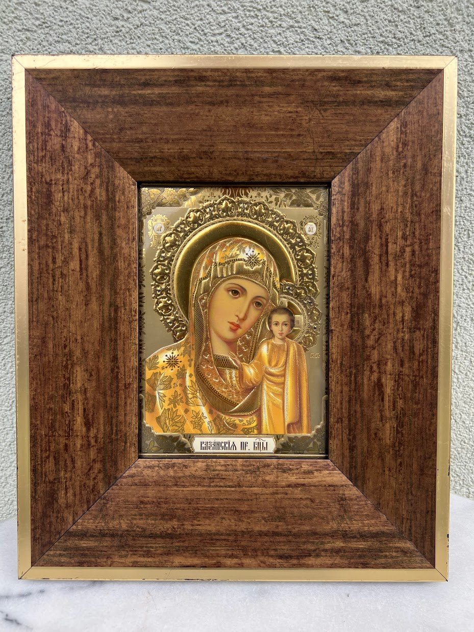Ikona Kazanės Dievo Motinos, Икона Образ Казанской Пресвятой Богородицы. I6orinis r4mo dydis: 25 x 30 cm. Pastatoma, pakabinama. Plastmasinis r4mas su stiklu. Kaina 38