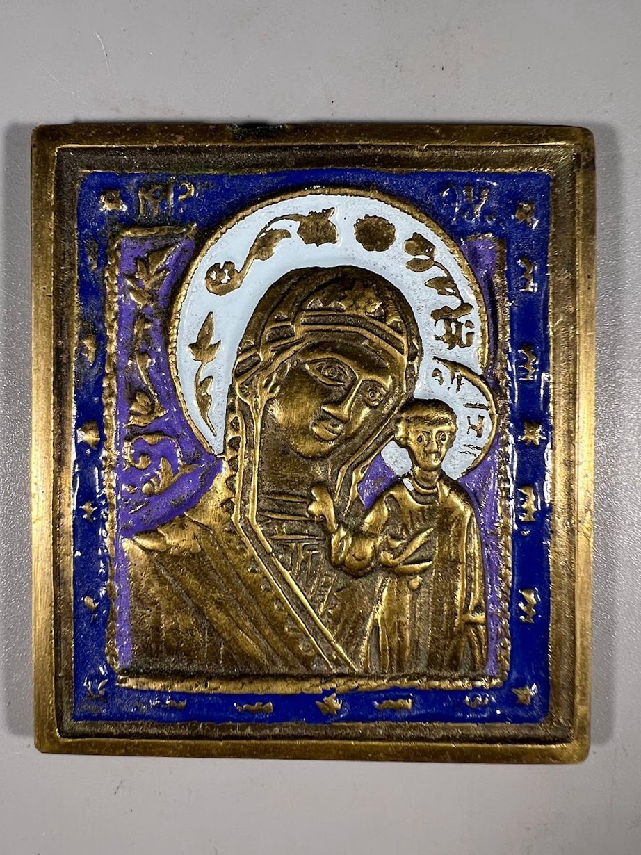 Ikona, plaketė Šv. Marija su kūdikiu, antikvarinė, stačiatikių, krikščionių ortodoksų, pravoslavų, puošta 2 spalvų emale. Kaina 177
