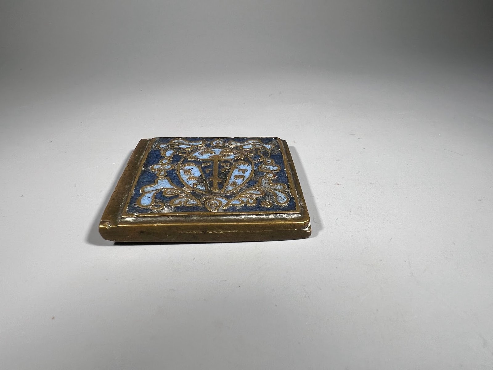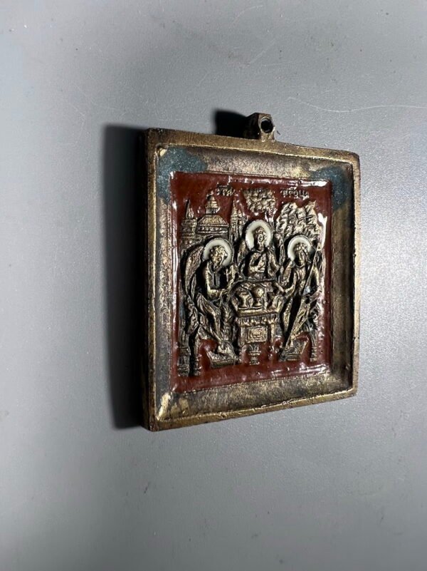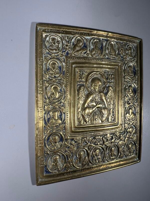 Dydis 5,5 x 5,5 cm. Ikona nuliedinta iš vario lydinio (bronzos arba žalvario) ir dekoruota mėlynu bei balto emalio sluoksniais.