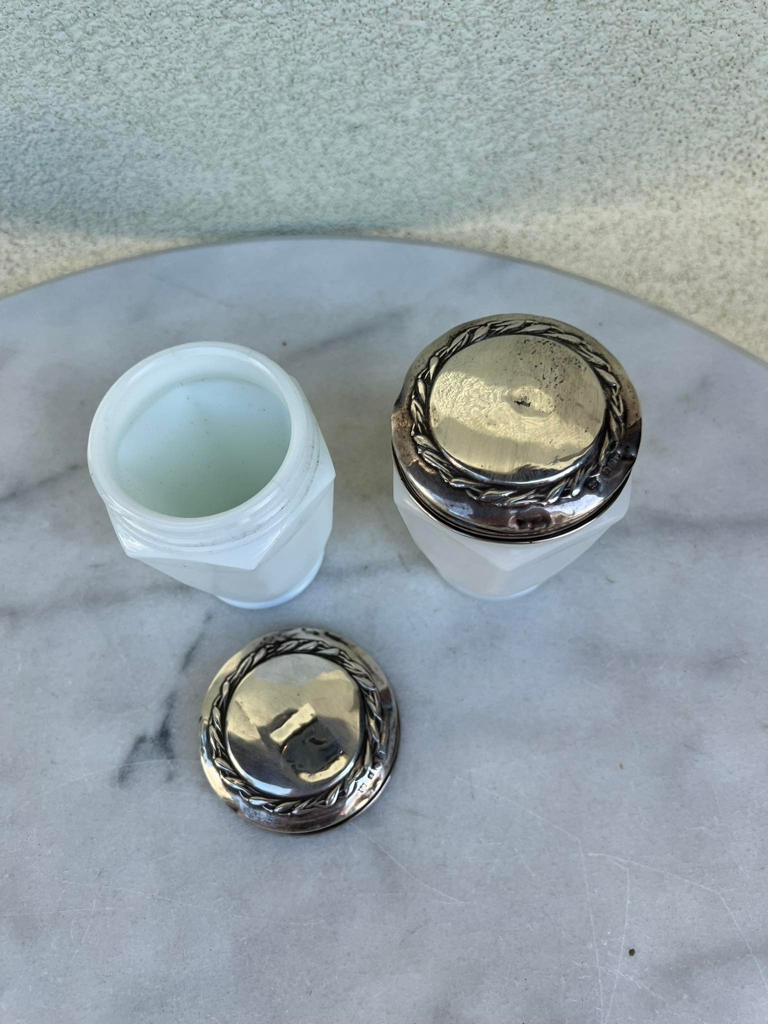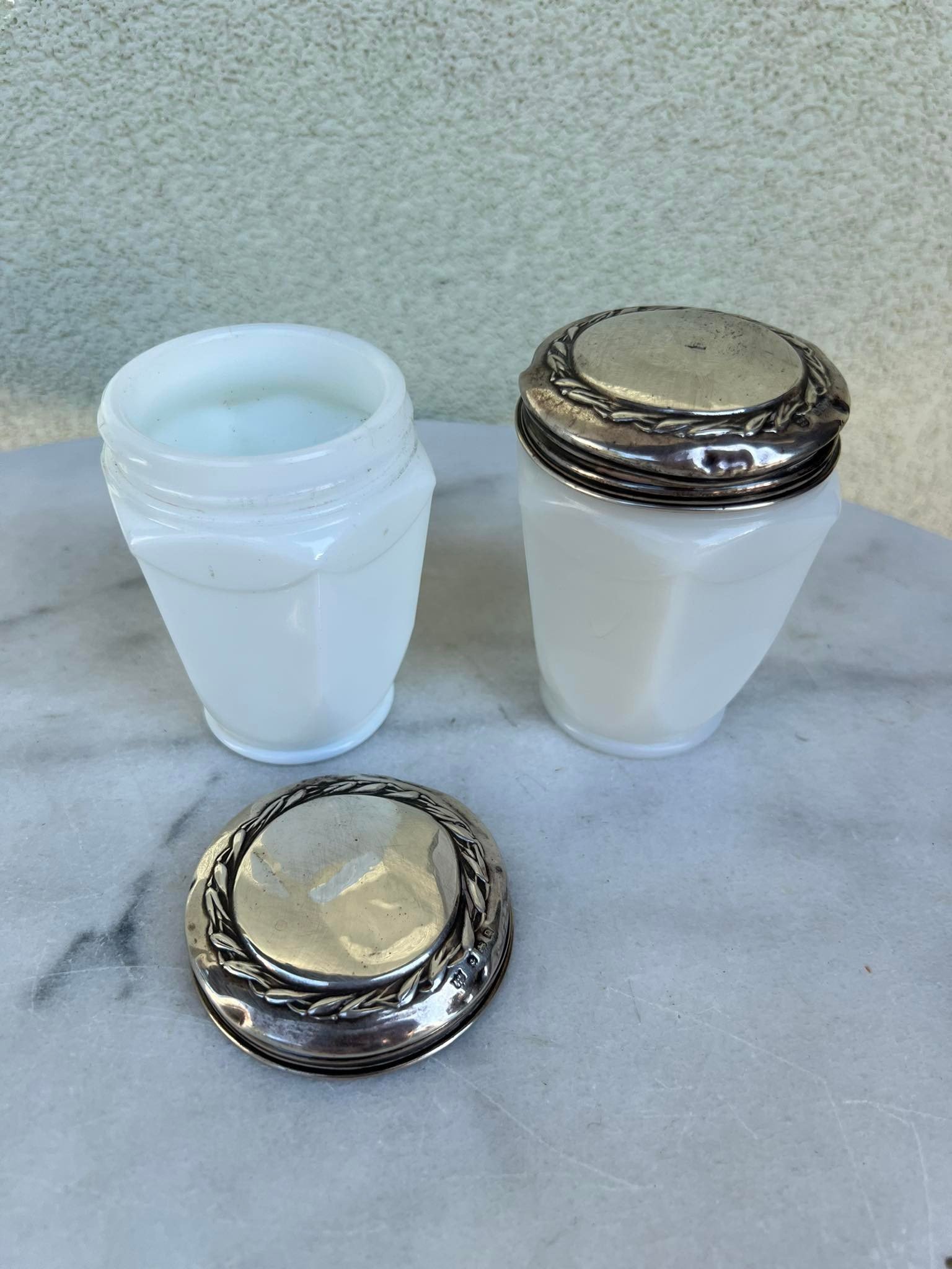 Indai sidbriniais kamščiais antikvariniai, veido kremo OATINE, pieno stiklo. 1927 m. Birmingemas. 2 vnt. Sidabrinių kamščių svoris po 14 g. Kaina po 48