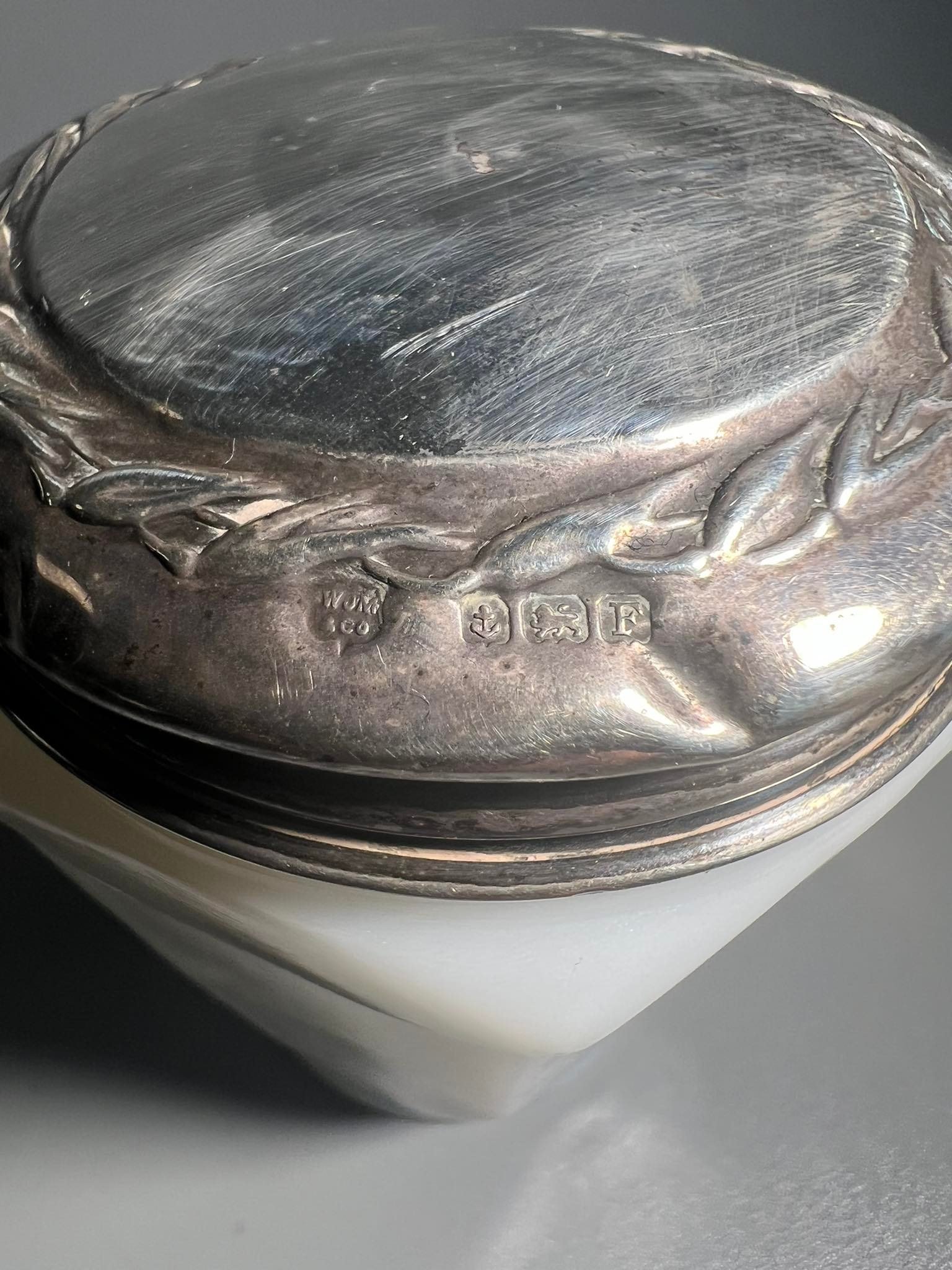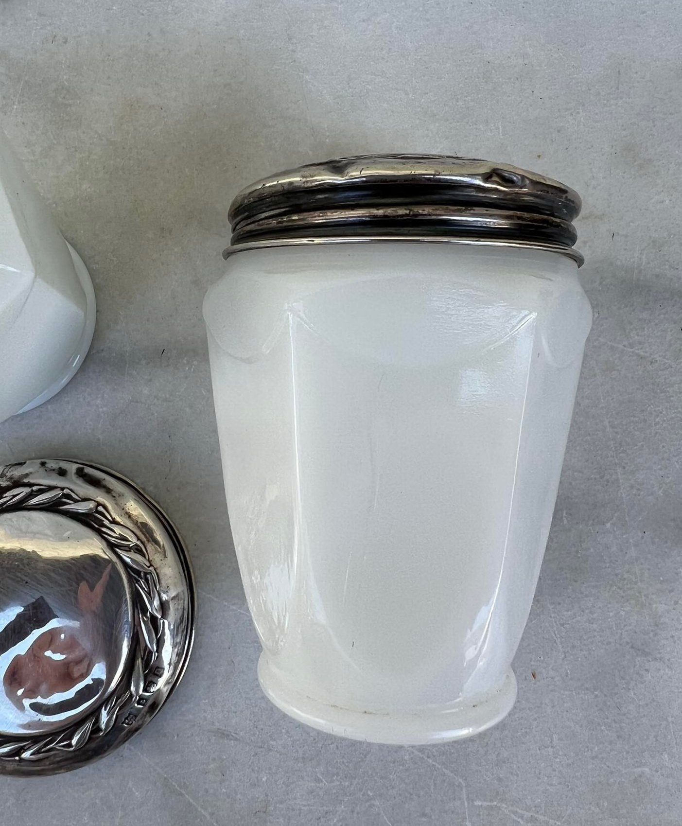 1927 Sterling Silver Screw Topped Milk Glass 6 Sided Oatine Cream Jar. Hallmarked Birmingham 1927 W J Wyatt.