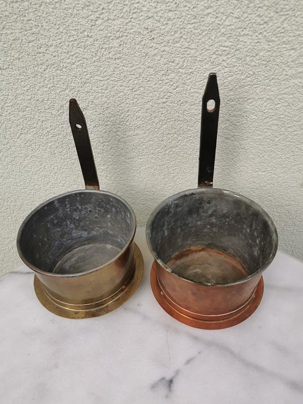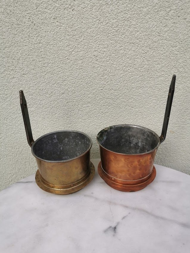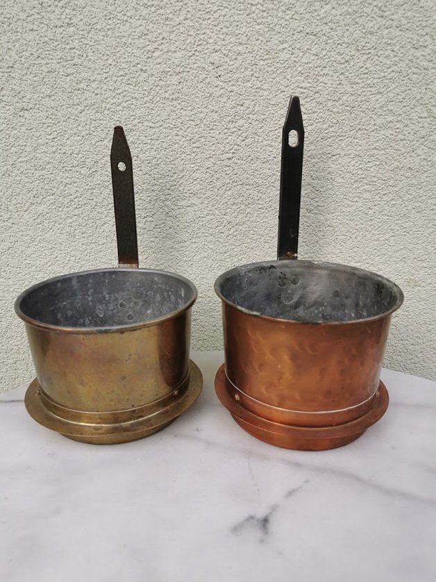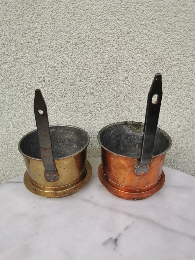 Indai, vazonai žalvariniai, pakabinami. Skersmuo 13, aukštis be rankenos 10, aukštis su rankena 22 cm. Kaina po 33