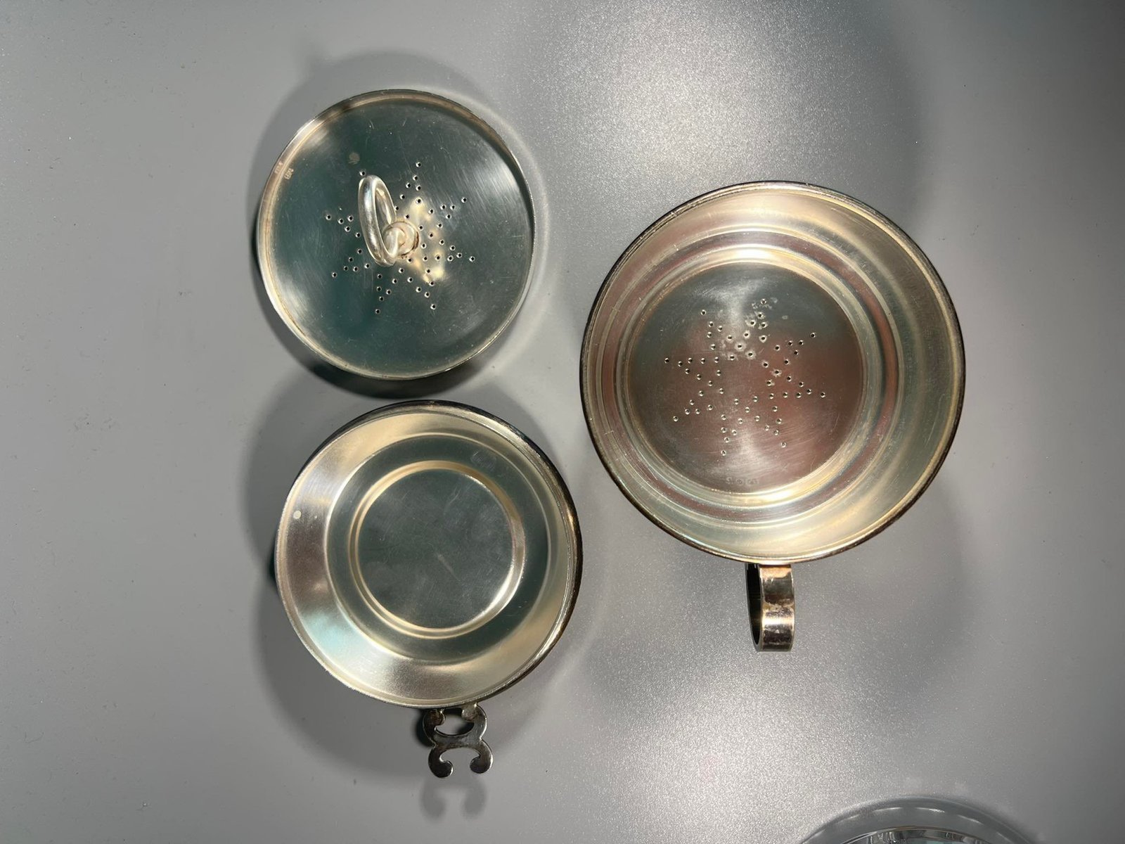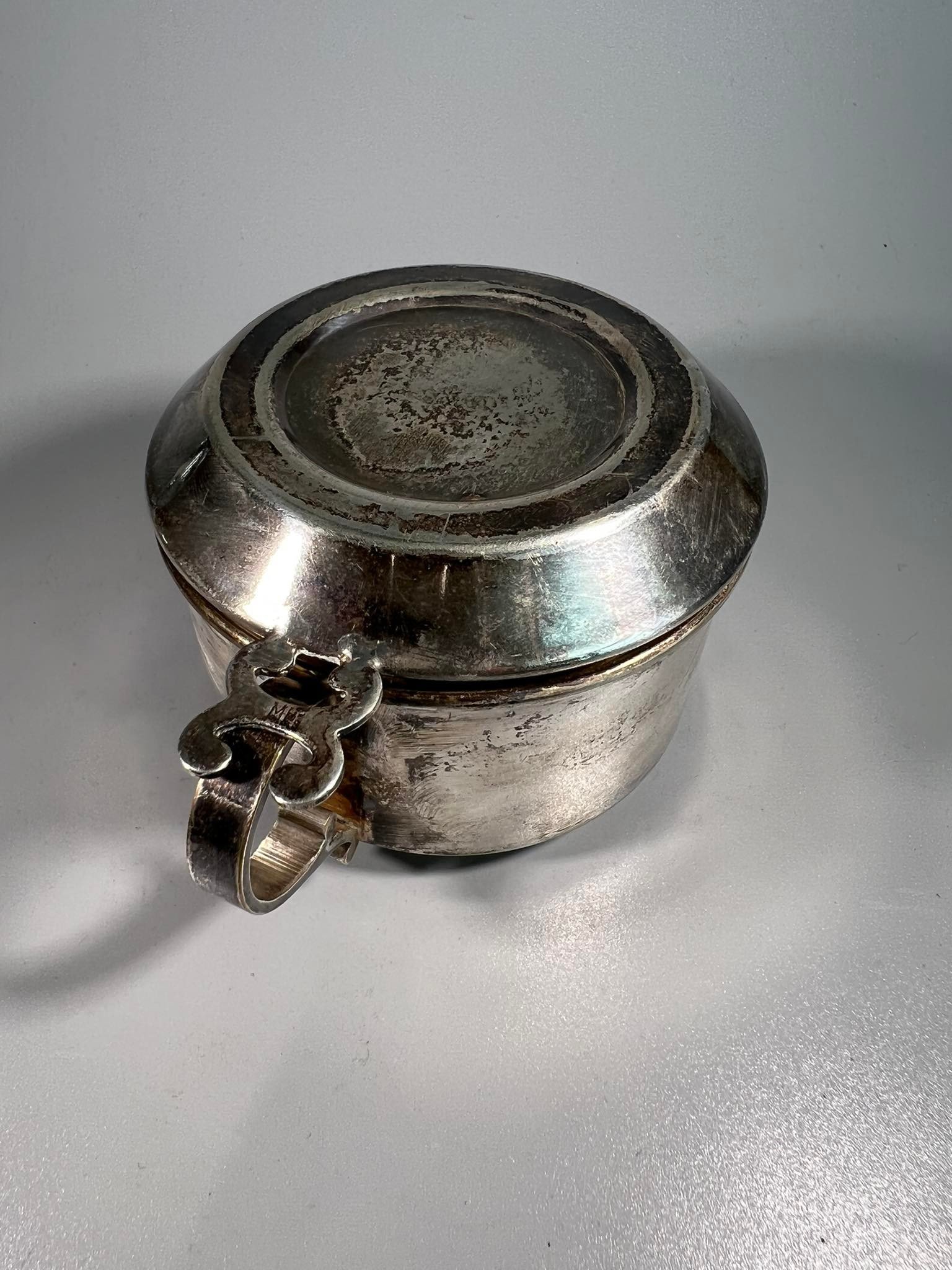 Indas arbatai plikyti sidabruotas, antikvarinis. Aukštis 7, skersmuo be rankenos 9 cm. Kaina 23